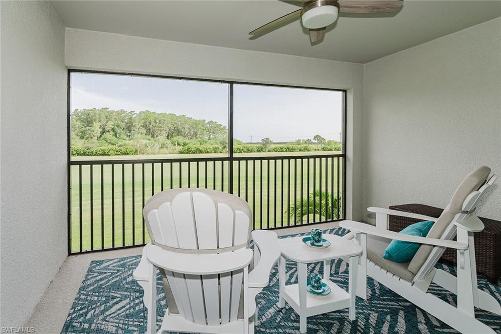 Welcome home to the perfect blend of luxury, comfort, and resort-style living in this rarely available Arabella floorplan—the largest of the Veranda models and a highly desirable end-unit that’s flooded with natural light. This is the only second-floor Arabella in the community featuring tile flooring throughout—no carpet, just clean lines and effortless maintenance. Enjoy the added convenience of a private one-car garage, perfect for storing your vehicle, golf gear, or beach essentials, with direct access for easy entry and extra peace of mind. Thoughtfully designed for full-time living or the ultimate vacation getaway, this spacious and beautifully upgraded condo offers a seamless layout and bundled golf—just $30 per round for your cart on the championship Gordon Lewis-designed course. You’ll love starting your day on the front lanai with a warm cup of coffee, or unwinding in the evening on your back lanai while soaking in peaceful views of the preserve, wildlife and manicured fairways. Inside, the open-concept design features vaulted ceilings and a bright, airy living space perfect for entertaining or relaxing. The split-bedroom floorplan offers privacy, and the versatile den makes a great office, guest room, or flex space to suit your lifestyle. Two full bathrooms and a well-equipped kitchen complete the interior. Beyond your door, enjoy everything The National has to offer—resort-style pool with a lively Tiki bar, tennis, pickleball, bocce ball, a luxurious spa and sauna, a state-of-the-art fitness center, and a brand-new clubhouse with exceptional dining. Located in the heart of Ave Maria, one of the 16th fastest-growing communities in the U.S., you're just a short walk to the amenity center and moments from all the charm this town has to offer. This is more than just a home—it’s your next chapter. Ave Maria ~ Once you get here, you "get it". Some furniture negotiable.
