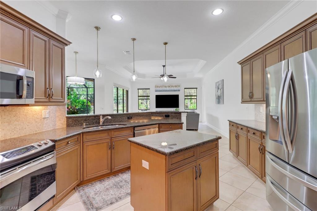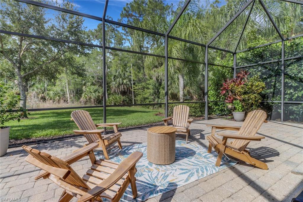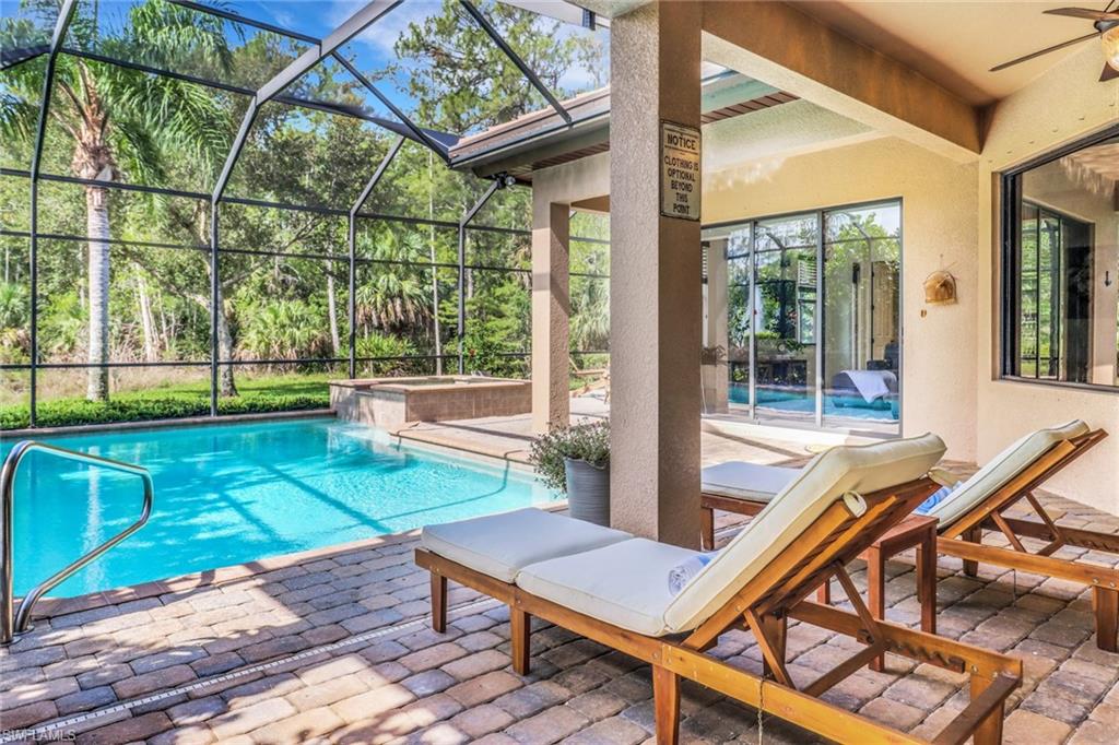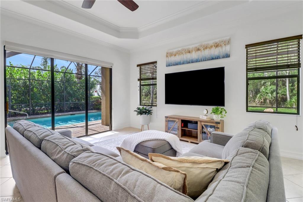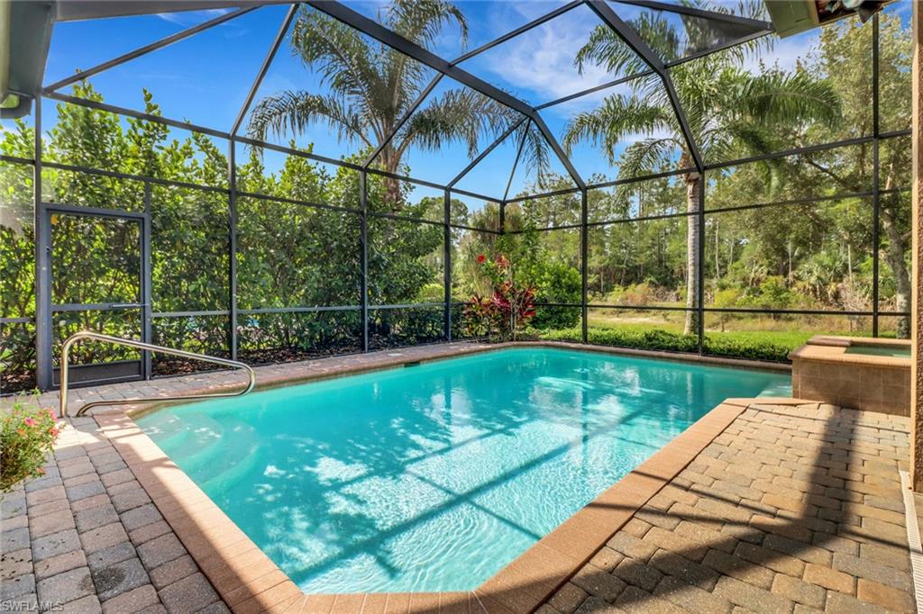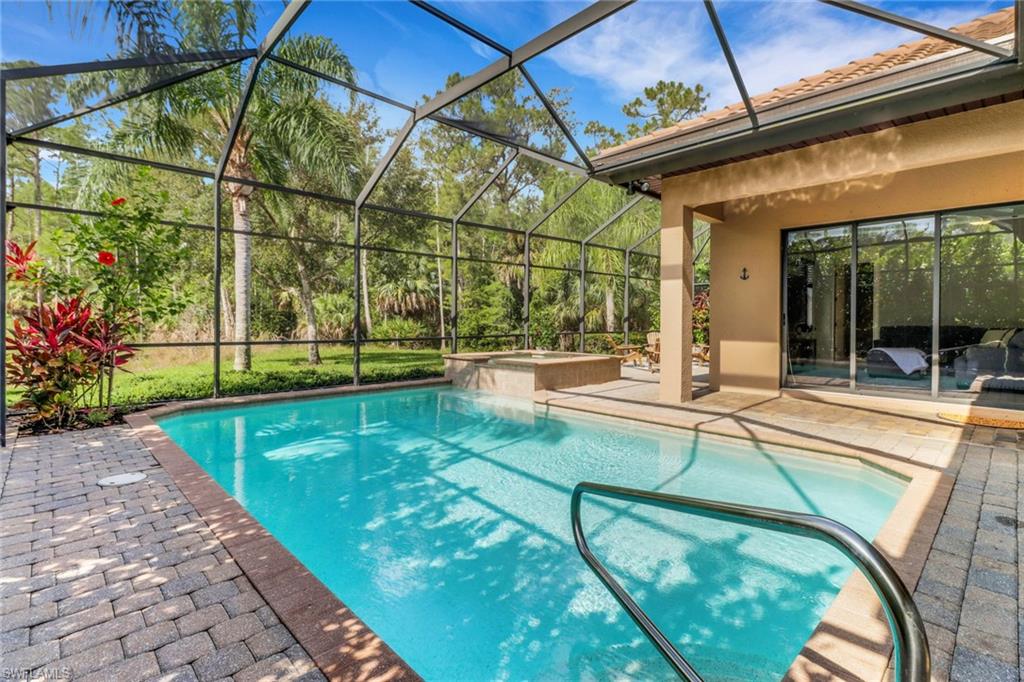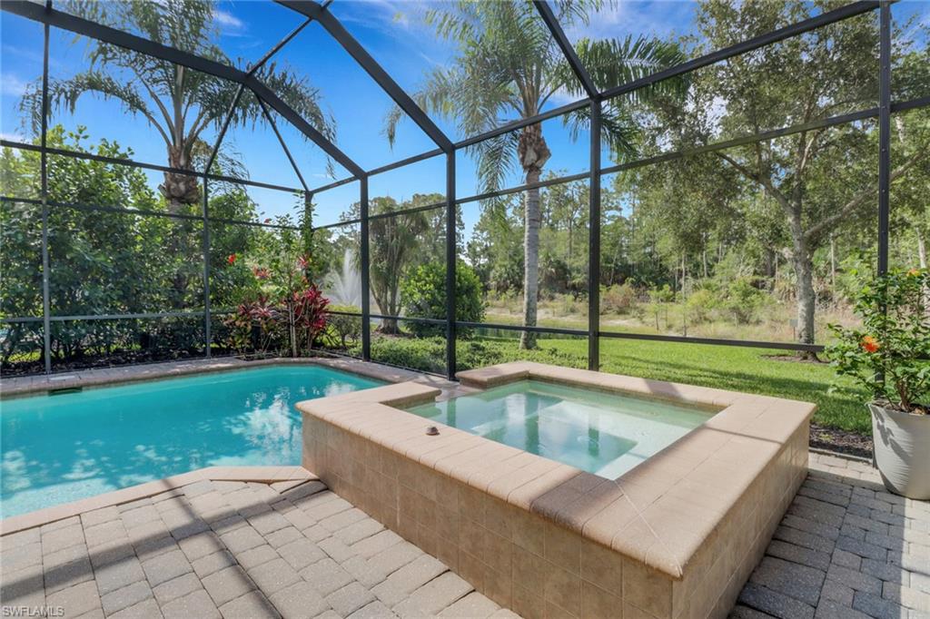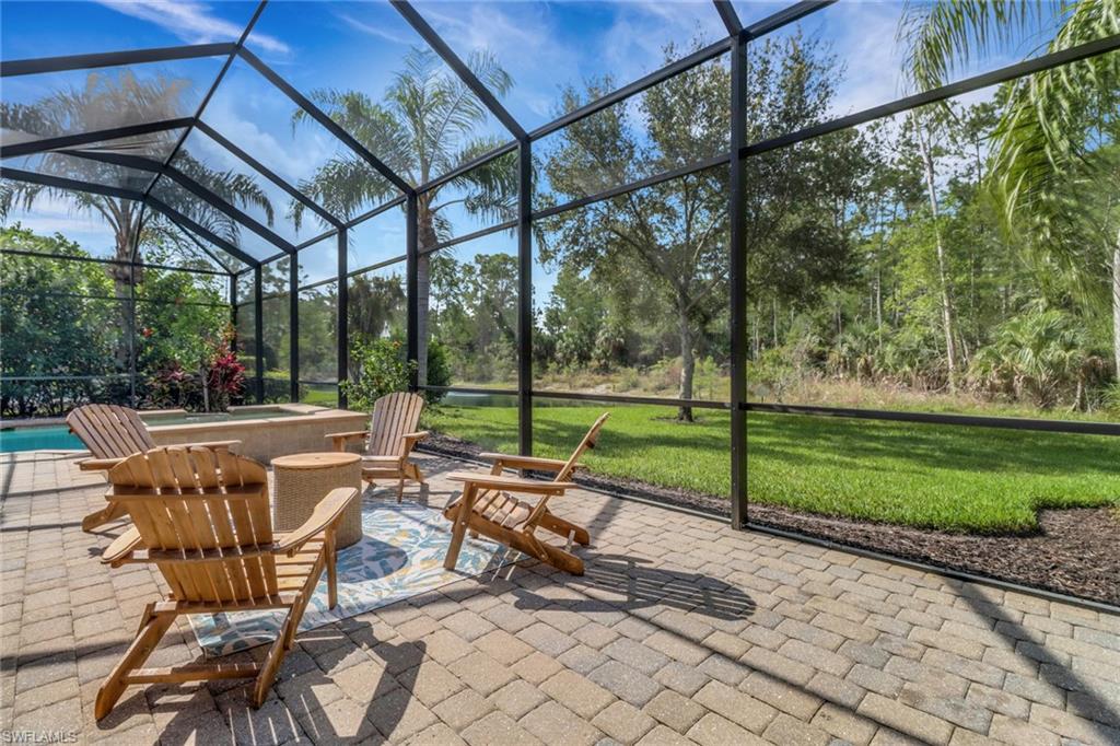 Welcome to 7327 Acorn Way, a beautifully maintained executive home in the highly desirable North Naples community of Black Bear Ridge. This spacious 4-bedroom, 3-bath residence offers a rare blend of luxury, privacy, and convenience within a quiet, gated enclave of just 100 homes. Inside, you’ll find soaring 13-foot ceilings, crown molding, custom faux finishes, and numerous new light fixtures and fans. The open and airy floor plan features light-filled living, dining, and family rooms, along with a dedicated office or den ideal for working from home. The chef’s kitchen is equipped with stainless steel appliances, including a brand-new refrigerator (2025), granite countertops, and 42-inch upper cabinets. A split-bedroom layout ensures comfort and privacy, with a guest suite tucked away in the rear corner offering its own full bathroom with a glass-enclosed shower and lanai access—perfect for visitors or multigenerational living. The oversized, extended screened lanai is a true outdoor retreat, offering exceptional privacy and tranquil views of a lush preserve, peaceful pond, and fountain. The heated saltwater pool and spa, along with a wall-mount for a TV and four access points from the home—including from the master bedroom—make this the ultimate space to relax and enjoy the Florida lifestyle. The spacious master suite features two walk-in closets and a luxurious en-suite bath with dual vanities, a soaking tub, and a large walk-in shower. Additional highlights include a two-zone air conditioning system with a dedicated unit for the master suite, tall garage ceilings that allow for overhead storage, incredibly low insurance costs with no flood insurance required, and a pet-friendly policy allowing dogs of any size. Black Bear Ridge residents enjoy access to a clubhouse with pool, fitness center, social room, and playground, just steps from your front door—perfect for guest parking and entertaining. The community’s prime location allows you to walk to nearby restaurants, bars, a grocery store, and a bank, all while being zoned for top-rated North Naples schools. This home truly has it all—luxury finishes, an unbeatable location, and unmatched lifestyle benefits.
