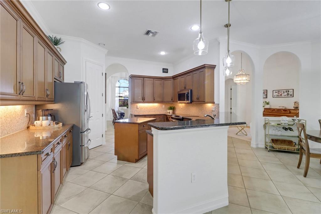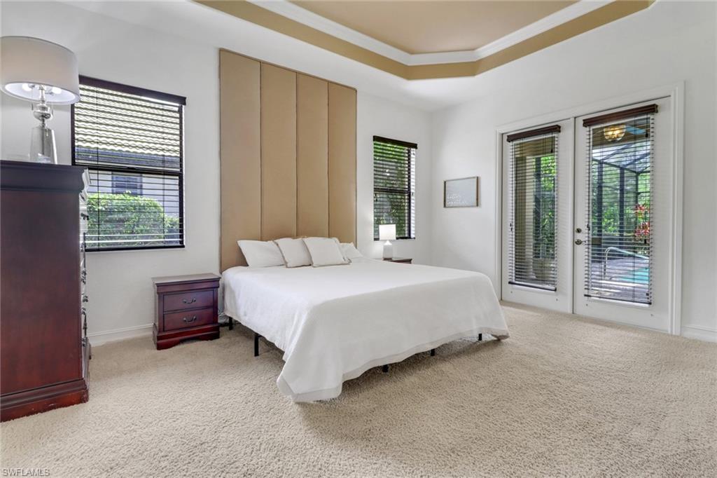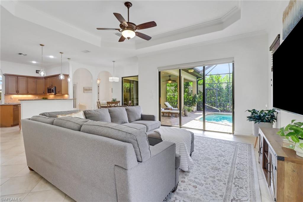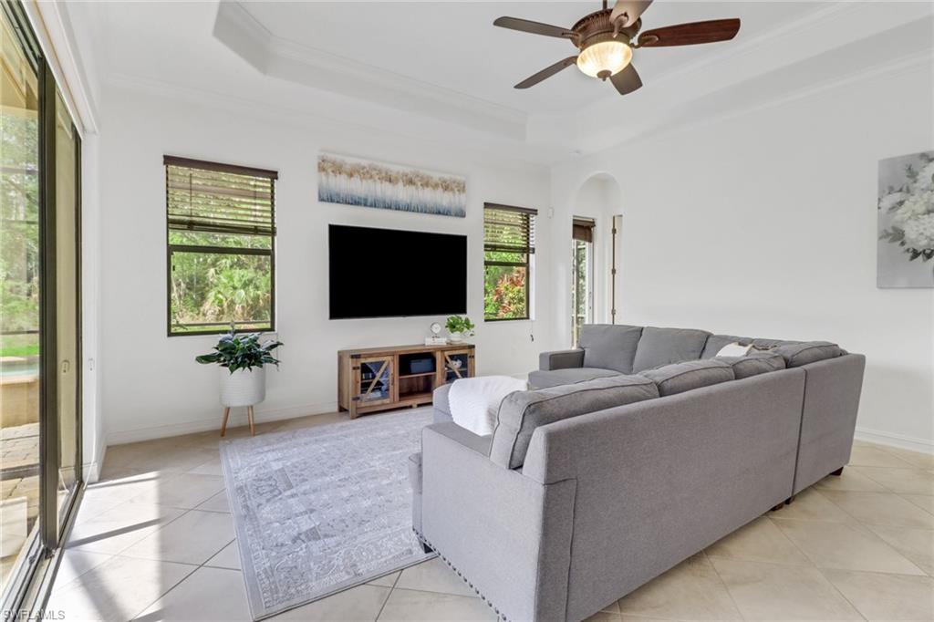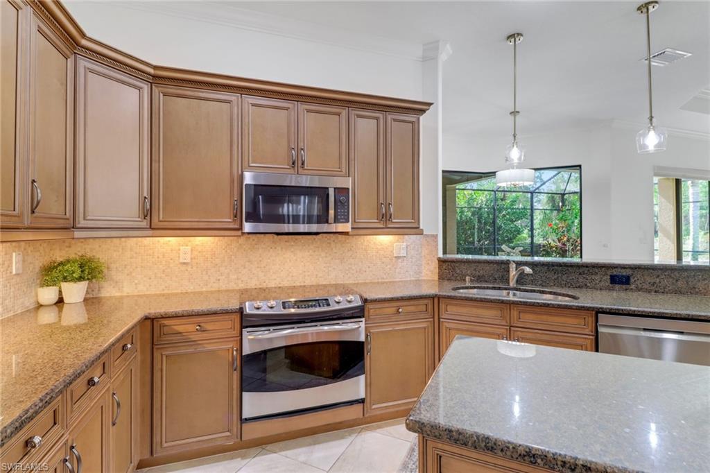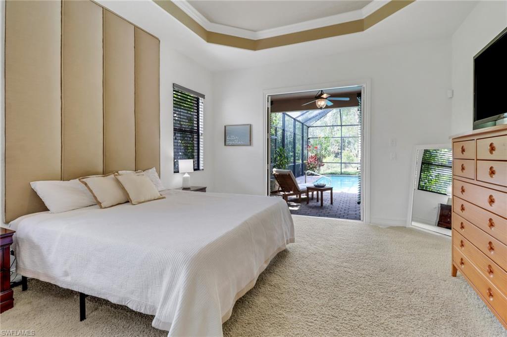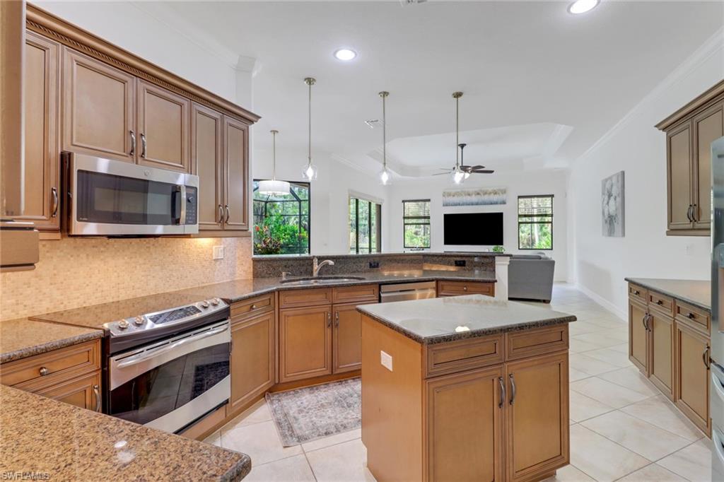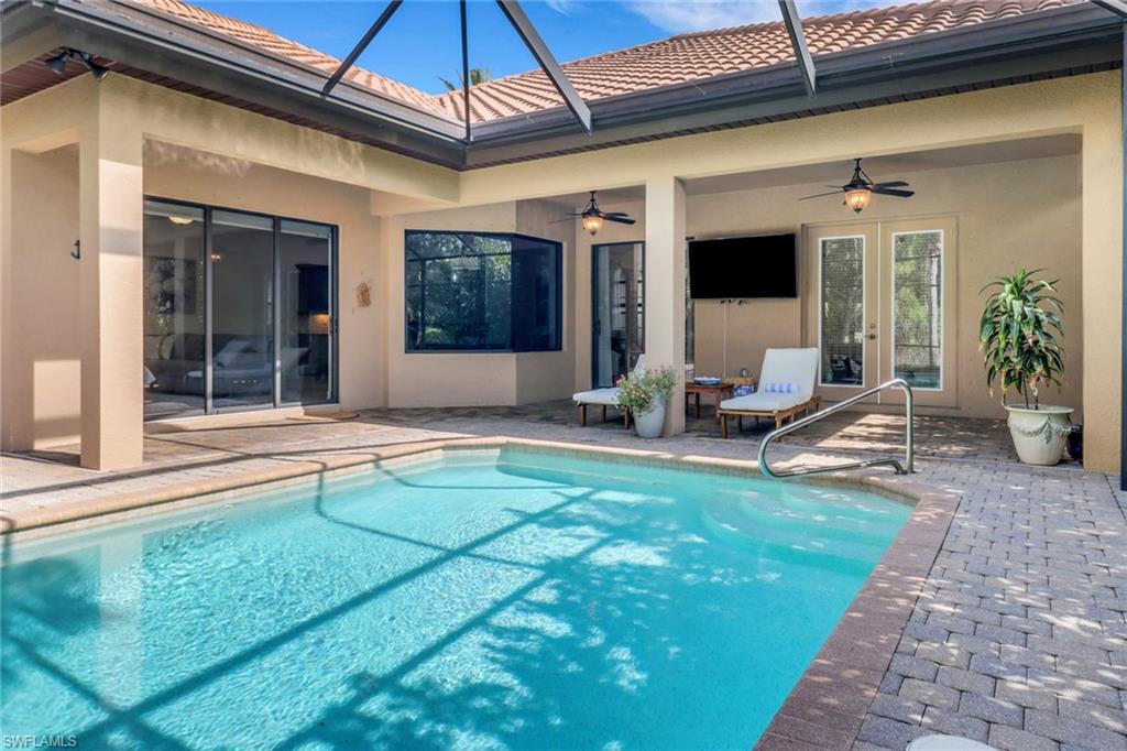 Welcome to 7327 Acorn Way, a beautifully maintained executive home in the highly desirable North Naples community of Black Bear Ridge. This spacious 4-bedroom, 3-bath residence offers a rare blend of luxury, privacy, and convenience within a quiet, gated enclave of just 100 homes. Inside, you’ll find soaring 13-foot ceilings, crown molding, custom faux finishes, and numerous new light fixtures and fans. The open and airy floor plan features light-filled living, dining, and family rooms, along with a dedicated office or den ideal for working from home. The chef’s kitchen is equipped with stainless steel appliances, including a brand-new refrigerator (2025), granite countertops, and 42-inch upper cabinets. A split-bedroom layout ensures comfort and privacy, with a guest suite tucked away in the rear corner offering its own full bathroom with a glass-enclosed shower and lanai access—perfect for visitors or multigenerational living. The oversized, extended screened lanai is a true outdoor retreat, offering exceptional privacy and tranquil views of a lush preserve, peaceful pond, and fountain. The heated saltwater pool and spa, along with a wall-mount for a TV and four access points from the home—including from the master bedroom—make this the ultimate space to relax and enjoy the Florida lifestyle. The spacious master suite features two walk-in closets and a luxurious en-suite bath with dual vanities, a soaking tub, and a large walk-in shower. Additional highlights include a two-zone air conditioning system with a dedicated unit for the master suite, tall garage ceilings that allow for overhead storage, incredibly low insurance costs with no flood insurance required, and a pet-friendly policy allowing dogs of any size. Black Bear Ridge residents enjoy access to a clubhouse with pool, fitness center, social room, and playground, just steps from your front door—perfect for guest parking and entertaining. The community’s prime location allows you to walk to nearby restaurants, bars, a grocery store, and a bank, all while being zoned for top-rated North Naples schools. This home truly has it all—luxury finishes, an unbeatable location, and unmatched lifestyle benefits.