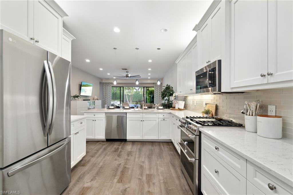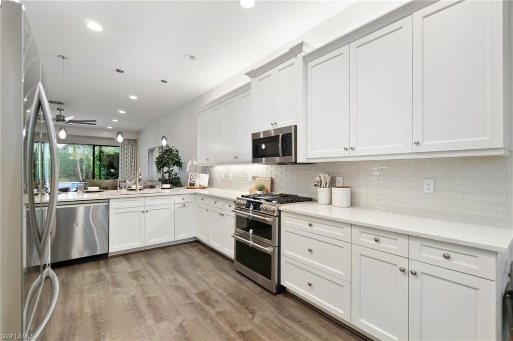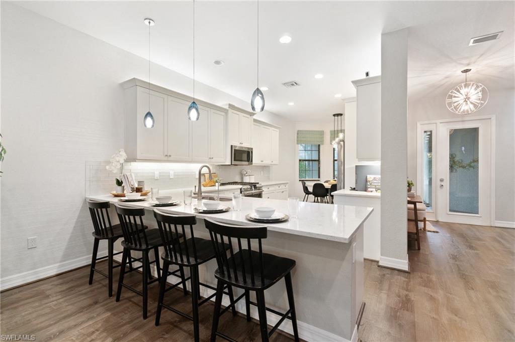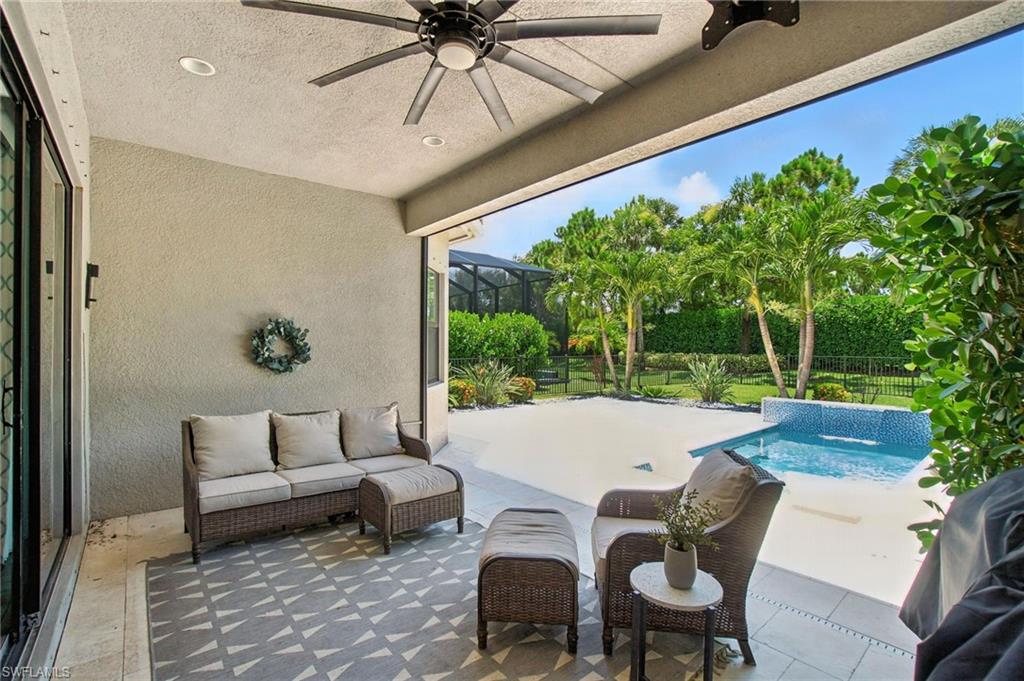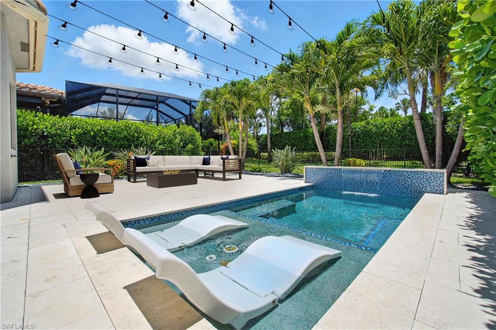 This stunning, move-in-ready home offers the perfect blend of style, function, and comfort. Located on a quiet cul-de-sac, the home welcomes you with an open-concept floor plan featuring luxury vinyl plank flooring on the main level and a chef’s kitchen complete with granite countertops, a Café Series gas stove and double oven, upgraded backsplash, and a reverse osmosis system. The first-floor primary suite provides an elegant retreat with two custom walk-in closets and a spa-like bath featuring a rain-head shower. Upstairs, a versatile loft-style living area and three additional bedrooms—including one en suite—offer generous space for guests, family, a home office, or hobbies. The home is ideally located just a short walk to the community center and near the gate for convenient access. Toward the back of the property, the outdoor living experience is elevated by a large travertine deck and spa-plunge pool with a waterfall feature. This highly versatile water feature can be enjoyed as a refreshing plunge pool or heated to function as a spa, comfortably seating up to 7 people. Its thoughtful, space-saving design preserves room for outdoor dining, a firepit entertainment area, and an oversized fenced yard—a rare advantage ideal for pets, play, and gatherings. With thoughtful upgrades, flexible living spaces, and an outdoor retreat designed for both relaxation and entertaining, this home truly stands out. Stonecreek is one of North Naples’ most desirable guard-gated communities, located minutes from world-class beaches, top-rated schools, and favorites like Seed to Table. Residents enjoy resort-style amenities including a clubhouse with an indoor sports court, fully equipped gym, beach volleyball, tennis, pickleball, lap and resort-style pools, a splash pad, shaded playground, and community events for all ages. Some photos include reality renovation/reality staging. This property also includes interior design services, making furnishing—just as shown—easy for your buyer.