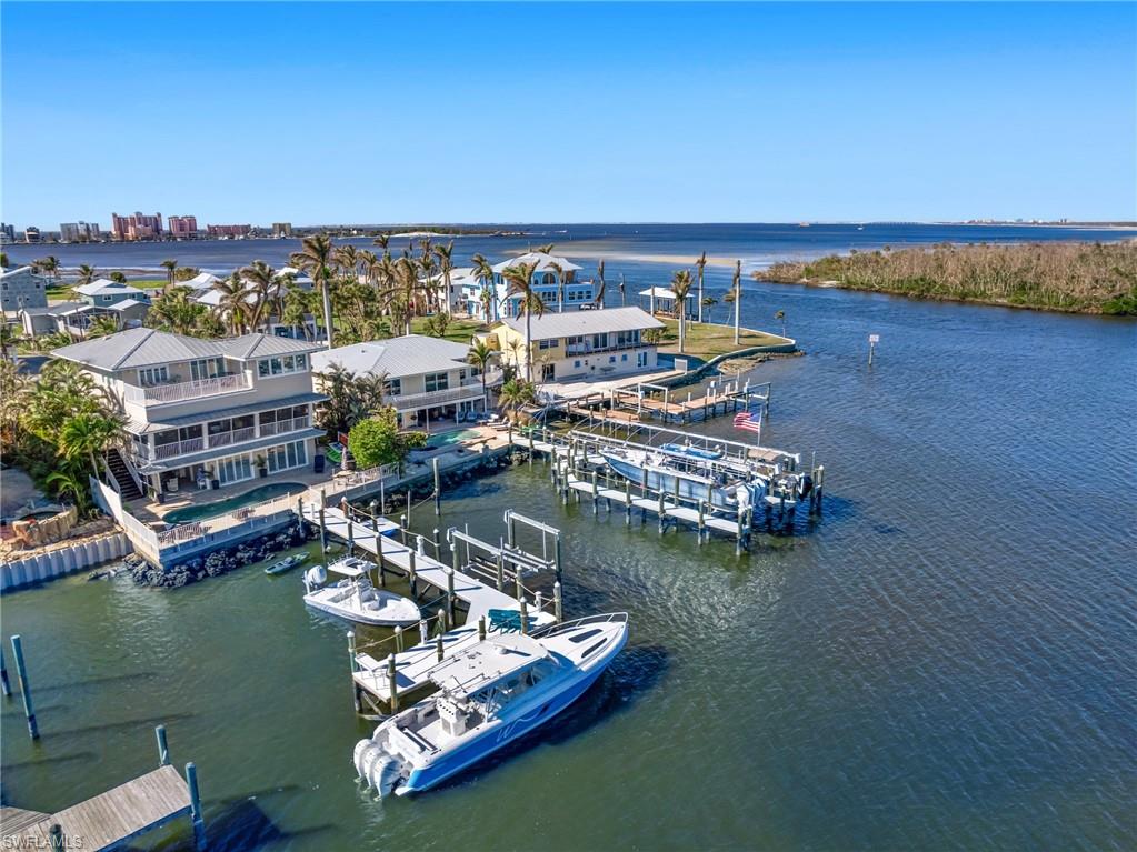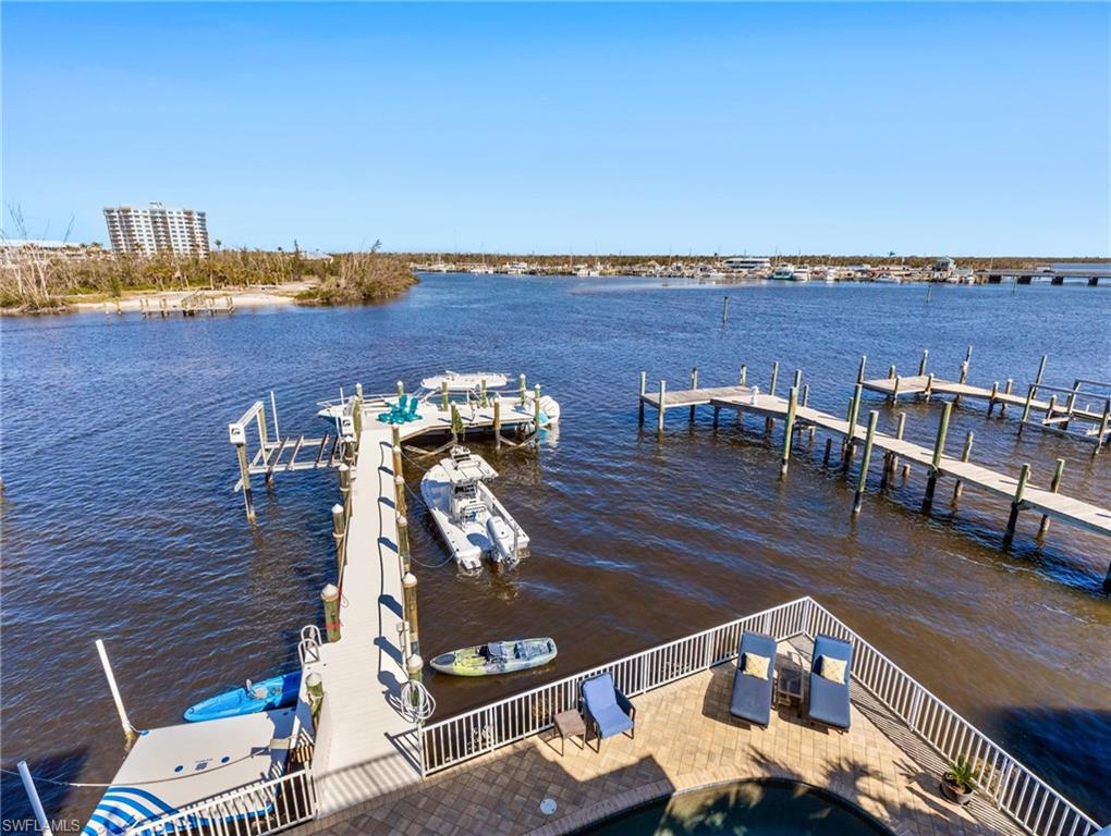 This stunning 3-story waterfront home at Fort Myers Beach, Florida, offers an exceptional blend of luxury and coastal living. Situated on San Carlos Island and overlooking Pelican Bay, it boasts deep water dockage for easy access to the Gulf of Mexico. The home features 4 spacious bedrooms and 4 well-appointed bathrooms (3 are en suite), providing plenty of room for family and guests. The chef's kitchen is a culinary dream, equipped with high-end appliances such as the JennAir double refrigerator and Wolf range and double wall ovens. Finished in custom cabinetry and granite counters, there’s ample counter space, perfect for preparing gourmet meals. The expansive Great Room offers a perfect place for entertaining, with a seamless transition to a screened Lanai that overlooks the pool deck, docks, and water. Enjoy the breathtaking views and gentle breezes in this peaceful outdoor space as you watch dolphin, manatees, and waterfowl playing right before your eyes. The third floor is dedicated to a private Primary Suite offering a luxurious retreat complete with its own balcony and a Study with panoramic views for relaxation or work. Step outside to a beautiful pool area, ideal for soaking up the sun or enjoying evening swims. The breezeway has been turned into additional outdoor living space, featuring a hot tub for relaxation and a dining table for alfresco meals. Also on the ground floor is an apartment with separate access and its own Living Room, Bedroom, and Bath – perfect for guests or extended family. A whole house generator and impact resistant doors provide peace of mind. The home is an easy bike ride or brisk walk to Fort Myers Beach, and a quick boat ride to a variety of waterfront restaurants. Located just north of the bridge for easier access to all of the other great attractions in the Fort Myers area. With its prime location, deep-water dockage, and luxurious design, this home is the epitome of Florida waterfront living.