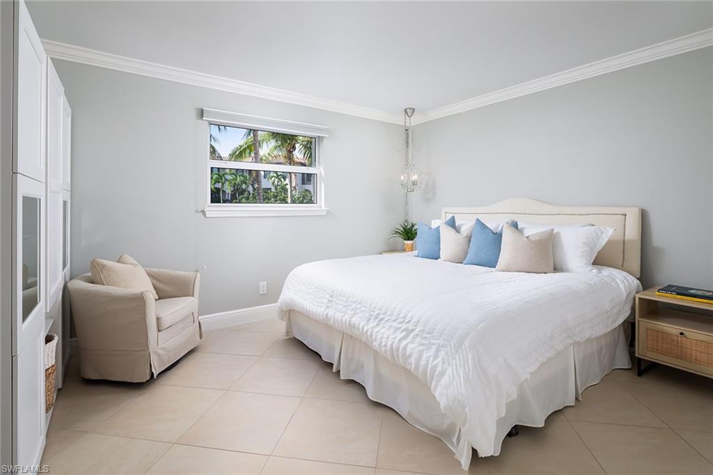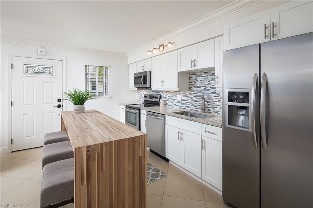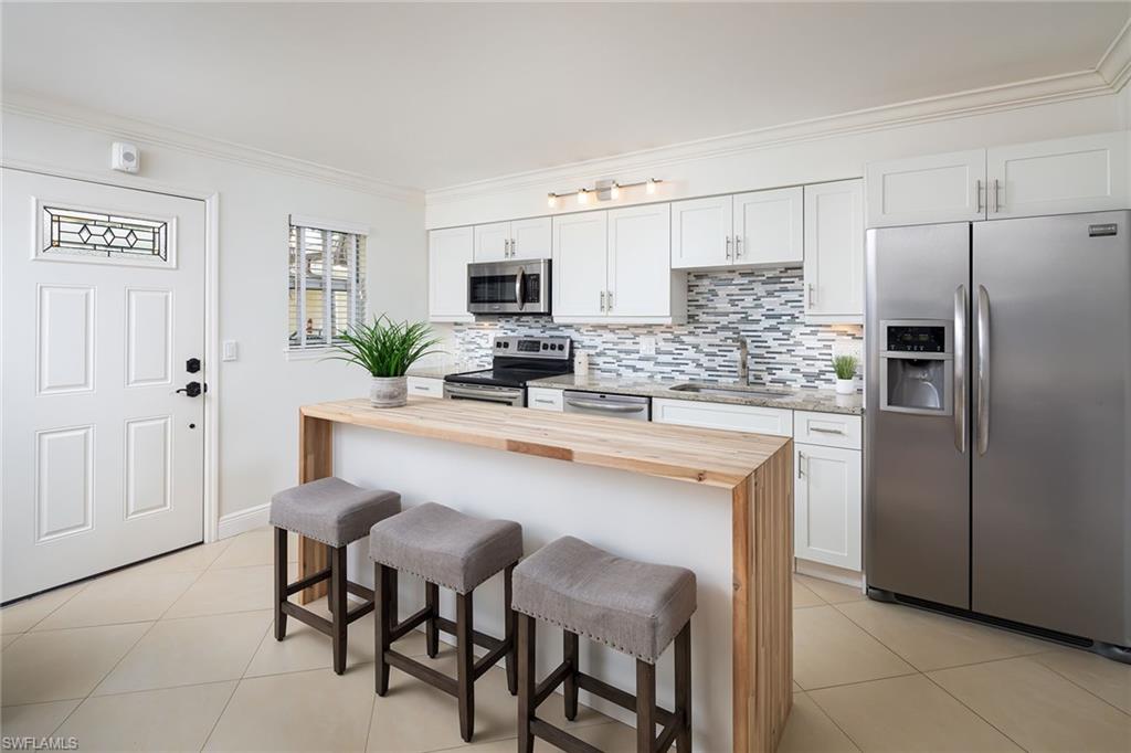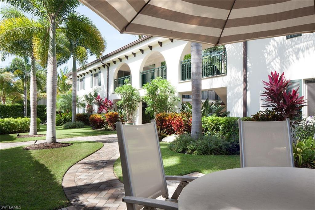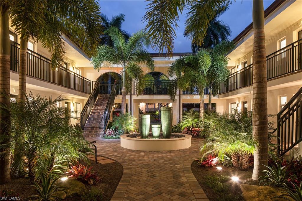 Light, bright and airy second-floor residence with gorgeous park-like views. Coastal backgrounds include crown and base molding, crisp white cabinetry, and neutral tile throughout. Well-planned kitchen includes glass tile backsplash, and a newly installed butcher block breakfast bar with storage and stainless steel appliances. New Whirlpool stackable washer and dryer are tucked away for added convenience. Charming setting with lush tropical landscape and soothing water feature off the main entry. Close to Cambier Park for art fairs, tennis and community fun events and the taste-tempting cafes and restaurants of Fifth Avenue South and Third Street South. This fantastic location is just blocks from the sandy beaches of the Gulf of Mexico.