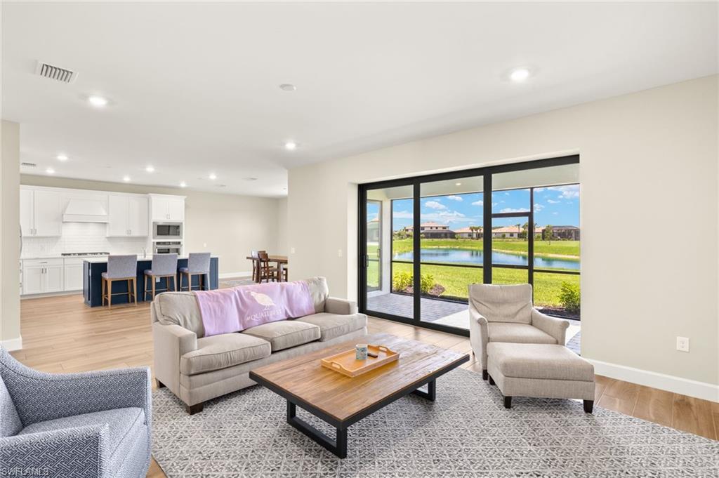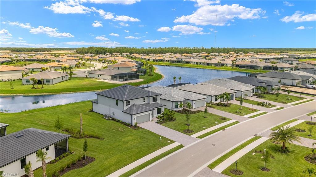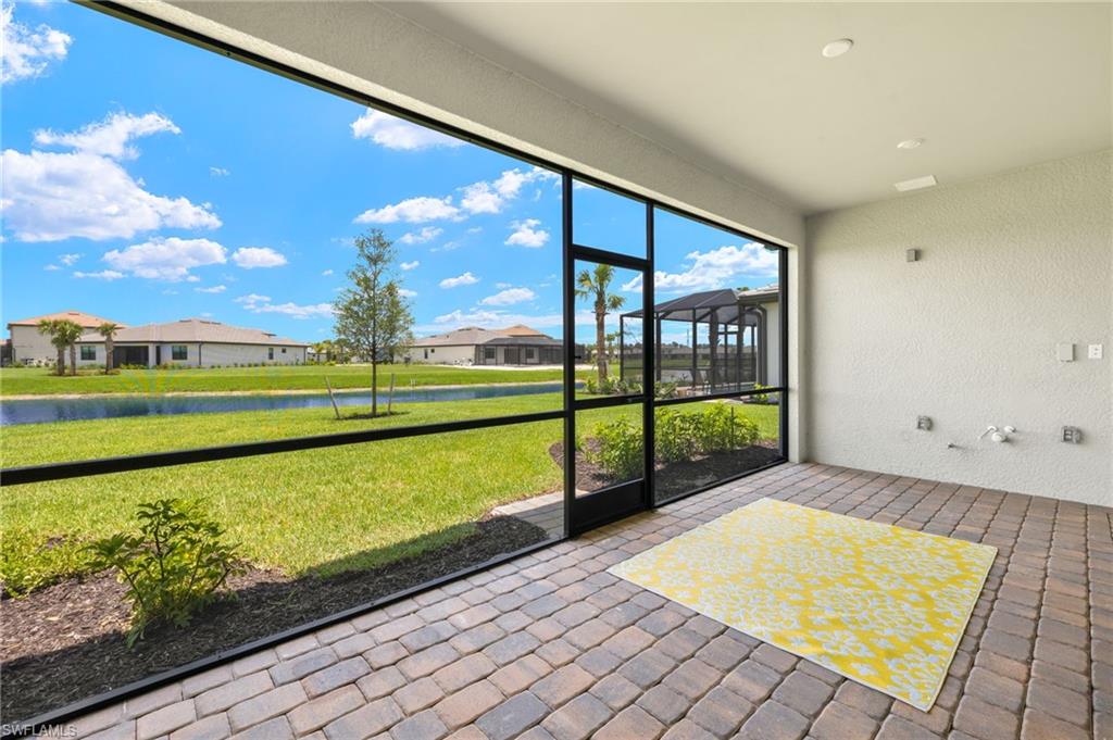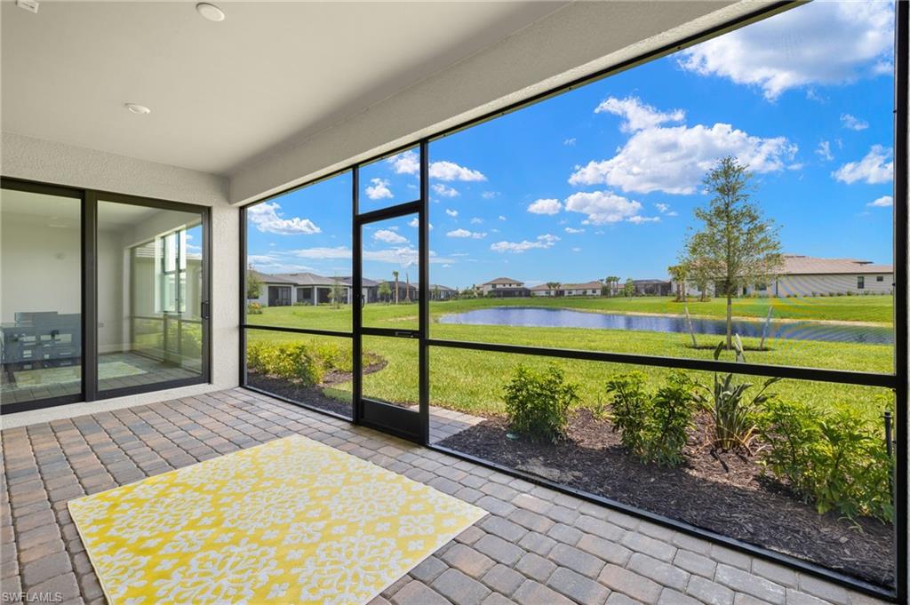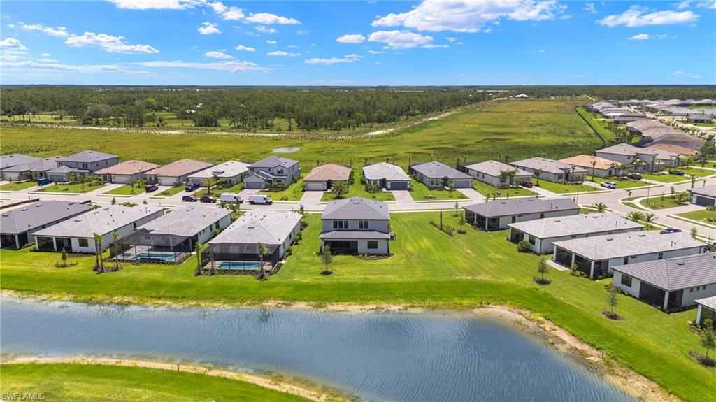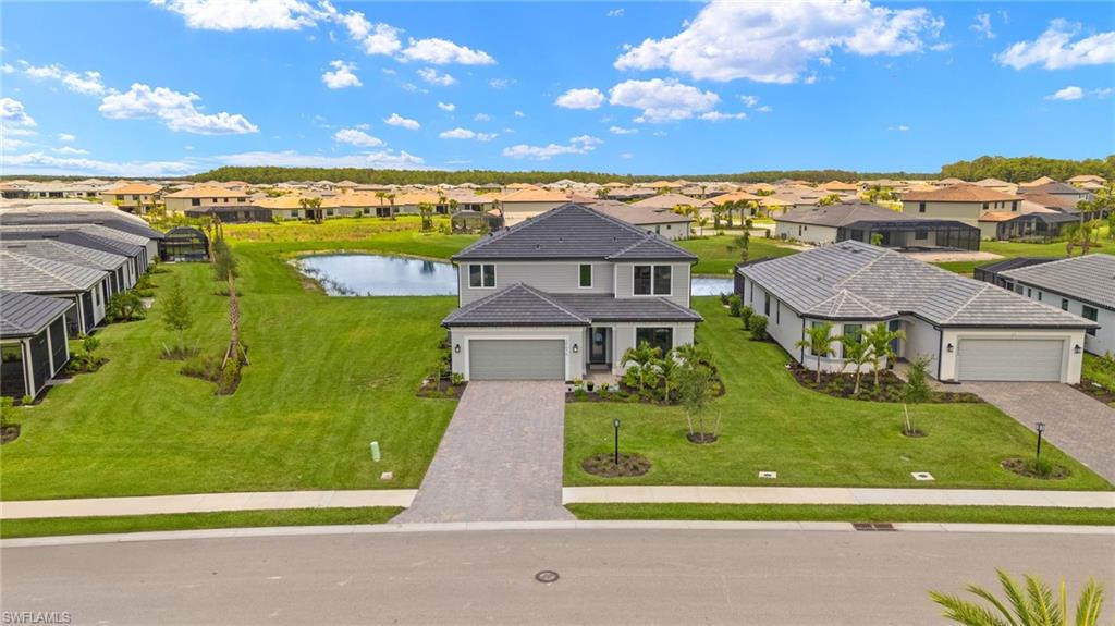 Why Wait to Build? A unique opportunity to own this home that is LESS THAN 1 YEAR OLD & still under builder warranty! Introducing the highly sought-after Yorkshire plan, a two-story residence boasting over 3,400 square feet of living space, ensuring ample room for all occupants and guests; plus a 3-Car garage and waterfront! The main floor features a full office with elegant French doors, plus a bedroom complete with an en suite bathroom and walk-in closet. The kitchen is equipped with a built-in gas cook-top, upgraded refrigerator, wall oven, microwave, custom cabinetry, and a spacious island that seamlessly connects to the gathering room and café. Pocketing sliding glass doors lead to a covered lanai, pre-plumbed water, electric & gas for an outdoor kitchen and offering picturesque views of the lake, along with ample space for a pool. Head to the second floor, where you will discover a loft/media room, a generously-sized master suite featuring an oversized walk-in shower, and three additional bedrooms, each with walk-in closets. One of these bedrooms includes its own private en suite bath, making it ideal for a second master suite. The laundry room is conveniently located on the second floor, close to the bedrooms. The garage accommodates three cars in tandem, providing extra storage space for a golf cart, motorcycle, or other recreational vehicles; plus an extra long paver driveway. Enjoy tranquil lake views and breathtaking sunrises from the backyard, complemented by western exposure in the front for delightful evening sunset. Verdana Village offers a unique amenity center that includes a resort-style pool and spa, bistro café, restaurant, state-of-the-art fitness center, indoor and outdoor pickleball courts, tennis courts, and an indoor basketball court with a scoreboard, and much more! Conveniently situated near I-75 and RSW International Airport, the residence is within close proximity to the newest 2-story Publix shopping concept just outside the gates of Verdana. Enjoy easy access to shopping, dining, and entertainment, with beautiful Southwest Florida beaches just a short drive away. This residence is a One-of-a-Kind Luxury and is MOVE-IN READY! NO FLOOD ZONE!