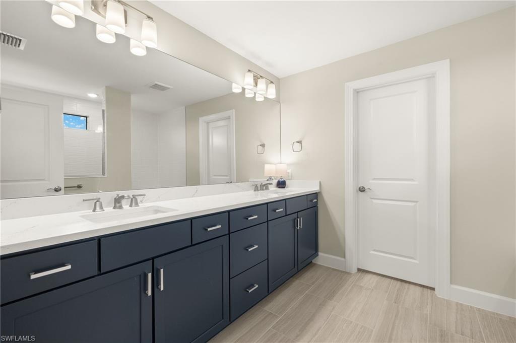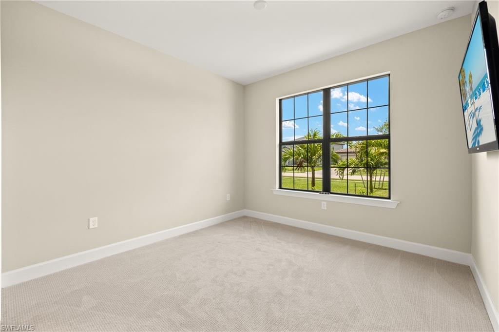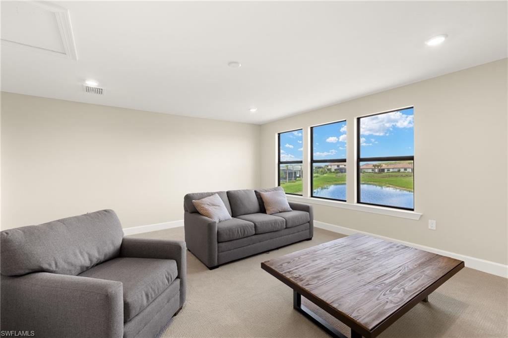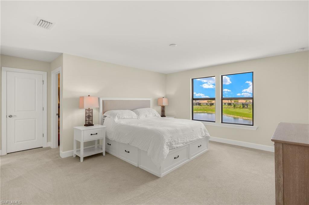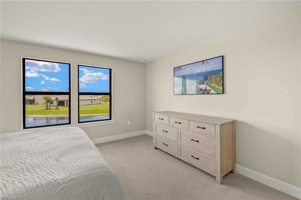 Why Wait to Build? A unique opportunity to own this home that is LESS THAN 1 YEAR OLD & still under builder warranty! Introducing the highly sought-after Yorkshire plan, a two-story residence boasting over 3,400 square feet of living space, ensuring ample room for all occupants and guests; plus a 3-Car garage and waterfront! The main floor features a full office with elegant French doors, plus a bedroom complete with an en suite bathroom and walk-in closet. The kitchen is equipped with a built-in gas cook-top, upgraded refrigerator, wall oven, microwave, custom cabinetry, and a spacious island that seamlessly connects to the gathering room and café. Pocketing sliding glass doors lead to a covered lanai, pre-plumbed water, electric & gas for an outdoor kitchen and offering picturesque views of the lake, along with ample space for a pool. Head to the second floor, where you will discover a loft/media room, a generously-sized master suite featuring an oversized walk-in shower, and three additional bedrooms, each with walk-in closets. One of these bedrooms includes its own private en suite bath, making it ideal for a second master suite. The laundry room is conveniently located on the second floor, close to the bedrooms. The garage accommodates three cars in tandem, providing extra storage space for a golf cart, motorcycle, or other recreational vehicles; plus an extra long paver driveway. Enjoy tranquil lake views and breathtaking sunrises from the backyard, complemented by western exposure in the front for delightful evening sunset. Verdana Village offers a unique amenity center that includes a resort-style pool and spa, bistro café, restaurant, state-of-the-art fitness center, indoor and outdoor pickleball courts, tennis courts, and an indoor basketball court with a scoreboard, and much more! Conveniently situated near I-75 and RSW International Airport, the residence is within close proximity to the newest 2-story Publix shopping concept just outside the gates of Verdana. Enjoy easy access to shopping, dining, and entertainment, with beautiful Southwest Florida beaches just a short drive away. This residence is a One-of-a-Kind Luxury and is MOVE-IN READY! NO FLOOD ZONE!
