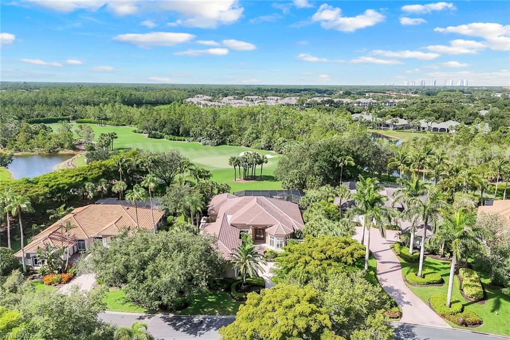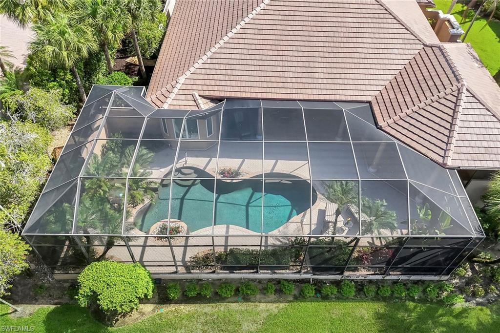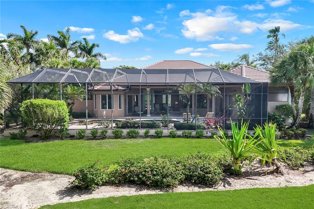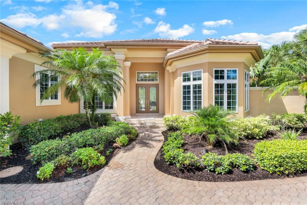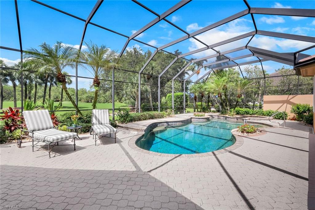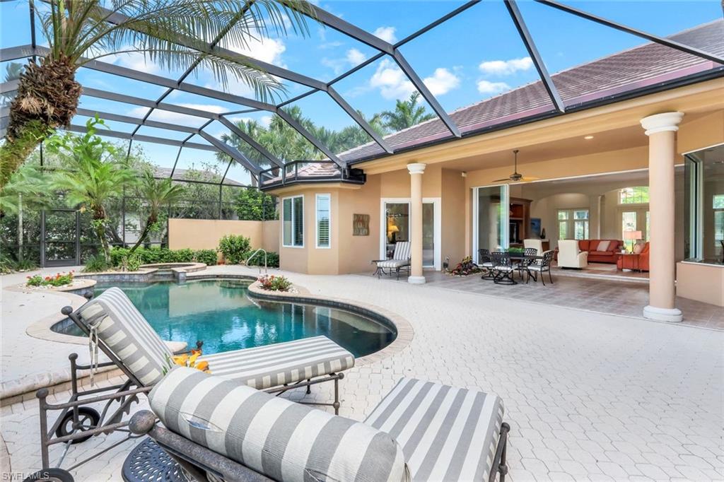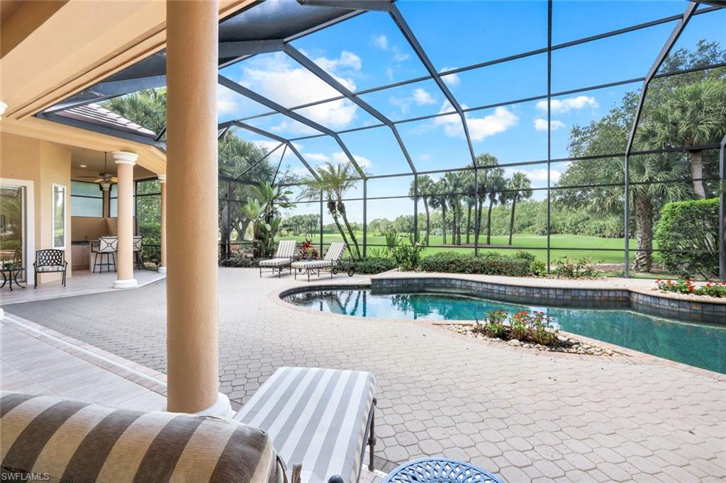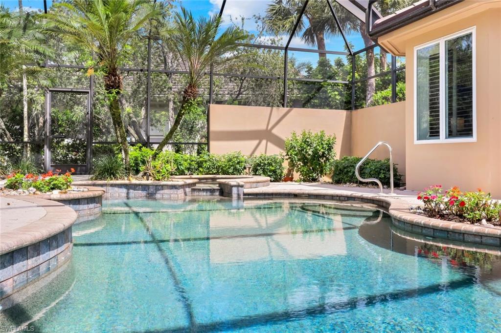 Immerse yourself in the ultimate expression of luxury living at this extraordinary estate home, perfectly nestled within the prestigious gated community of Shadow Wood at The Brooks. The unique great room design is a standout feature in Shadow Wood, creating a seamless flow between the kitchen, breakfast area, casual dining space, and expansive great room. This thoughtful layout fosters an inviting atmosphere where family and friends can gather and create lasting memories together. This magnificent home boasts two generously sized guest suites. One guest suite opens to a charming private courtyard, ideal for enjoying fresh air and sunshine, while the second provides direct access to the stunning lanai, where you can take a refreshing morning swim in the sparkling pool. The oversized homesite offers an incredible vantage point with tranquil views of the 17th hole on the South Golf Course, making every moment spent outdoors feel like a retreat. Step outside onto the expansive lanai, where you can relax in the luxurious pool and rejuvenate in the spa, surrounded by the peaceful sounds of nature. The beautifully landscaped private courtyards adjacent to the master bathroom provide an oasis of serenity. At the same time, the kitchen showcases a breathtaking wall of windows that frames picturesque views of lush gardens and a soothing water fountain. This recently painted home is adorned with elegant plantation shutters, stylish ceramic tile floors, and impressive 10-foot sliding glass doors that invite abundant natural light. The coffered and tray ceilings add a touch of sophistication. Recent updates include a brand-new roof installed in 2024, a modernized water heater, and two state-of-the-art HVAC systems, ensuring comfort and efficiency year-round. For those seeking an active lifestyle, optional membership provides access to three championship golf courses, a luxurious beach club, exquisite dining options, tennis and pickleball courts, a well-equipped fitness center, scenic walking trails, vibrant social activities, and a stunning resort-style pool. The prime location, just moments away from Coconut Point Mall, medical facilities, and the I-75 corridor, enhances the property's desirability and convenience. This exceptional home truly embodies a rare combination of elegance, sophistication, and tranquil beauty, offering a lifestyle that is simply unparalleled.