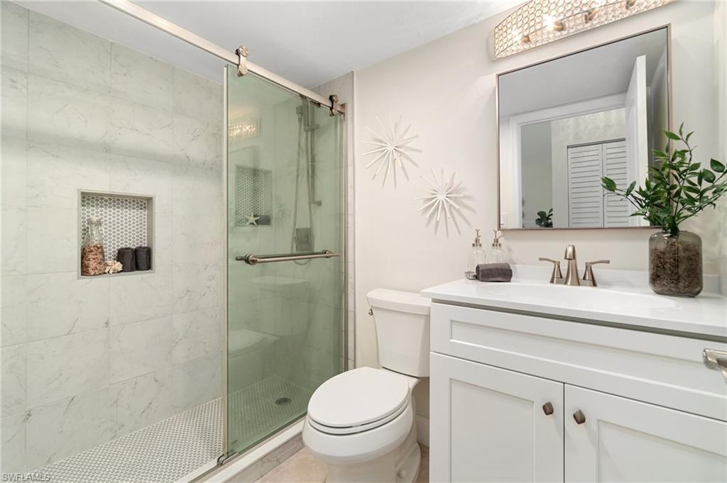 Live the SWFL Beach Life Under $300K on Marco Island! Escape to your own tropical retreat with this fully renovated 1 bedroom, 1 bath “Beach Bungalow” on beautiful Marco Island! Perfectly positioned just a short stroll from the white sand beaches and tranquil Gulf waters, this rare ground floor gem offers an unbeatable combination of location, lifestyle, and value, all with no storm damage to worry about. Step inside and be wowed by the bright, modern interior featuring white quartz countertops with elegant gray veining, new stainless steel appliances, new cabinetry with an open dry bar, and contemporary lighting that sets a fresh coastal tone. The spacious bedroom boasts plantation shutters, custom real wood sliding barn doors, and a new brushed nickel ceiling fan, creating a breezy, stylish sanctuary. Elegant diagonal tile flooring flows throughout, and dual entry doors, one with built in glass blinds, add flexibility, privacy, and natural light. Outside your door, the sparkling pool, grill stations, and clubhouse style tiki socials are just the beginning. The community hosts a lively social calendar, or you can simply relax poolside with friends and neighbors. For beach days, Residents’ Beach is just four blocks away. Bike or walk to this exclusive Gulf front spot featuring ample parking, shaded picnic pavilions, and a snack bar for carefree outings. Foodies will fall in love with the unbeatable location, just one block from a diverse mix of local dining spots including Thai and sushi, Mexican, Italian, breakfast cafés, fine dining, and even the island’s only fresh bagel shop, all walkable via a controlled pedestrian crosswalk. Need more options? Bikeable access puts you within minutes of even more restaurants, grocery stores, a four screen dine in movie theater, mini golf, and island amenities, all along hill free, palm lined roads. Whether you’re looking for a full time residence, seasonal getaway, or savvy rental investment, this turnkey condo delivers island living at its best: sun, sand, style, and location, all wrapped up in a low maintenance, high enjoyment package. Live every day like you’re on vacation. Paradise is calling!