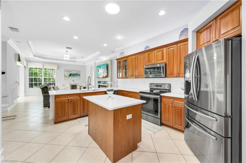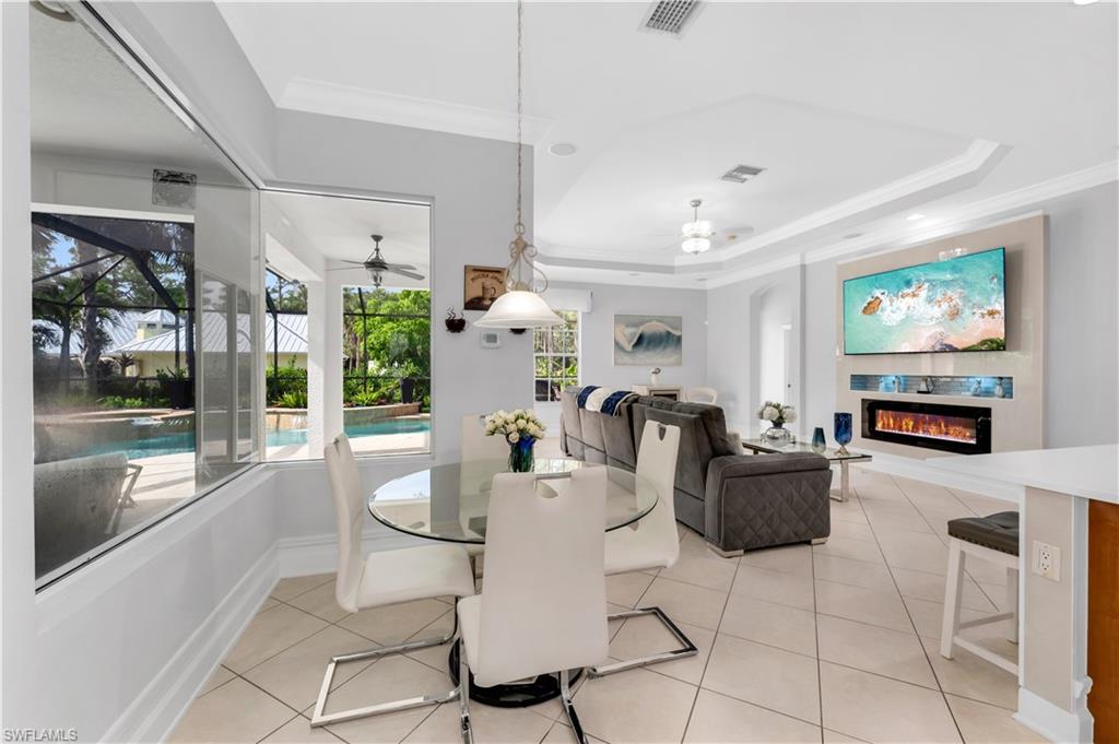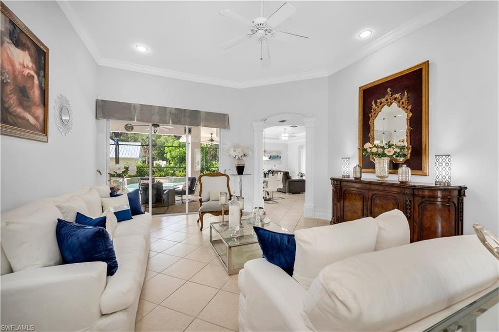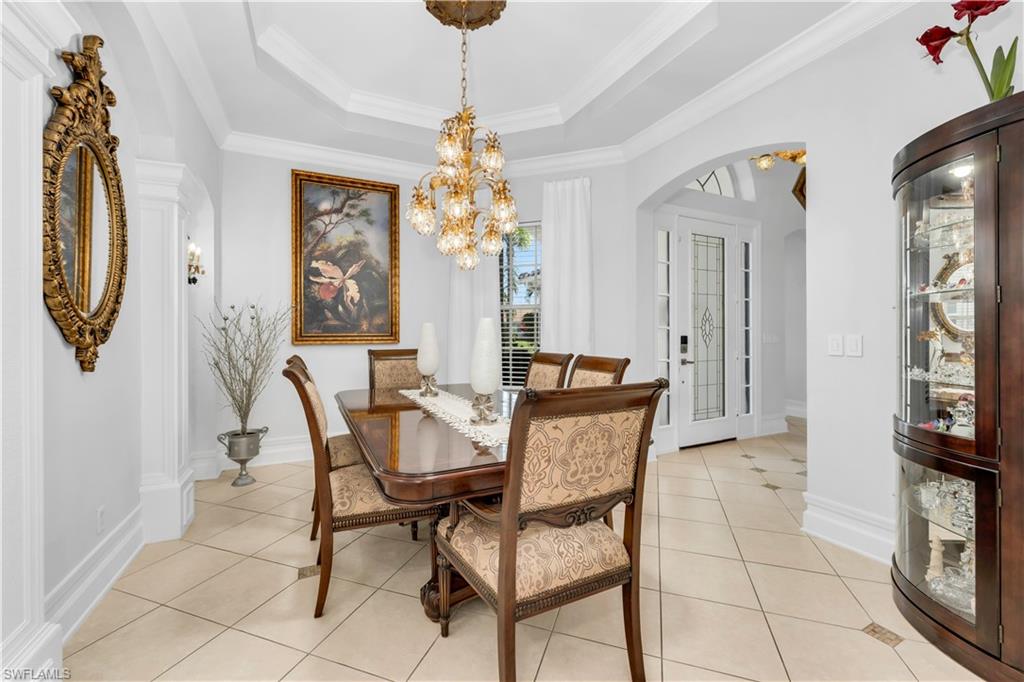 Welcome to this exquisite 5-bedroom, 4-bathroom, 3-car garage estate home, offering over 3200 square feet of living space and featuring the highly sought-after ESTRELLA floorplan in the beautiful gated community of Delasol. Meticulously maintained by its original owner and never rented, this home is truly move-in ready. The open and bright layout includes an oversized family room with double sliders leading to a covered patio, complete with a stunning pool and spa—perfect for entertaining. The upgraded kitchen is a chef’s dream, showcasing 42-inch raised maple cabinets, quartz countertops, a plumbed utility island, custom backsplash, and crown molding. The spacious master suite features a large walk-in closet and a luxurious en-suite bathroom with upgraded flooring and tile work, a soaking tub, separate shower, and dual quartz vanities. Custom tile and engineered wood flooring throughout the main living areas provide both elegance and low-maintenance living. Tray ceilings and crown molding in all primary living spaces and the master bedroom add refined touches throughout the home. Additional highlights include a NEW ROOF, large formal dining and living areas, and abundant storage space. Delasol offers low HOA fees and premium amenities including a newly renovated clubhouse, fitness center, pickleball and tennis courts, basketball court, playground, and a resort-style community pool and spa. Xfinity cable and internet are also included. Conveniently located just west of I-75, this home is close to award-winning beaches, top-rated restaurants, and is part of an A-rated school district, including the new Aubrey Rogers High School. Best of all, the home is not located in a flood zone. This is a rare opportunity to own a meticulously cared-for home on a prime lot in one of Naples’ most desirable communities.