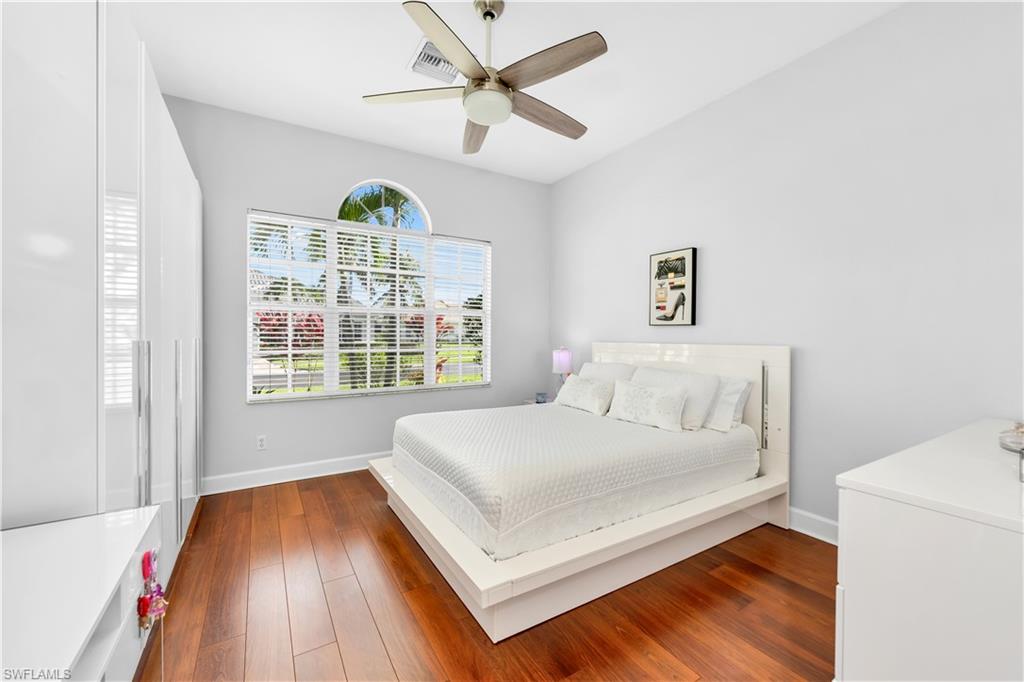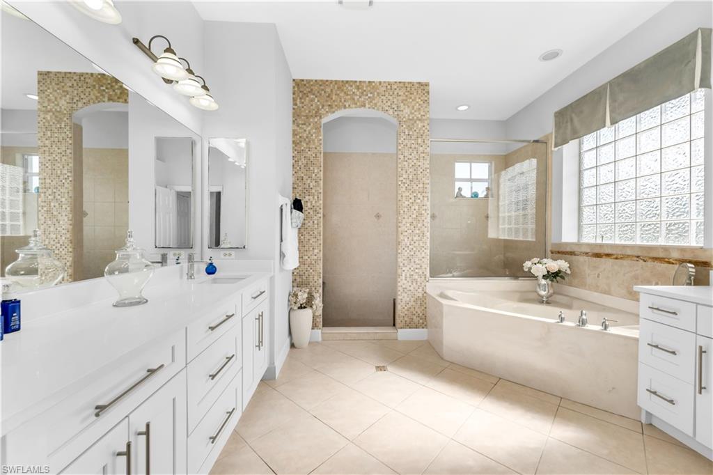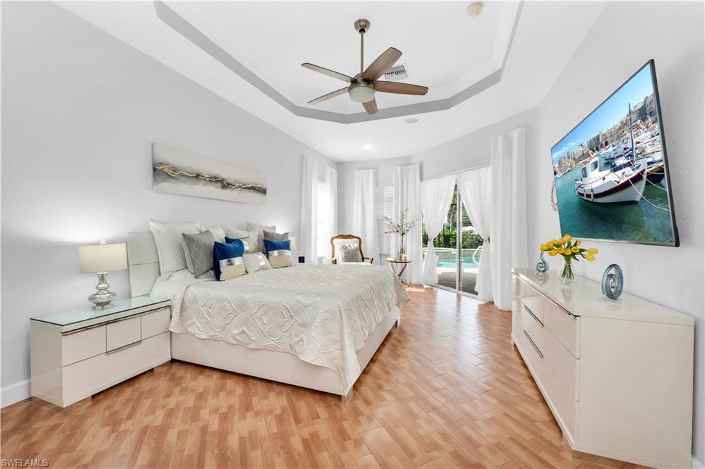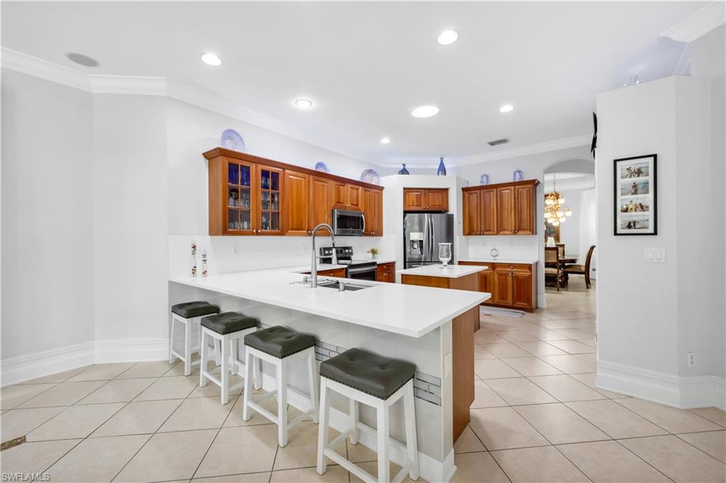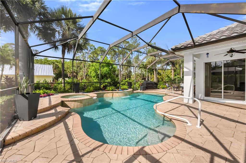 Welcome to this exquisite 5-bedroom, 4-bathroom, 3-car garage estate home, offering over 3200 square feet of living space and featuring the highly sought-after ESTRELLA floorplan in the beautiful gated community of Delasol. Meticulously maintained by its original owner and never rented, this home is truly move-in ready. The open and bright layout includes an oversized family room with double sliders leading to a covered patio, complete with a stunning pool and spa—perfect for entertaining. The upgraded kitchen is a chef’s dream, showcasing 42-inch raised maple cabinets, quartz countertops, a plumbed utility island, custom backsplash, and crown molding. The spacious master suite features a large walk-in closet and a luxurious en-suite bathroom with upgraded flooring and tile work, a soaking tub, separate shower, and dual quartz vanities. Custom tile and engineered wood flooring throughout the main living areas provide both elegance and low-maintenance living. Tray ceilings and crown molding in all primary living spaces and the master bedroom add refined touches throughout the home. Additional highlights include a NEW ROOF, large formal dining and living areas, and abundant storage space. Delasol offers low HOA fees and premium amenities including a newly renovated clubhouse, fitness center, pickleball and tennis courts, basketball court, playground, and a resort-style community pool and spa. Xfinity cable and internet are also included. Conveniently located just west of I-75, this home is close to award-winning beaches, top-rated restaurants, and is part of an A-rated school district, including the new Aubrey Rogers High School. Best of all, the home is not located in a flood zone. This is a rare opportunity to own a meticulously cared-for home on a prime lot in one of Naples’ most desirable communities.