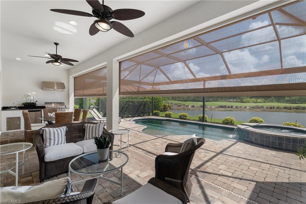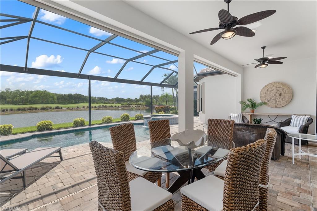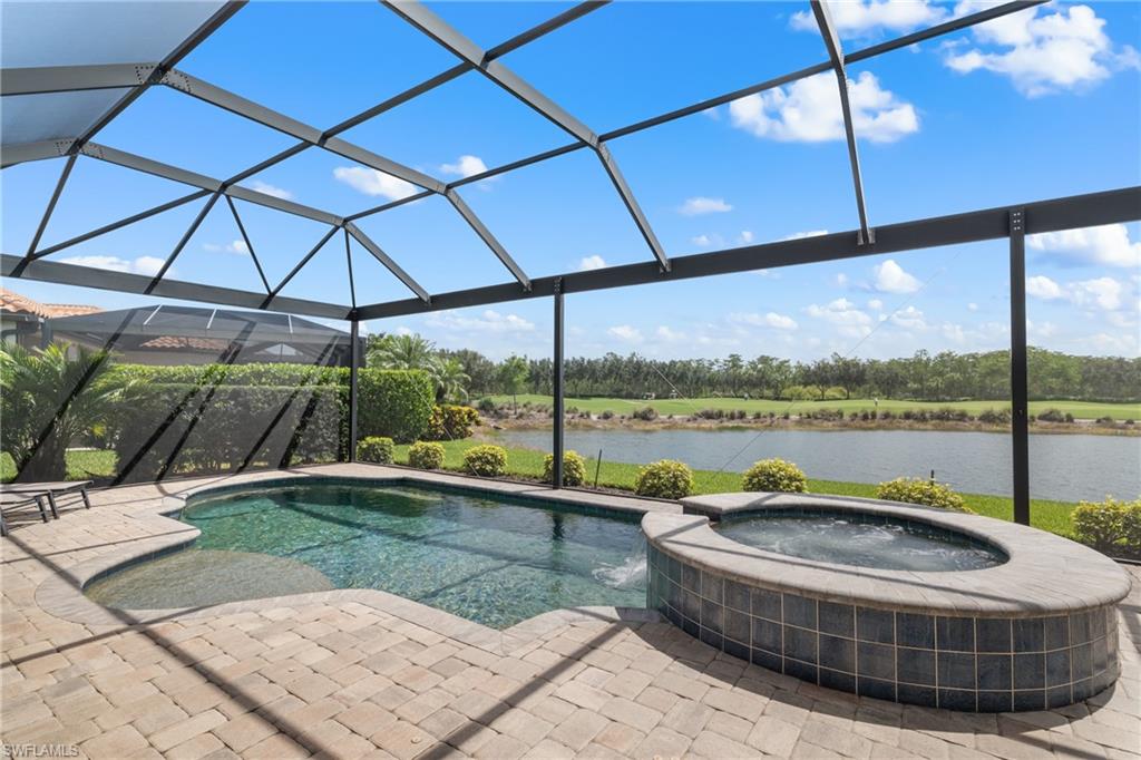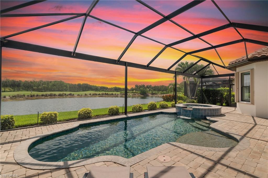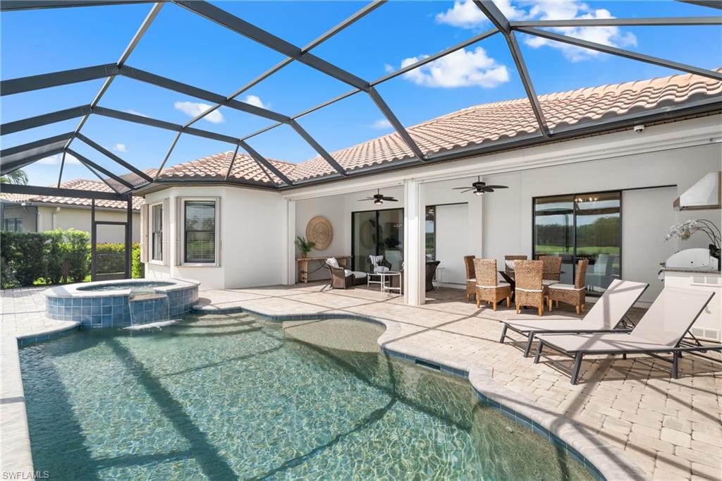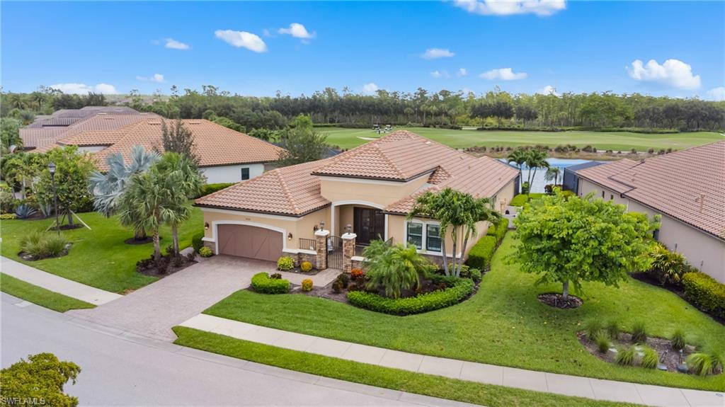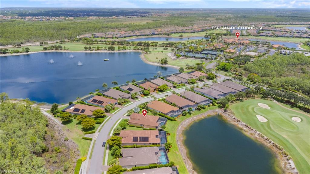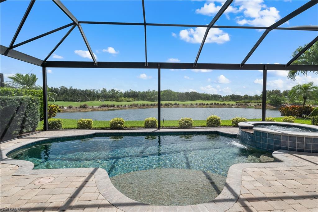 FULL GOLF MEMBERSHIP INCLUDED! Big Views, Big Lot, and a Big Garage! Built in 2016, this immaculate “Carrera” floorplan (3 Bedrooms, 2.5 Baths, 2545 sq ft under air) is situated on an oversized pie shaped just steps away from amenity campus of Esplanade Golf & Country Club and has been lovingly cared for by its original owners. Expansive lake, golf course, and preserve views can be appreciated from nearly every room in the house and from the expanded lanai complete with outdoor kitchen and a salt water GAS heated pool with raised spa and sunshelf which is all enclosed with a picture window screen cage. A gated courtyard welcomes you as you enter the home and once inside you are greeted with 12’ ceilings throughout the Great Room style floorplan with both formal and informal dining areas, two pocketing sliding glass doors to the lanai, and a spacious Kitchen complete with GAS cooktop, wall oven, brand new Bosch refrigerator, and solid wood raised panel cabinetry complete with glass display cabinets and under cabinet lighting. A long list of special features and upgrades include: oversized two car garage (20’x27’) with finished floor and built in storage cabinets; new HVAC (2022); motorized roll down hurricane screens on the lanai & front door and easy close accordion style hurricane shutters on the side and rear windows; brand new washer/dryer; freshly painted interior & exterior; 7” baseboards & crown molding throughout; recessed lights in every room; diagonal tile floors throughout (no carpet anywhere); stacked stone elevation upgrade with courtyard; storage galore amongst the 9 closets throughout the home all with custom shelving/cabinets; and more! Esplanade Golf & Country Club of North Naples offers a true “Lifestyle Community” with world-class amenities, including a resort pool with cabanas and the popular “Bahama Bar,” tennis, pickleball, bocce, a 14-mile network of bike/walking trails, and an 18-hole private golf course. The impressive 15,000 Sq Ft clubhouse features a restaurant, bar, wine-tasting room, wine lockers, and a Starbucks-style café. Best of all, the property’s landscaping, irrigation, golf membership, and all community amenities are covered under a quarterly fee of just $3,434—no additional fees or memberships required! Don't miss your opportunity to own this exceptional home in one of Naples’ most sought-after communities. Schedule your tour of this stunning home and Esplanade Golf & Country Club today!