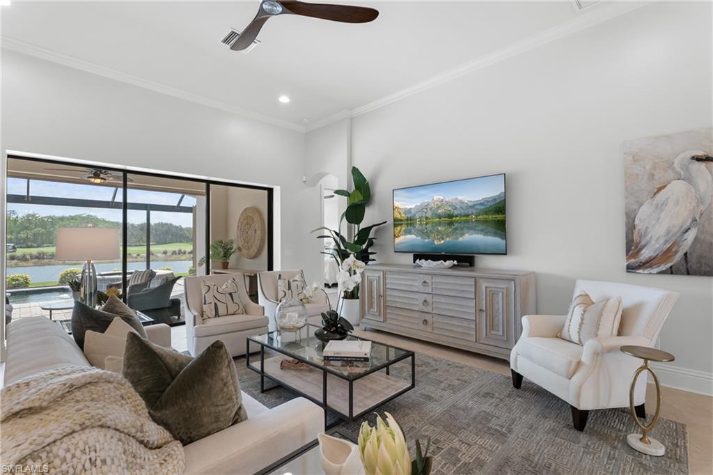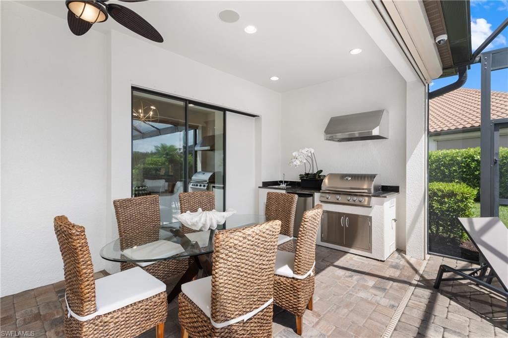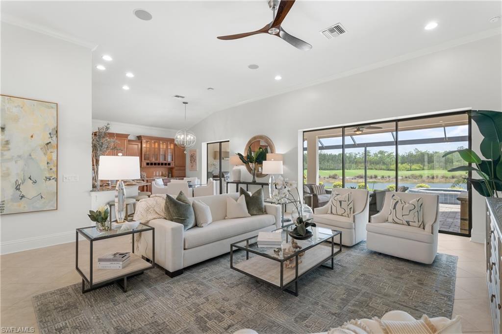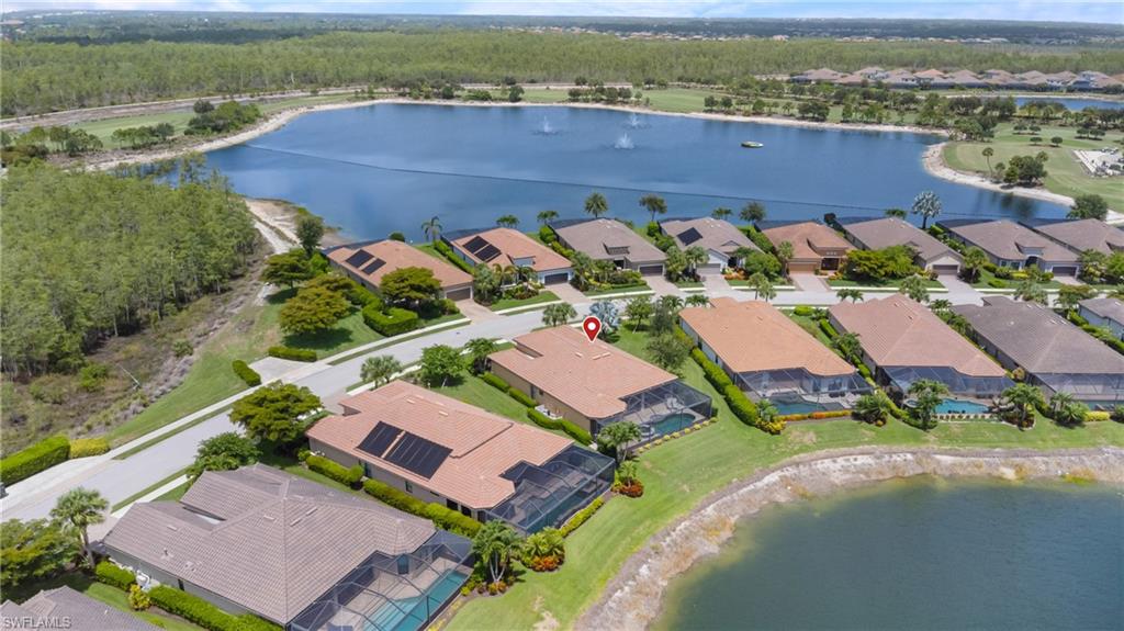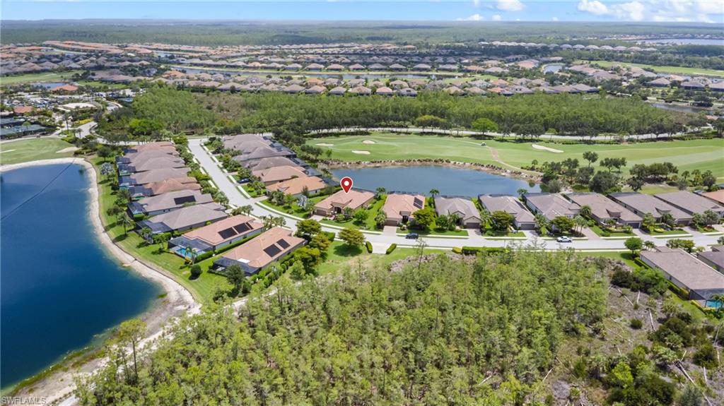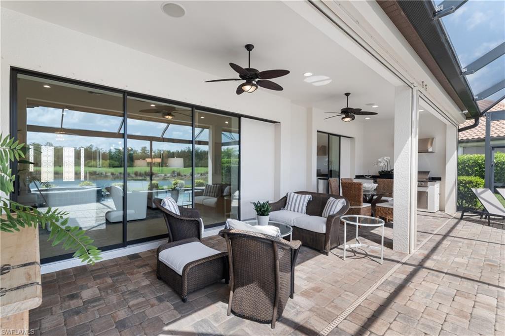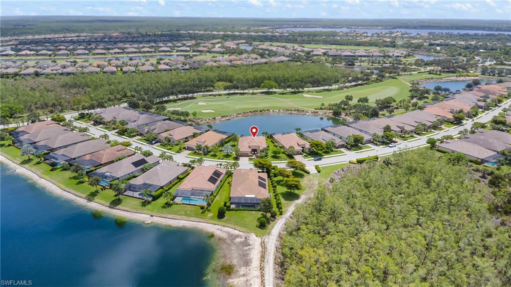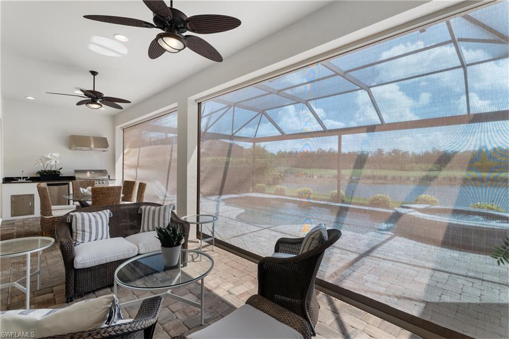 FULL GOLF MEMBERSHIP INCLUDED! Big Views, Big Lot, and a Big Garage! Built in 2016, this immaculate “Carrera” floorplan (3 Bedrooms, 2.5 Baths, 2545 sq ft under air) is situated on an oversized pie shaped just steps away from amenity campus of Esplanade Golf & Country Club and has been lovingly cared for by its original owners. Expansive lake, golf course, and preserve views can be appreciated from nearly every room in the house and from the expanded lanai complete with outdoor kitchen and a salt water GAS heated pool with raised spa and sunshelf which is all enclosed with a picture window screen cage. A gated courtyard welcomes you as you enter the home and once inside you are greeted with 12’ ceilings throughout the Great Room style floorplan with both formal and informal dining areas, two pocketing sliding glass doors to the lanai, and a spacious Kitchen complete with GAS cooktop, wall oven, brand new Bosch refrigerator, and solid wood raised panel cabinetry complete with glass display cabinets and under cabinet lighting. A long list of special features and upgrades include: oversized two car garage (20’x27’) with finished floor and built in storage cabinets; new HVAC (2022); motorized roll down hurricane screens on the lanai & front door and easy close accordion style hurricane shutters on the side and rear windows; brand new washer/dryer; freshly painted interior & exterior; 7” baseboards & crown molding throughout; recessed lights in every room; diagonal tile floors throughout (no carpet anywhere); stacked stone elevation upgrade with courtyard; storage galore amongst the 9 closets throughout the home all with custom shelving/cabinets; and more! Esplanade Golf & Country Club of North Naples offers a true “Lifestyle Community” with world-class amenities, including a resort pool with cabanas and the popular “Bahama Bar,” tennis, pickleball, bocce, a 14-mile network of bike/walking trails, and an 18-hole private golf course. The impressive 15,000 Sq Ft clubhouse features a restaurant, bar, wine-tasting room, wine lockers, and a Starbucks-style café. Best of all, the property’s landscaping, irrigation, golf membership, and all community amenities are covered under a quarterly fee of just $3,434—no additional fees or memberships required! Don't miss your opportunity to own this exceptional home in one of Naples’ most sought-after communities. Schedule your tour of this stunning home and Esplanade Golf & Country Club today!
