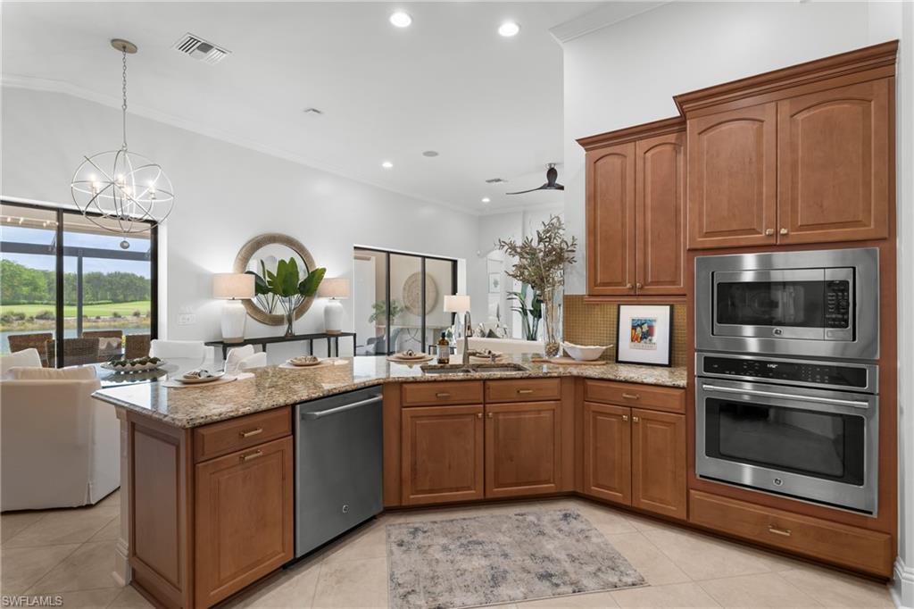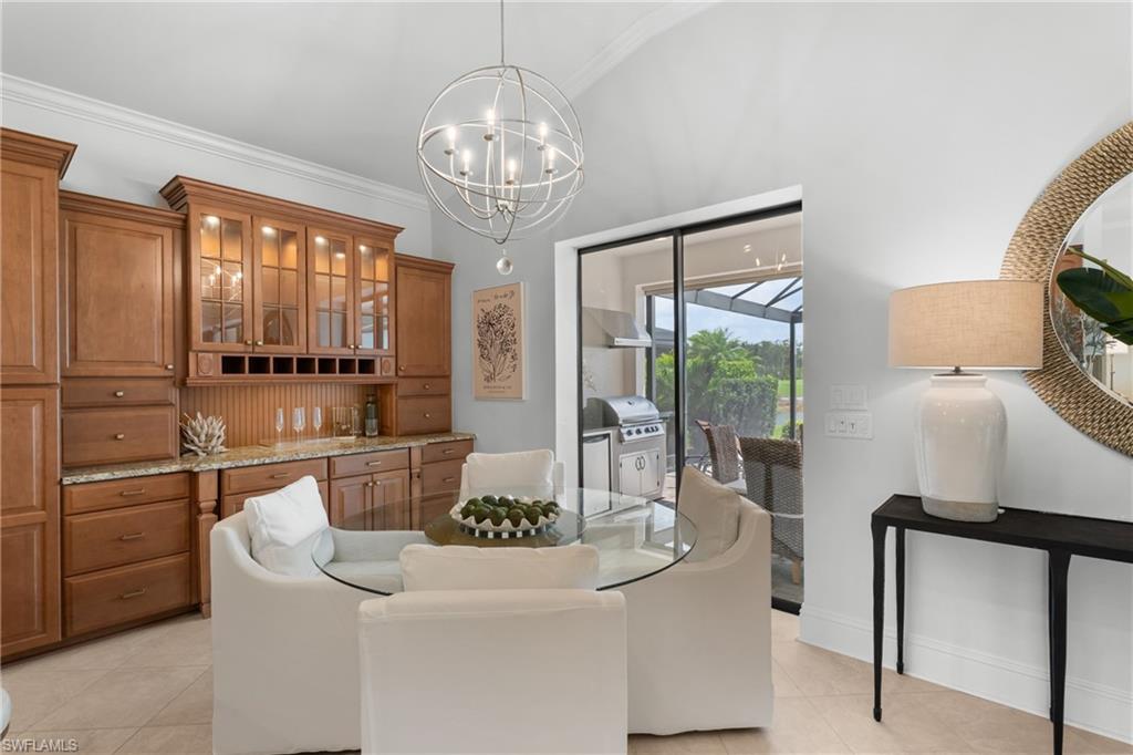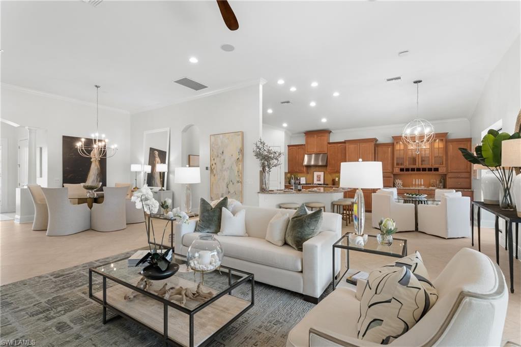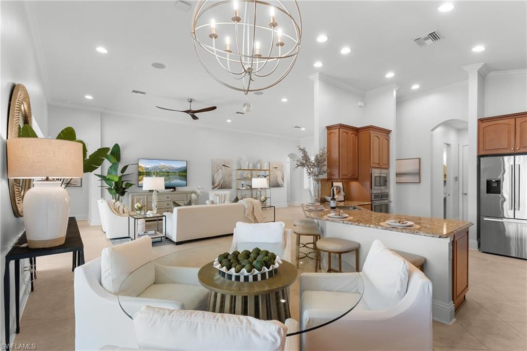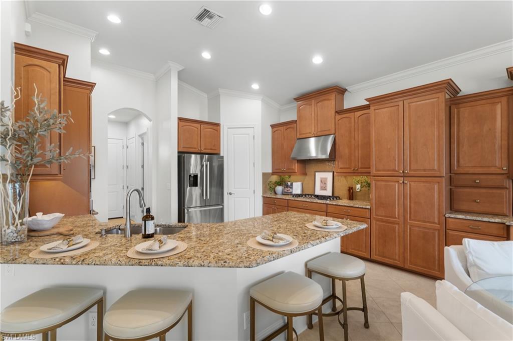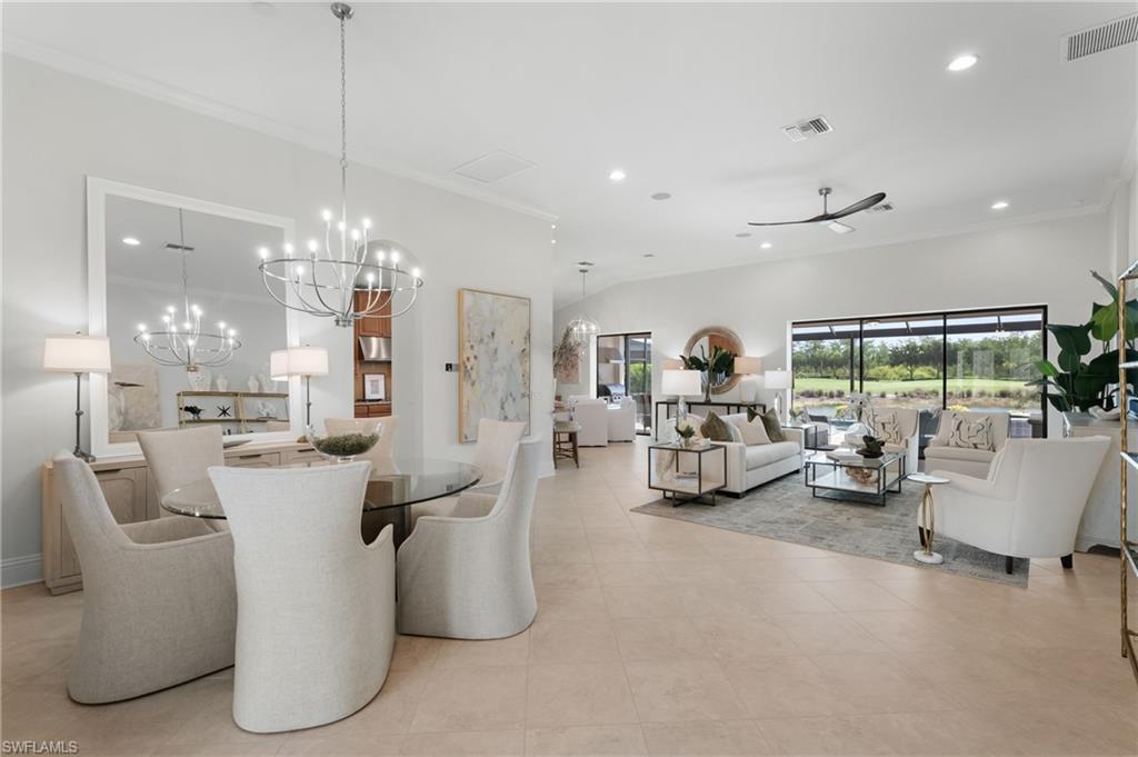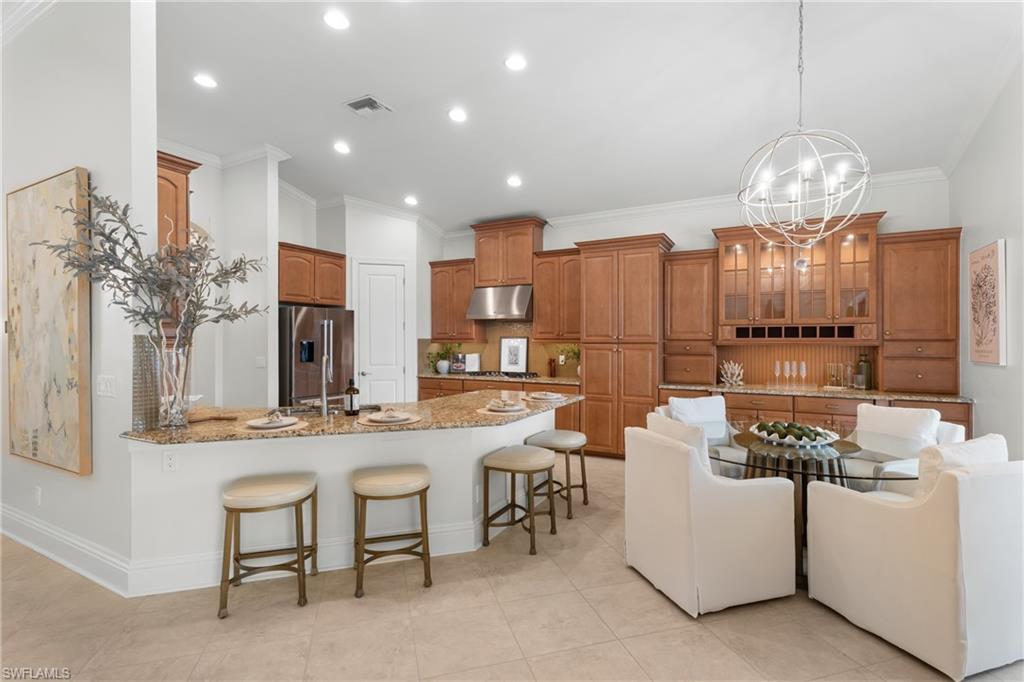 FULL GOLF MEMBERSHIP INCLUDED! Big Views, Big Lot, and a Big Garage! Built in 2016, this immaculate “Carrera” floorplan (3 Bedrooms, 2.5 Baths, 2545 sq ft under air) is situated on an oversized pie shaped just steps away from amenity campus of Esplanade Golf & Country Club and has been lovingly cared for by its original owners. Expansive lake, golf course, and preserve views can be appreciated from nearly every room in the house and from the expanded lanai complete with outdoor kitchen and a salt water GAS heated pool with raised spa and sunshelf which is all enclosed with a picture window screen cage. A gated courtyard welcomes you as you enter the home and once inside you are greeted with 12’ ceilings throughout the Great Room style floorplan with both formal and informal dining areas, two pocketing sliding glass doors to the lanai, and a spacious Kitchen complete with GAS cooktop, wall oven, brand new Bosch refrigerator, and solid wood raised panel cabinetry complete with glass display cabinets and under cabinet lighting. A long list of special features and upgrades include: oversized two car garage (20’x27’) with finished floor and built in storage cabinets; new HVAC (2022); motorized roll down hurricane screens on the lanai & front door and easy close accordion style hurricane shutters on the side and rear windows; brand new washer/dryer; freshly painted interior & exterior; 7” baseboards & crown molding throughout; recessed lights in every room; diagonal tile floors throughout (no carpet anywhere); stacked stone elevation upgrade with courtyard; storage galore amongst the 9 closets throughout the home all with custom shelving/cabinets; and more! Esplanade Golf & Country Club of North Naples offers a true “Lifestyle Community” with world-class amenities, including a resort pool with cabanas and the popular “Bahama Bar,” tennis, pickleball, bocce, a 14-mile network of bike/walking trails, and an 18-hole private golf course. The impressive 15,000 Sq Ft clubhouse features a restaurant, bar, wine-tasting room, wine lockers, and a Starbucks-style café. Best of all, the property’s landscaping, irrigation, golf membership, and all community amenities are covered under a quarterly fee of just $3,434—no additional fees or memberships required! Don't miss your opportunity to own this exceptional home in one of Naples’ most sought-after communities. Schedule your tour of this stunning home and Esplanade Golf & Country Club today!