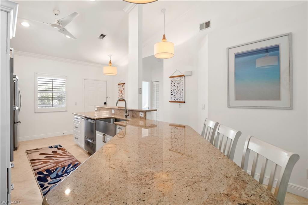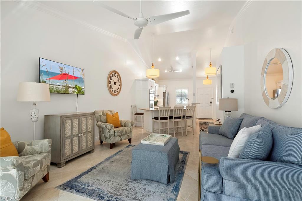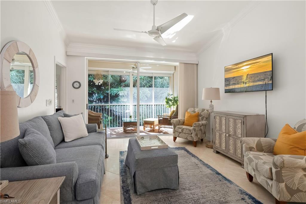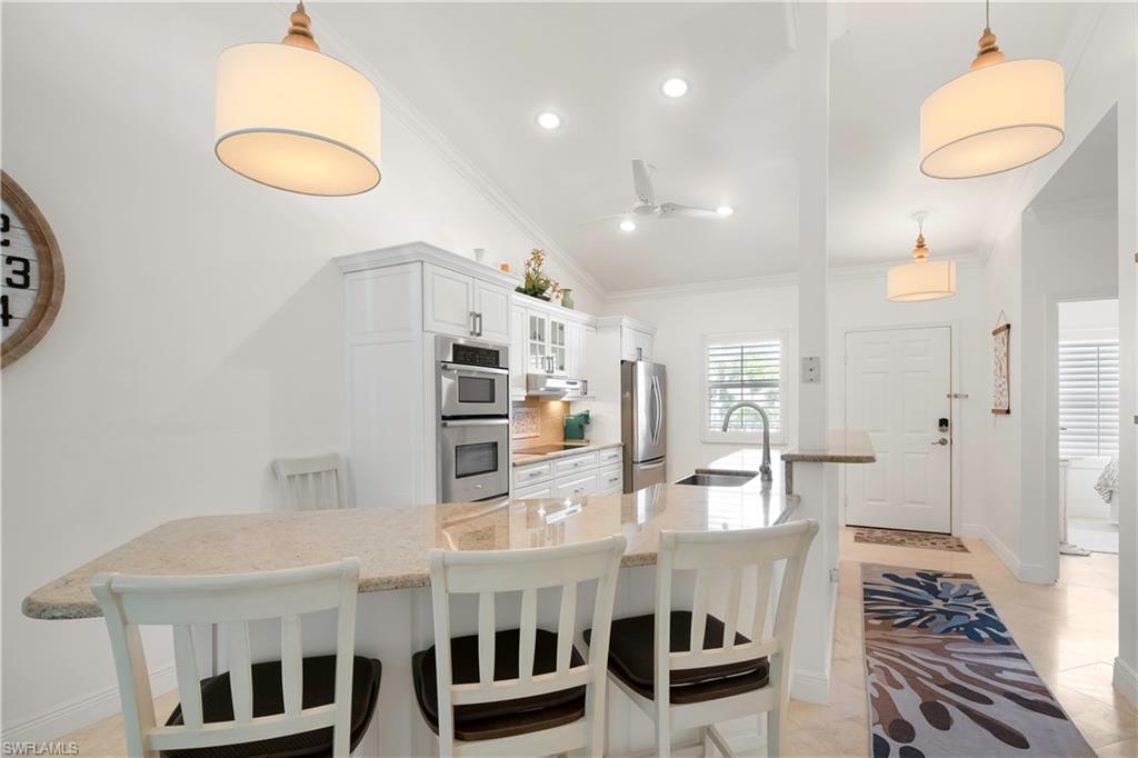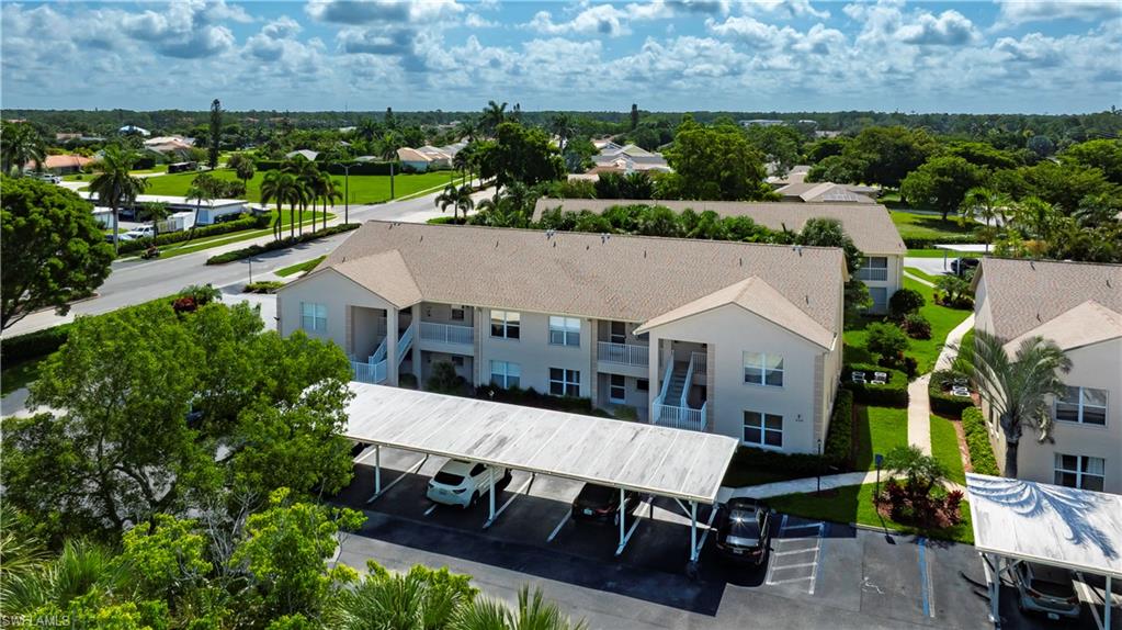 Welcome to Bradstrom Village in the heart of Lely resort community—an immaculately maintained, tastefully furnished 2 bedroom, 2 bath second-floor condo in a quiet 44-unit community just 6 miles from downtown Naples and the white sand beaches of Southwest Florida. This move-in-ready or rental-ready home features vaulted ceilings, a beautifully updated kitchen with granite countertops, double wall oven , stainless steel appliances, and a large breakfast bar, plus a spacious primary suite with dual vanities, a walk-in shower, and a large walk-in closet. The unit also offers a convenient laundry room with plenty of storage, and a screened-in lanai just off the family room, perfect for relaxing while overlooking the beautifully landscaped grounds. The building received a new roof and fresh paint in 2023—with no assessments—and the community pool was resurfaced in 2024. A covered carport and newer A/C (2021) add to the value. Bradstrom Village allows monthly rentals, is pet-friendly, and offers unbeatable access to golf, 5th Avenue dining and shopping, and the Naples Botanical Gardens.