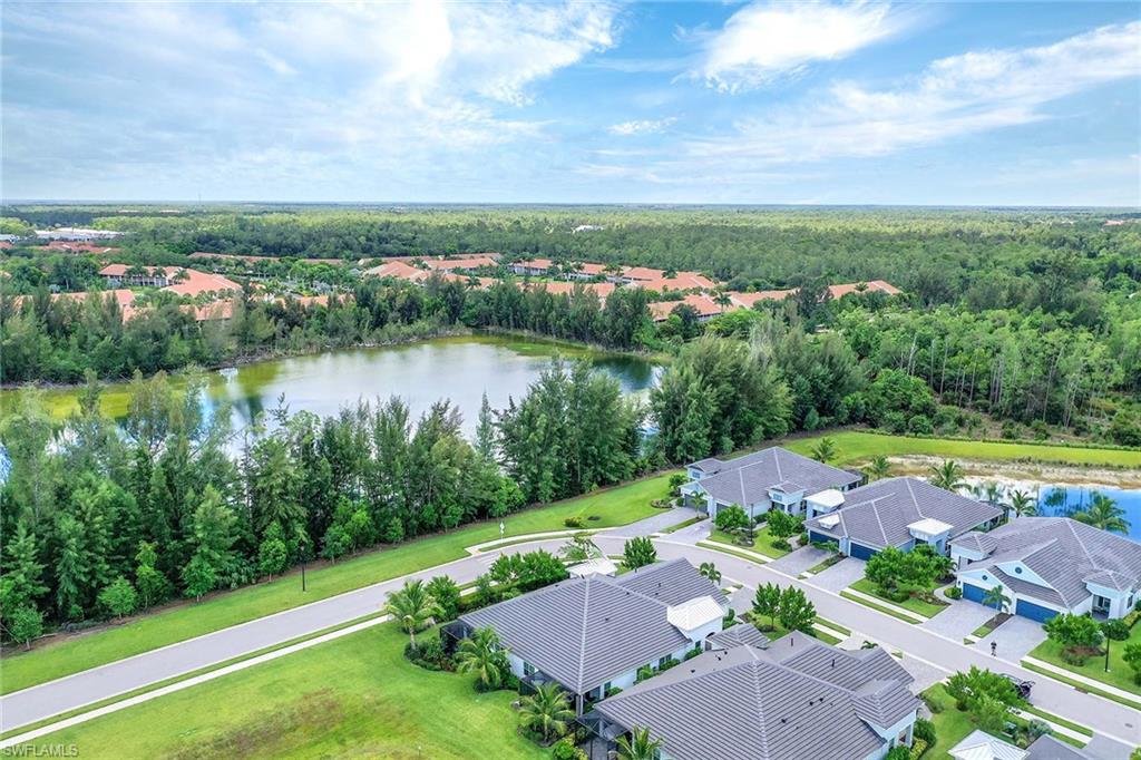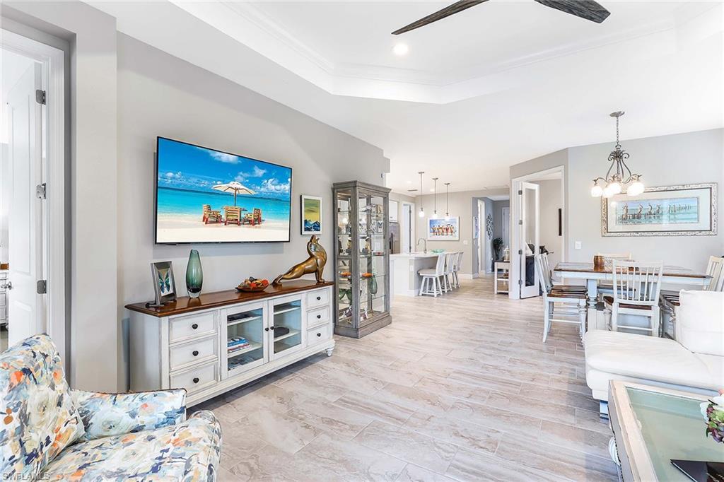 Built in 2020 and maintained in pristine condition, this coastal villa offers refined living in one of Central Naples desirable gated communities. With quality concrete block construction and impact-resistant windows throughout, this three-bedroom-plus-den residence is move-in ready and thoughtfully upgraded. The interior features tile and European French plank wood flooring with no carpet to maintain. A quartz island anchors the gourmet kitchen, complemented by a natural gas range, counter-depth stainless refrigerator, and clean soffit lines above cabinetry. A tray ceiling adds architectural interest to the great room, where 8-foot stacking sliders invite natural light and open to a screened lanai with peaceful water views. The primary suite includes dual vanities, a spacious walk-in shower, an electric bidet, and custom closet cabinetry. Functional upgrades include designer lighting from Wilson Lighting, a SimpliSafe security system and an epoxy-finished garage with pull-down attic access. Low HOA dues cover high-speed fiber optic internet and cable. No community development district or flood insurance required. Enjoy access to a community pool, clubhouse and dog park, all just minutes from Gulf beaches and dining in Old Naples.