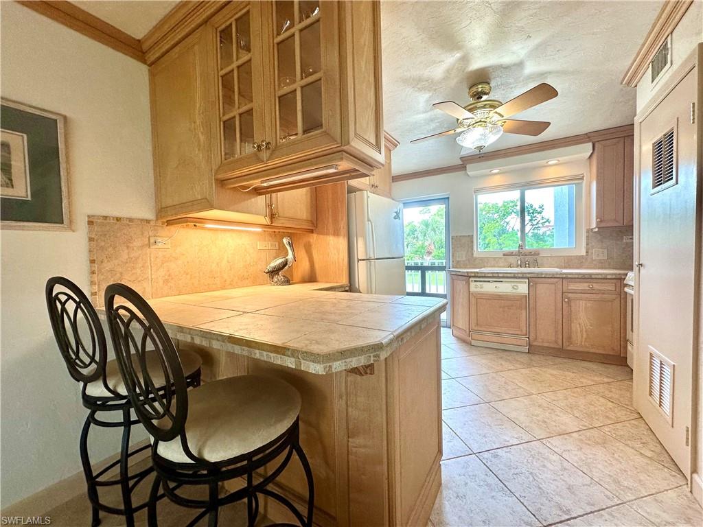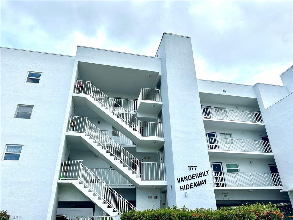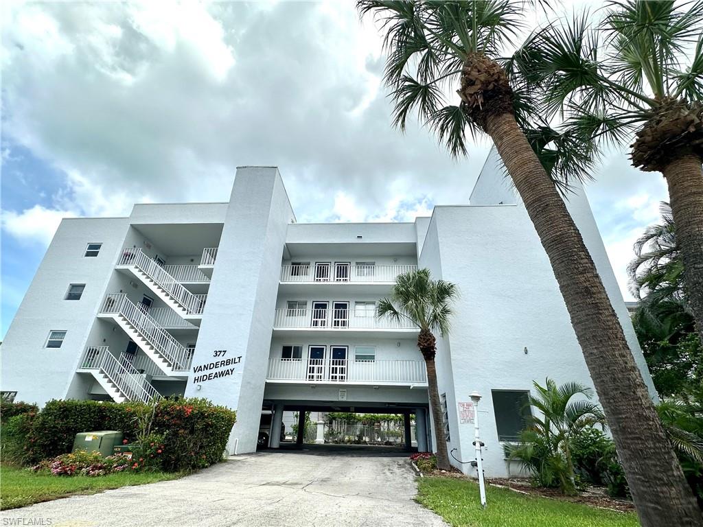 On the doorstep of Vanderbilt Beach! Tucked away 2 blocks from the beach and adjacent to the new ultra-glam Ritz-Carlton Residences, The Hideaway is so close you can sense the Gulf-breeze. Across the street from The Ritz-Carlton Hotel and casual dining at Gumbo Limbo; the third-floor common area patio also has a birds-eye view of the Gulf. Other Amenities include a Covered Parking Garage under the Building. Being sold Turnkey furnished. The well-kept, well managed condo complex offers uncommonly Low HOA fees and Unlimited investment potential. The conditioned, glassed-in Lanai opens into the living room creating a larger, wide open living space. The newly up-fitted impact glass two-tier sliding widows with screens provide storm protection and sunset views of Water Turkey Bay and the Vanderbilt Lagoon. Boat docks and Seawalls provide gulf access by boat or kayak and fishing. The Interior is well maintained and everything works. 18” tile flooring on the diagonal and Crown molding throughout. Tile countertops in Kitchen and bathroom. 2 Murphy beds, 1 in living area 1 in lanai. Washer and Dryer inside the unit. Water heater new in 5/2025, newer commode and screen door. Ample storage with closets in the lanai and living area. Vanderbilt Hideaway is in the heart of North Naples close to Mercato and convenient to the airport and 5th Ave. These units are rarely available.