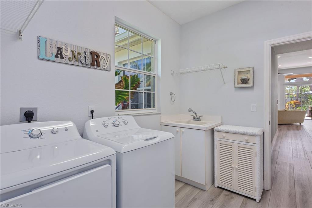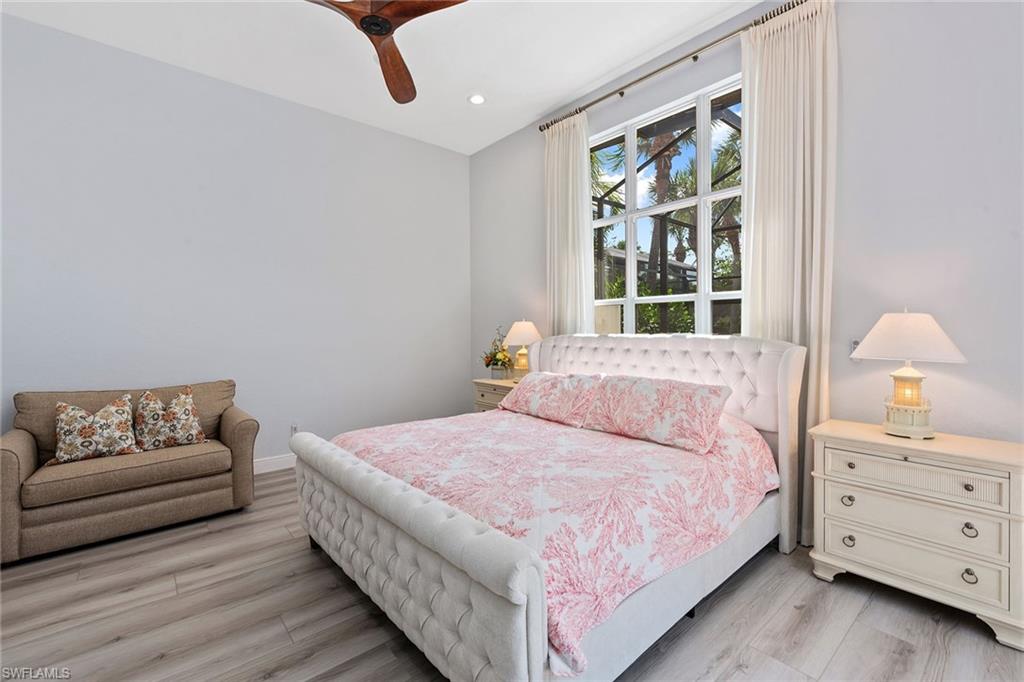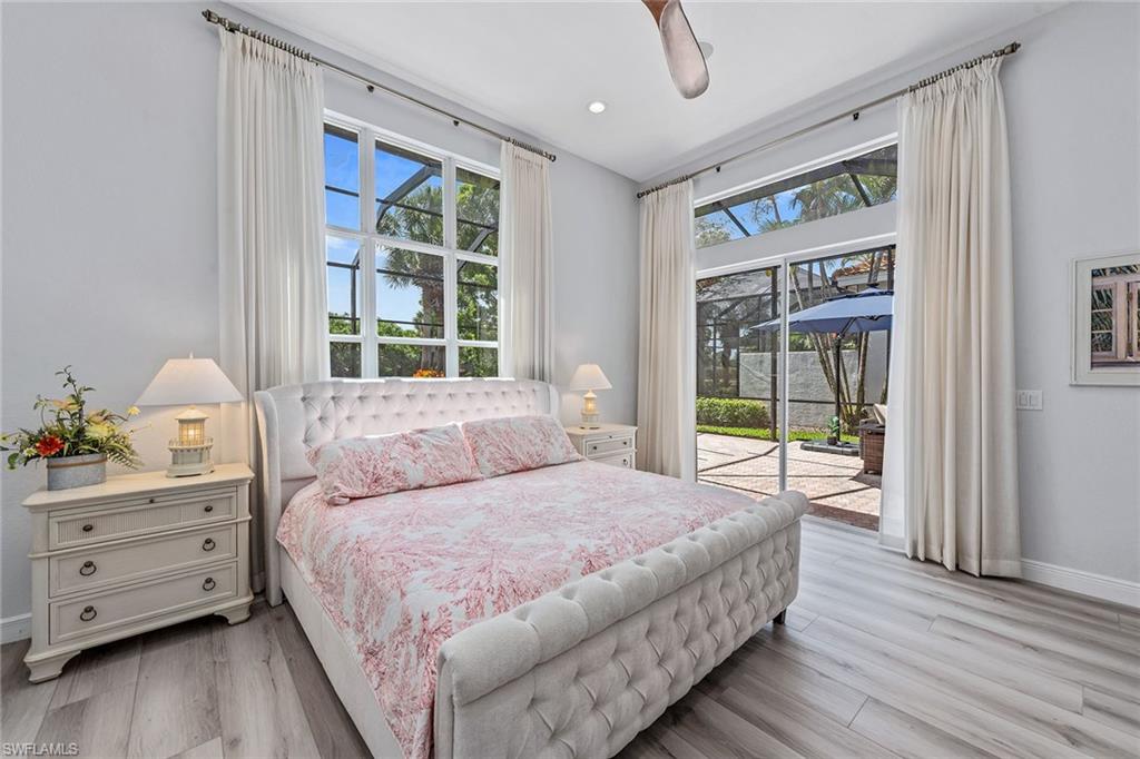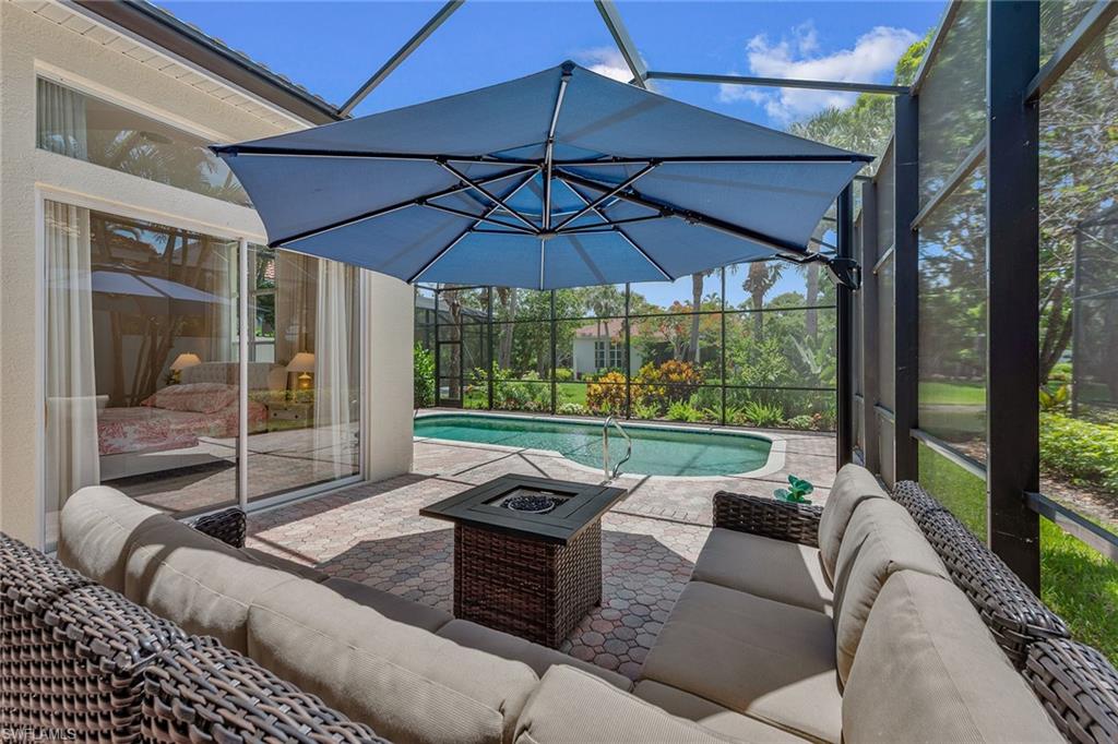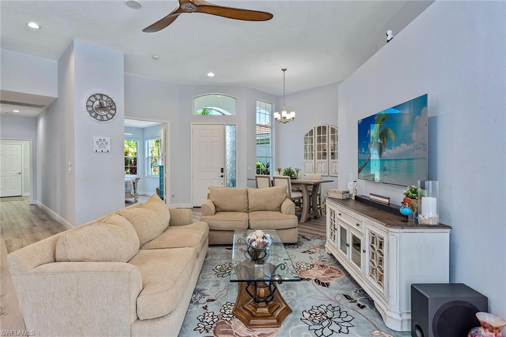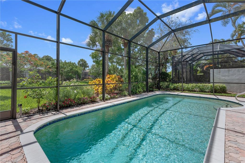 Introducing a serene retreat framed by lush tropical landscaping and tranquil lakefront views. In the vibrant and quaint Pepper Tree enclave of Fiddler’s Creek, this light-filled, two-bedroom plus den residence has been renovated and offers sunrises over the lake with eastern exposure, a split-bedroom layout, a private pool, and seamless indoor-outdoor living. With picturesque water views, the home blends natural beauty with thoughtful updates and everyday comfort. Recent improvements include a 2019 roof, 2023 HVAC system, 2022 water heater and nearly all kitchen appliances—refrigerator, dishwasher, electric range, microwave—installed within the past year. Inside, newer luxury vinyl tile flooring flows through the main living spaces, with porcelain tile in both baths. Dramatic entry with volume ceilings, crown molding, and newer LED lighting throughout enhance the sense of space, while in-ceiling speakers provide immersive sound throughout the home. The updated kitchen is designed for beauty and function, featuring white Shaker-style cabinetry, quartz countertops with a waterfall peninsula, a tile backsplash, recessed lighting and LED under-cabinet lighting. Stainless appliances include an electric range with hood, French-door refrigerator with icemaker, under-counter microwave, and dishwasher. A breakfast bar opens to the living area, and the adjacent dining space offers tranquil garden views. The lanai, finished with brick paver flooring, offers a peaceful setting for entertaining or relaxing by the pool, surrounded by tropical foliage and a serene lake backdrop. The primary suite features large windows with lake views, a transom window above the sliding glass door, a walk-in closet and a spa-style en-suite bath with dual quartz vanities, a full-width mirror, a frameless glass walk-in shower, and a separate soaking tub. The guest bedroom is near a full bath with walk-in shower, while the den with French doors offers flexibility as a home office or third bedroom. The living room is filled with natural light from a transom window above the front entry door, complementing the home’s bright and welcoming ambiance. A well-appointed laundry room includes a GE washer and dryer, utility sink and overhead storage. The two-car garage features epoxy flooring and a Culligan water softener system. Residents of Fiddler’s Creek enjoy access to the 24,000-square-foot Club & Spa with fine and casual dining, a full fitness center with personal training and classes, resort pools with waterfalls and slides, a spa, sauna, steam room, tennis, pickleball, bocce and a year-round calendar of social events. Club renovations are underway in 2025. Optional memberships are available at The Tarpon Club for beach and marina privileges as well as The Golf Club with its acclaimed renovated course and new clubhouse. Close to Marco Island and downtown Naples, this home offers a refined coastal lifestyle in a premier gated community.