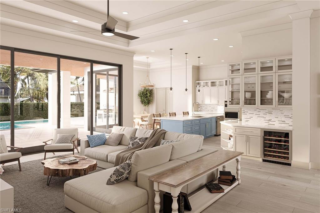Newly completed coastal contemporary new construction only blocks from Residents' Beach. Expansive great room with open concept: gourmet kitchen with Shaker cabinets, shadow boxes and quartz countertops. Crown molding throughout. GE Profile & Cafe kitchen appliances. Over 2500 square feet, 5 bedrooms, 4 baths. 12-foot ceilings with double tray, peaking at 14 feet. Shaker cabinets with quartz tops in all bathrooms & laundry room. Spacious primary suite has two closets, soaking tub and separate shower. Wood plank porcelain tile throughout. Hurricane windows & doors. Inviting pool & cascading spa surrounded by marble tile lanai. Stackable sliders open to ample covered space, perfect for indoor/outdoor living. Custom outdoor kitchen includes built-in grill, counter refrigerator, custom exhaust fan encased in stucco, sink and granite countertop. Metal roof. Epoxy garage floor. Paver stone driveway. Excellent rental potential! Similar properties in this area can rent for upwards of $14,000/week during High Season.