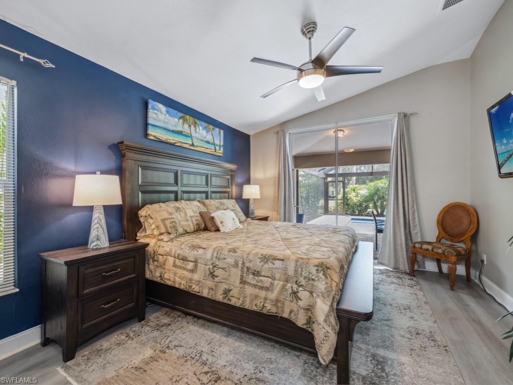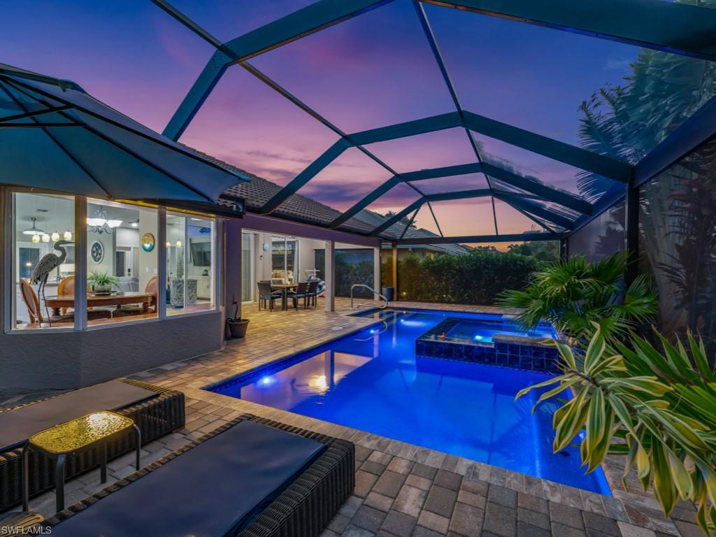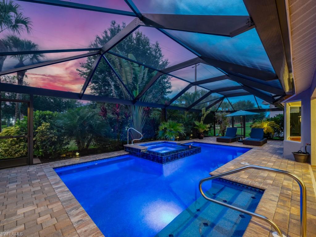 Welcome to your personal tropical retreat in the highly desirable gated community of Hunters Ridge! This impeccably maintained 3-bedroom, 2-bath home has been carefully curated with high-end updates and upgrades for effortless living. Step into a spacious split floor plan featuring volume vaulted ceilings and luxury vinyl plank flooring throughout. Pocket sliders in the great room and breakfast nook seamlessly extend your living space to the outdoors, revealing a new 2023 saltwater pool and spa, new screened lanai, and sweeping golf course views. This home is built for entertaining and easy living, with a WiFi-enabled pool heater, pump, and equipment, new solar panels, and an automatic plant watering system within the lanai. The covered outdoor seating area is perfect for morning coffee or sunset dinners, framed by peaceful professional landscaping. Inside, the kitchen features granite countertops, stainless steel appliances (2020), and an oversized kitchen island. Enjoy the ease of move-in-ready living with nearly every mechanical update already complete — from the WiFi-enabled A/C and whole-home repiping (2021) to the smart sprinkler system and newer roof (2019), all the work has been done for you. The attached 2-car garage is equally impressive, with epoxy floors, a new garage door opener (2023 - WiFi), and ample storage. The extended paver driveway, walkway, and front patio are sealed and pristine, completing the home's curb appeal. All this is nestled in Hunters Ridge, a vibrant, amenity-rich community featuring an 18-hole championship golf course, clubhouse renovations underway, Olympic-sized pool, restaurant, fitness center, tennis, pickleball, bocce, putting green, year-round social events, and more. This is not just a home—it’s a lifestyle upgrade waiting for you. Move-in ready, modern, and maintenance-free. Welcome to Florida living at its finest.