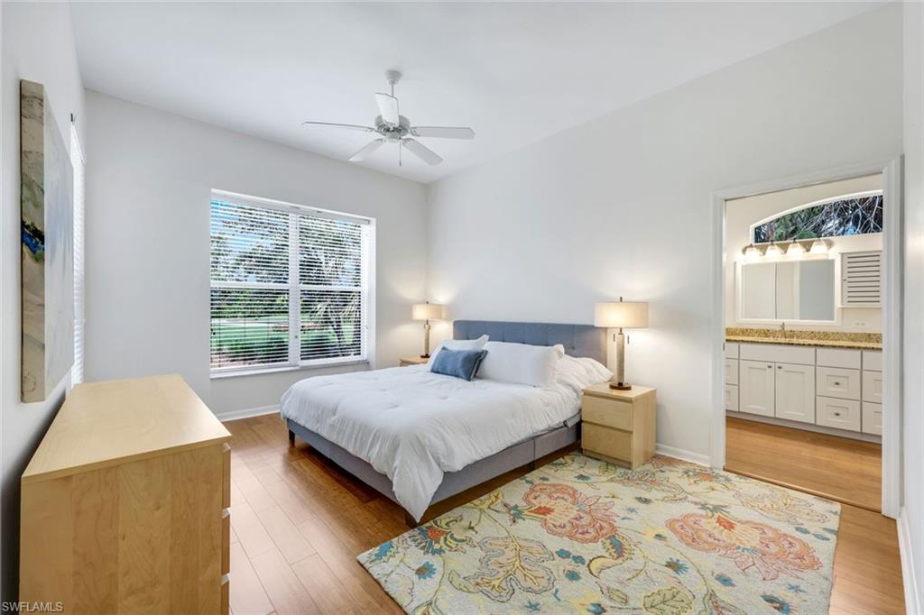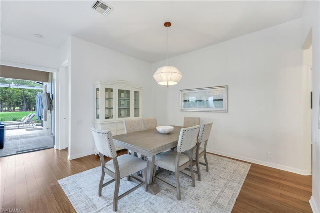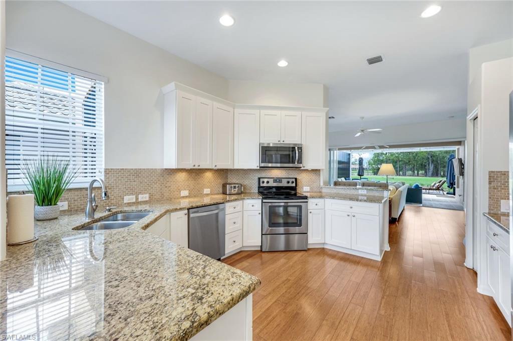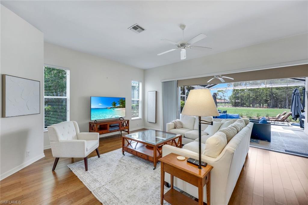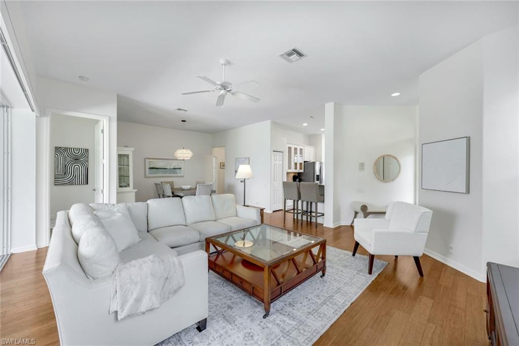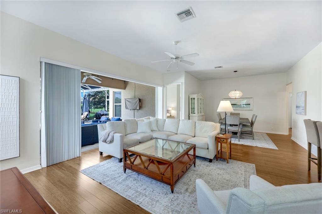 Full golf membership included with purchase and green fees for two members are covered by HOA fees. This 3 bdm villa home has an updated open concept kitchen, luxury wood flooring and fresh paint throughout. The sunny lanai offers a wide open sunset view overlooking the 3rd hole tees, a lake and the 2nd hole green. The oversized lanai offers a large covered seating area and plenty of additional outdoor space with picture window screening for a more open view. There is plenty of room to add a pool if desired. The large living space opens directly to the lanai with wall to wall sliders that open up fully. Vanderbilt Country Club is a premier bundled golf community that is financially stable and very social with extensive and updated resort-like amenities. The main Clubhouse and the Terrace Cafe and Bar at the pool offer many dining options. The 5100 sq ft Fitness Center has a 2200 sq ft gym with state of the art equipment and personal training. The facility also houses a large exercise room with many fitness classes as well as treatment rooms for physiotherapy, massage and facial services. There is an large tennis community with six lighted Har-Tru tennis courts. Bocce courts have recently been added to the newly built pool area. Pickleball also has active participation and plans are in the works to expand those facilities.