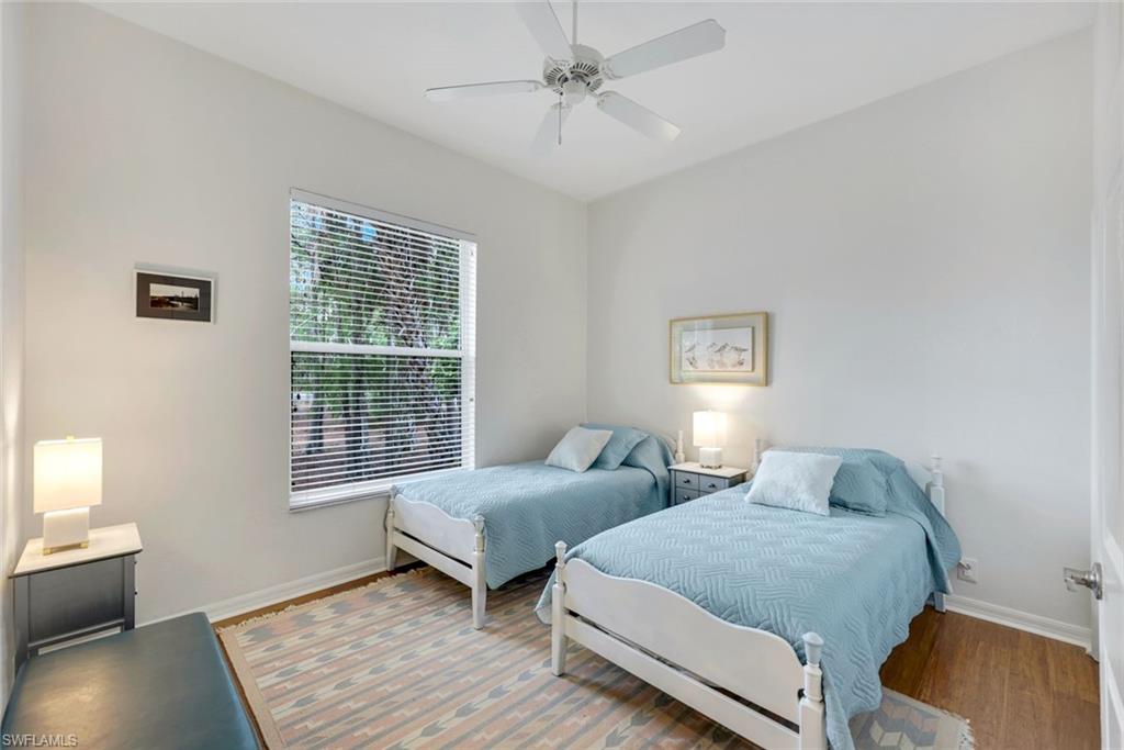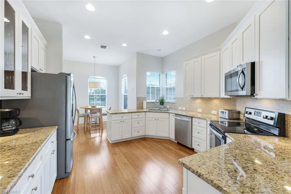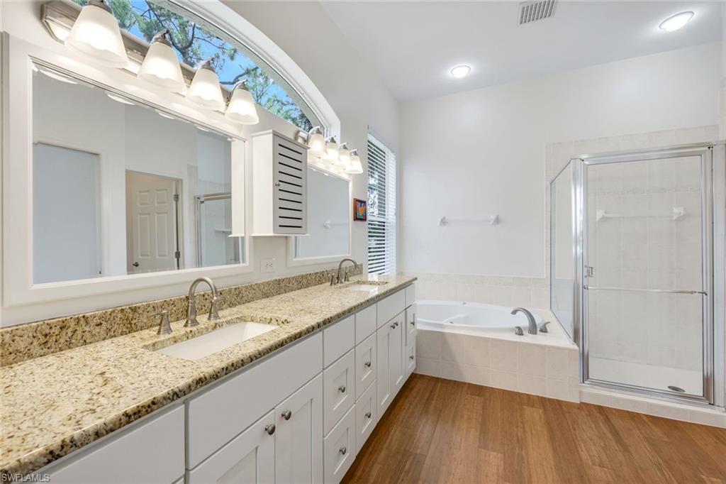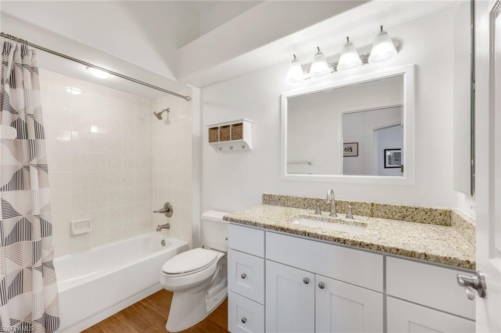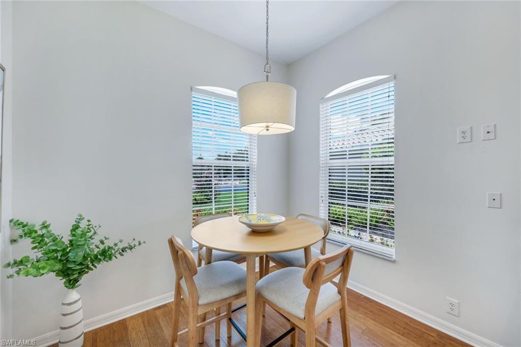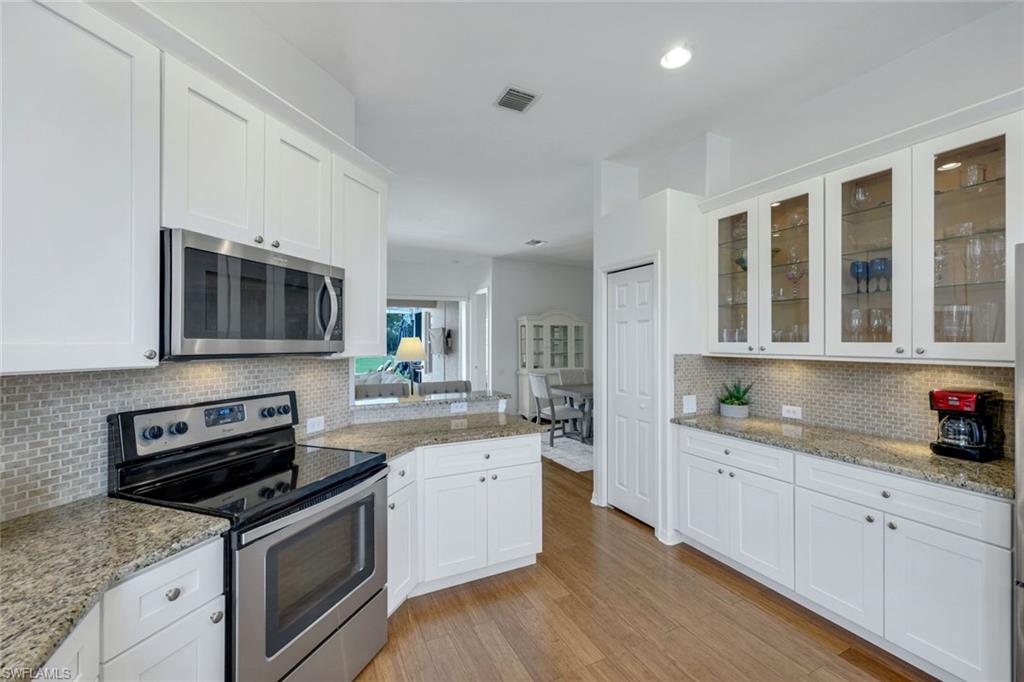 Full golf membership included with purchase and green fees for two members are covered by HOA fees. This 3 bdm villa home has an updated open concept kitchen, luxury wood flooring and fresh paint throughout. The sunny lanai offers a wide open sunset view overlooking the 3rd hole tees, a lake and the 2nd hole green. The oversized lanai offers a large covered seating area and plenty of additional outdoor space with picture window screening for a more open view. There is plenty of room to add a pool if desired. The large living space opens directly to the lanai with wall to wall sliders that open up fully. Vanderbilt Country Club is a premier bundled golf community that is financially stable and very social with extensive and updated resort-like amenities. The main Clubhouse and the Terrace Cafe and Bar at the pool offer many dining options. The 5100 sq ft Fitness Center has a 2200 sq ft gym with state of the art equipment and personal training. The facility also houses a large exercise room with many fitness classes as well as treatment rooms for physiotherapy, massage and facial services. There is an large tennis community with six lighted Har-Tru tennis courts. Bocce courts have recently been added to the newly built pool area. Pickleball also has active participation and plans are in the works to expand those facilities.