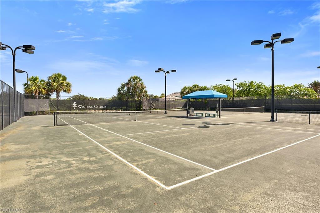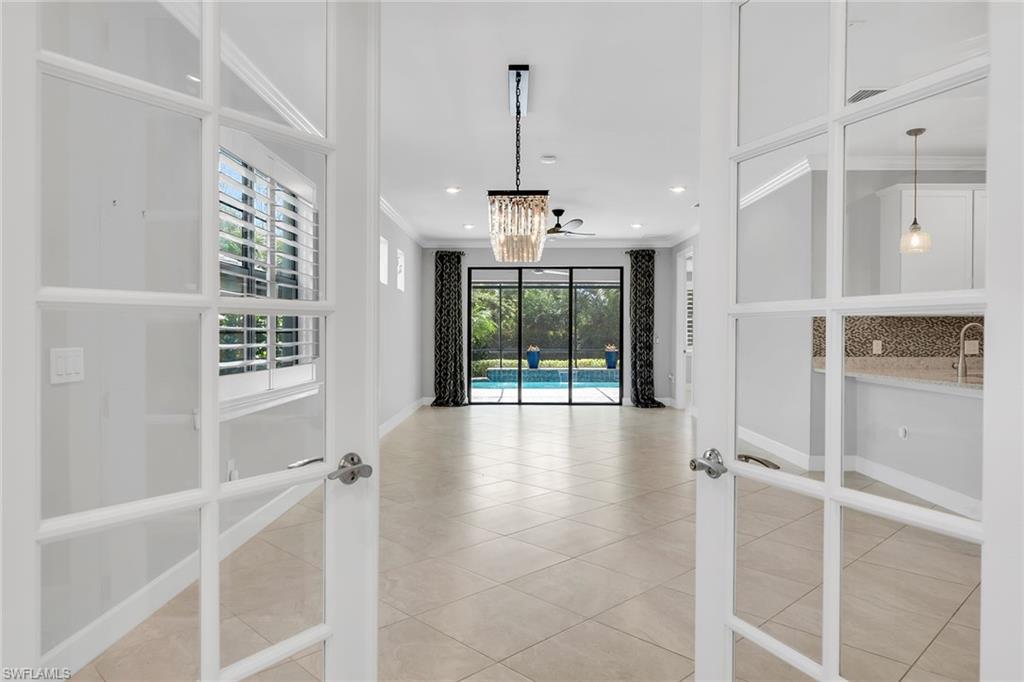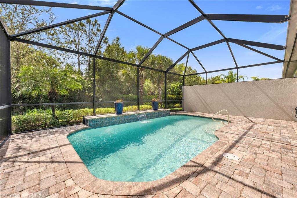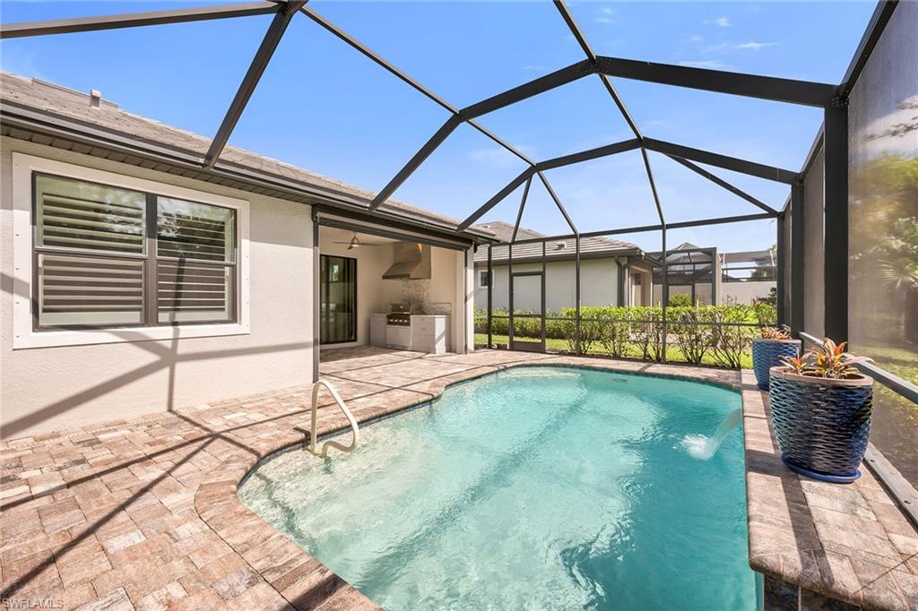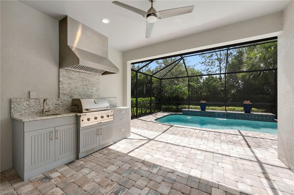 Set against private garden views with tranquil eastern exposure, this beautifully appointed villa in Winding Cypress offers a peaceful retreat and effortless indoor-outdoor living. Featuring two bedrooms plus a den, two baths, and a two-car garage, this thoughtfully designed residence combines quiet luxury with meticulous updates in one of Naples’ most dynamic lifestyle communities. The screened lanai is ideal for entertaining or unwinding, complete with brick paver flooring, a saltwater pool with waterfall feature, pool heater, and recent upgrades including a new salt generator and pool pump. A custom outdoor kitchen with a stainless steel gas grill with matching hood and sink further enhances the outdoor living experience. Electric hurricane shutters protect the lanai, while manual shutters cover the remainder of the home. Inside, tile flooring extends throughout, accented by crown molding, recessed lighting, and white plantation shutters. The living room opens to the lanai through expansive glass sliders, anchored by a modern ceiling fan. The kitchen features white Shaker-style cabinetry, quartz countertops, a tile backsplash, pantry, and stainless steel appliances including a gas range, refrigerator with icemaker, microwave, and dishwasher. A modern chandelier defines the dining area, which flows easily into the main living space. The primary suite is a private haven with a tray ceiling, garden views, custom closet, and a spa-inspired bath featuring dual quartz vanities, full-width mirrors, and a frameless glass walk-in shower. The second bedroom includes a walk-in closet and an adjacent bath with a shower-tub combination. A den with French doors offers flexible space for a home office or reading room. Additional highlights include a mini-split air conditioning system in the garage, a brand-new water heater, and recent property updates including a full exterior repaint (approximately two years ago) and interior paint touch-ups. Residents of Winding Cypress enjoy access to resort-style amenities including a pool, an attended fitness center, an on-site restaurant, five tennis courts, four bocce ball courts, four pickleball courts, a community garden, and a dog park. With a vibrant social calendar, low HOA fees, rental-friendly policies, and a prime location near Marco Island, downtown Naples, 5th Avenue, and I-75, this villa offers elevated living in a premier Naples community.