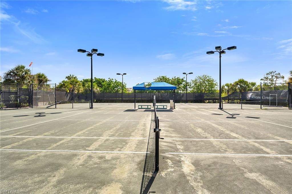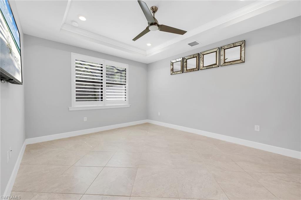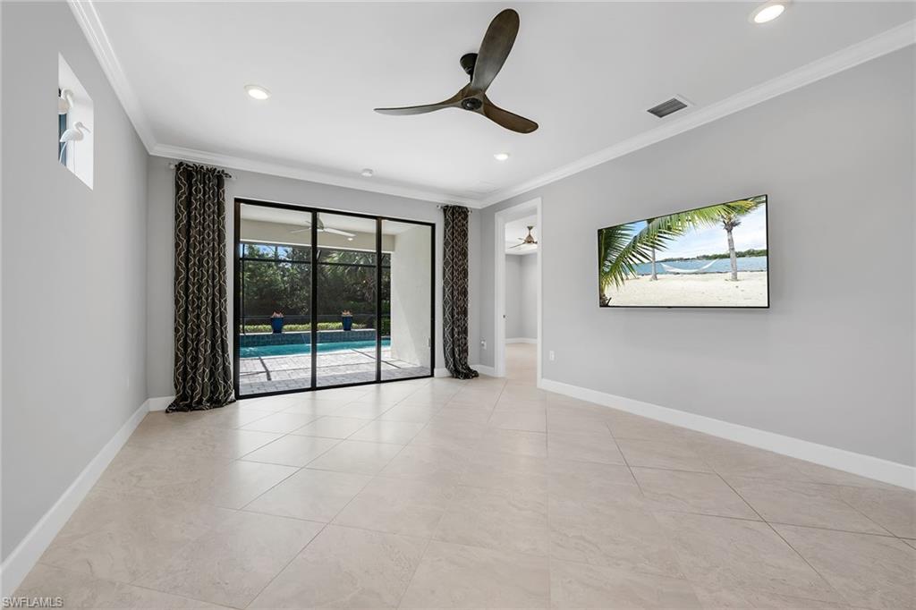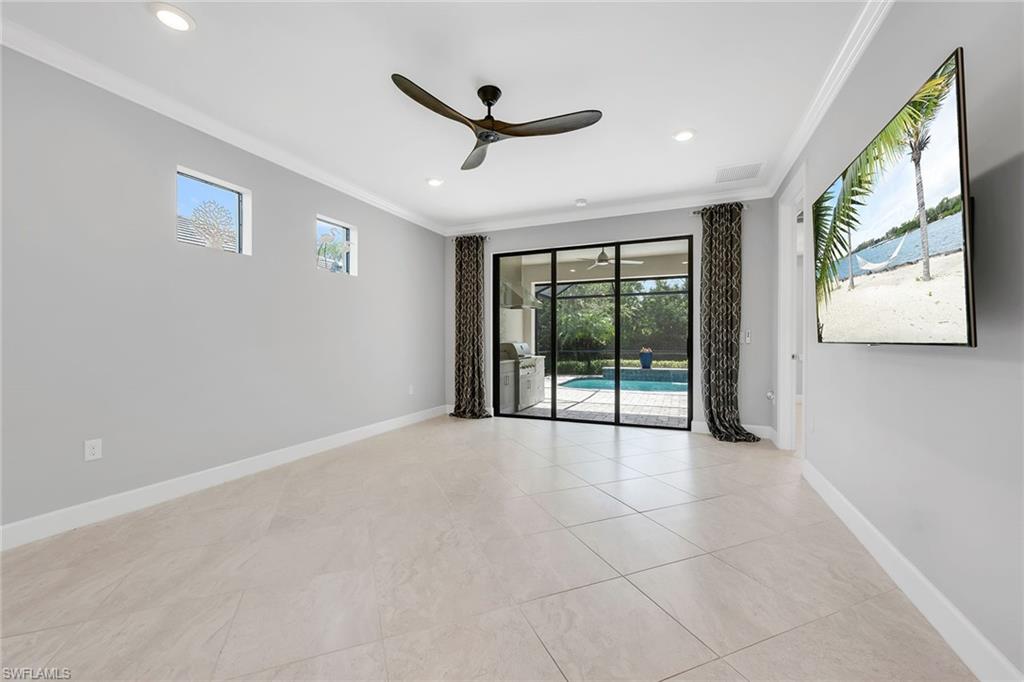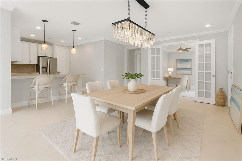 Set against private garden views with tranquil eastern exposure, this beautifully appointed villa in Winding Cypress offers a peaceful retreat and effortless indoor-outdoor living. Featuring two bedrooms plus a den, two baths, and a two-car garage, this thoughtfully designed residence combines quiet luxury with meticulous updates in one of Naples’ most dynamic lifestyle communities. The screened lanai is ideal for entertaining or unwinding, complete with brick paver flooring, a saltwater pool with waterfall feature, pool heater, and recent upgrades including a new salt generator and pool pump. A custom outdoor kitchen with a stainless steel gas grill with matching hood and sink further enhances the outdoor living experience. Electric hurricane shutters protect the lanai, while manual shutters cover the remainder of the home. Inside, tile flooring extends throughout, accented by crown molding, recessed lighting, and white plantation shutters. The living room opens to the lanai through expansive glass sliders, anchored by a modern ceiling fan. The kitchen features white Shaker-style cabinetry, quartz countertops, a tile backsplash, pantry, and stainless steel appliances including a gas range, refrigerator with icemaker, microwave, and dishwasher. A modern chandelier defines the dining area, which flows easily into the main living space. The primary suite is a private haven with a tray ceiling, garden views, custom closet, and a spa-inspired bath featuring dual quartz vanities, full-width mirrors, and a frameless glass walk-in shower. The second bedroom includes a walk-in closet and an adjacent bath with a shower-tub combination. A den with French doors offers flexible space for a home office or reading room. Additional highlights include a mini-split air conditioning system in the garage, a brand-new water heater, and recent property updates including a full exterior repaint (approximately two years ago) and interior paint touch-ups. Residents of Winding Cypress enjoy access to resort-style amenities including a pool, an attended fitness center, an on-site restaurant, five tennis courts, four bocce ball courts, four pickleball courts, a community garden, and a dog park. With a vibrant social calendar, low HOA fees, rental-friendly policies, and a prime location near Marco Island, downtown Naples, 5th Avenue, and I-75, this villa offers elevated living in a premier Naples community.
