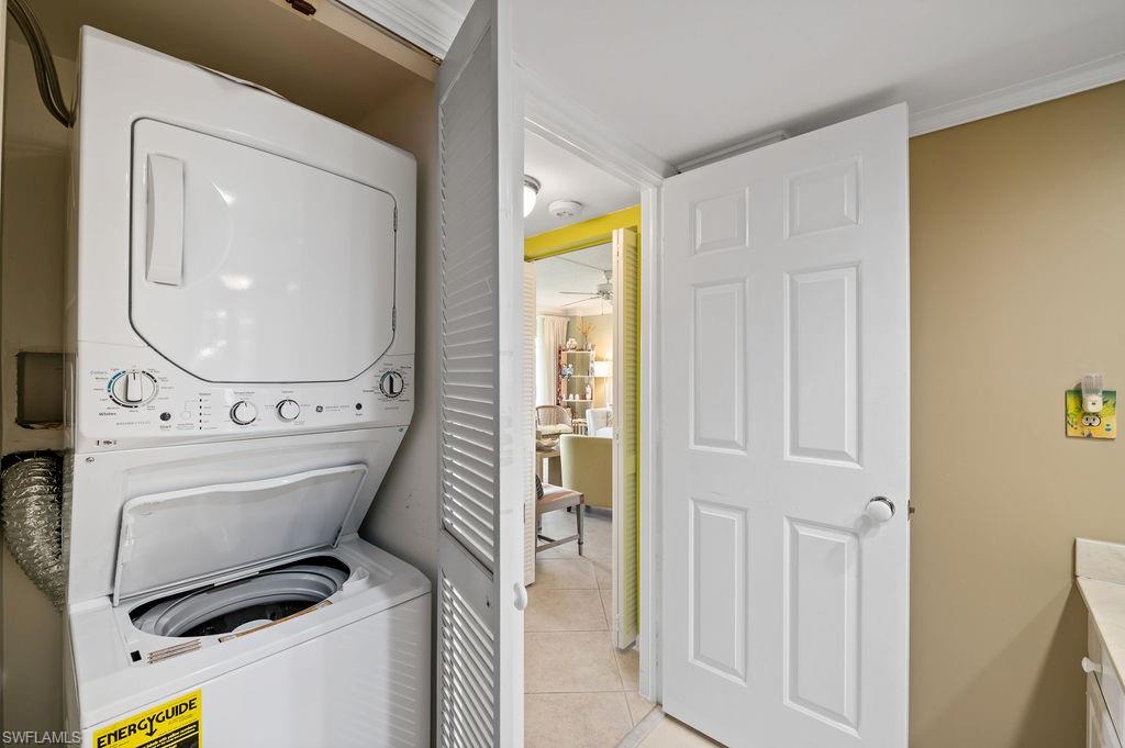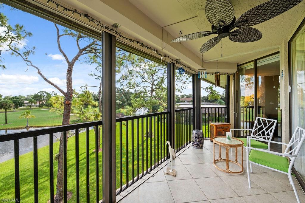 Stunning Lake and Golf Course Views from Your Private Lanai! NEW ROOF!! Enjoy resort-style living with breathtaking views of the 17th hole and fairway at Royal Palm Country Club—right from your oversized, screened-in lanai, complete with HURRICANE shutters for peace of mind. This beautifully updated 2-bedroom, 2-bath condo features a desirable split-bedroom floor plan, offering privacy and comfort. Both bedrooms boast large sliding glass doors that open directly to the spacious lanai, filling the home with natural light and seamless indoor-outdoor living. The main living area has been tastefully upgraded with elegant 18-inch tile, while the bedrooms showcase new luxury vinyl plank flooring for a stylish and low-maintenance finish. The kitchen and laundry are enhanced by a brand-new washer and dryer and a new A/C unit ensures comfort year-round. Plus, the new Sleep Number queen bed adds an extra touch of luxury. Your designated covered carport parking space includes a large private storage room—perfect for bikes, golf gear, and beach essentials. The community offers an array of amenities including a heated pool, spa, grill area, and large screened lanai, perfect for socializing or unwinding after a round of golf. All this, just minutes from downtown Naples, beautiful Gulf beaches, shopping, and dining!