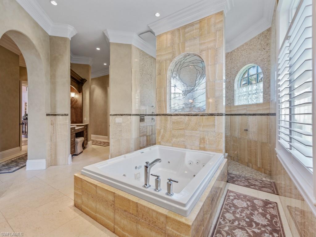 Luxurious custom residence in the scenic Collier Bay neighborhood with fast, water direct access (no bridges) to the Gulf by boat. Offering 6,250 interior square feet, this elegant estate has everything you’d expect: thoughtfully designed living spaces, 6 luxurious bedrooms plus a private study, 7 baths, high-end finishes including marble travertine flooring, custom built-ins, gas fireplaces & designed with an exceptional indoor-outdoor flow. Catering perfectly to boaters and entertainers alike with a resort-style pool & spa and loads of upgrades. The gourmet kitchen is outfitted with shaker-style cabinetry, granite countertops, a wet bar, large island, and walk-in pantry, premium appliances include a six-burner gas cooktop with pot filler, wall oven, microwave, paneled French door refrigerator, dishwasher, and wine fridge. The adjacent dining area features pool views, plantation shutters, and easy lanai access. There are two living rooms, one with floor-to-ceiling windows to enjoy the natural light, plus an upstairs media room offer generous spaces for relaxation. The formal dining room is accessed through French doors, the luxurious owner’s suite features a bay window overlooking the pool and canal, sitting areas, large walk-in closets with built-ins, and a spa-like bath with quartz vanity, natural onyx tile, dual sinks, a spacious walk-in shower with multiple heads, and soaking tub. All guest suites include ensuite baths with frameless walk-in showers. There are two laundry areas and the guest suites upstairs have private balconies and there is even a 3rd level loft suite with balconies & bay views. For boating enthusiasts, the dual dock includes a 56,000-pound boat lift, dual jet ski lift, and a fish cleaning station. Enjoy sunny SE exposure, impact glass windows, electric shutters, & a spacious 3-car air-conditioned garage. Outdoor living is unparalleled with multiple balconies, a screened lanai, and a covered entertainment area complete with a summer kitchen, bar, grill, & refrigerator. The heated pool with waterfall spa is complemented by a convenient pool bath & the elevator provides seamless access to all three levels. This exceptional estate blends luxury, comfort, and coastal living, offering the ultimate island lifestyle next to scenic Collier Bay & is just around the corner from the sugar sand at Tigertail Beach!