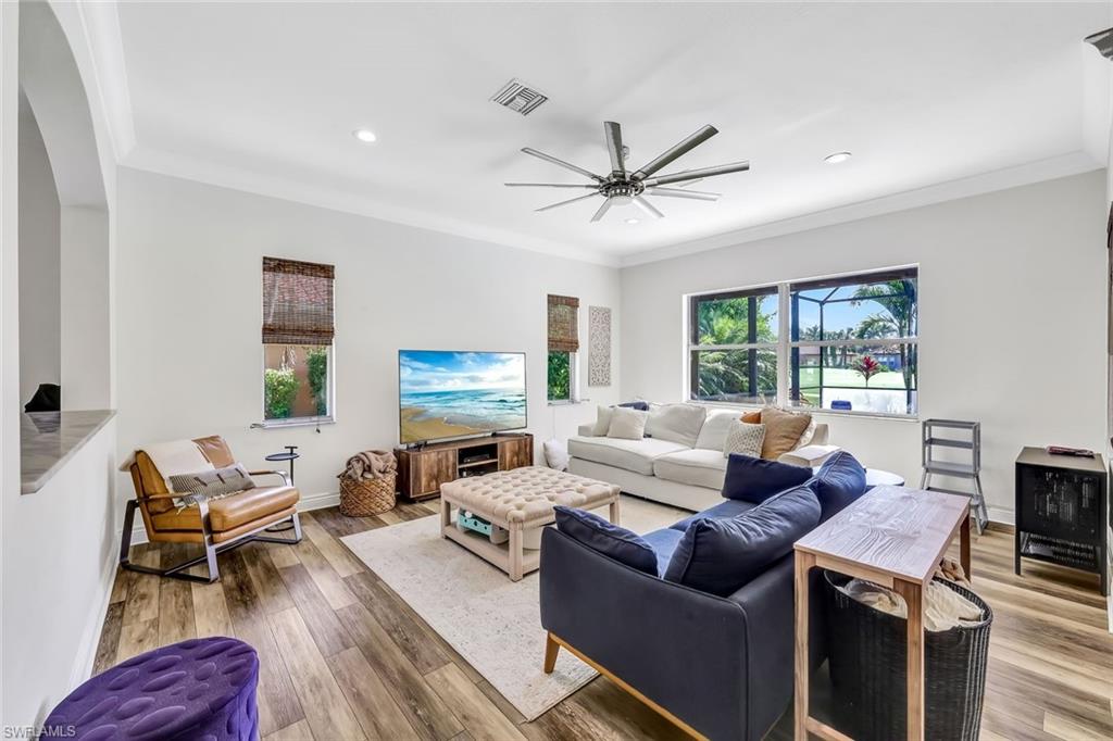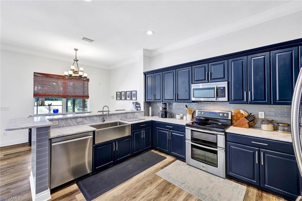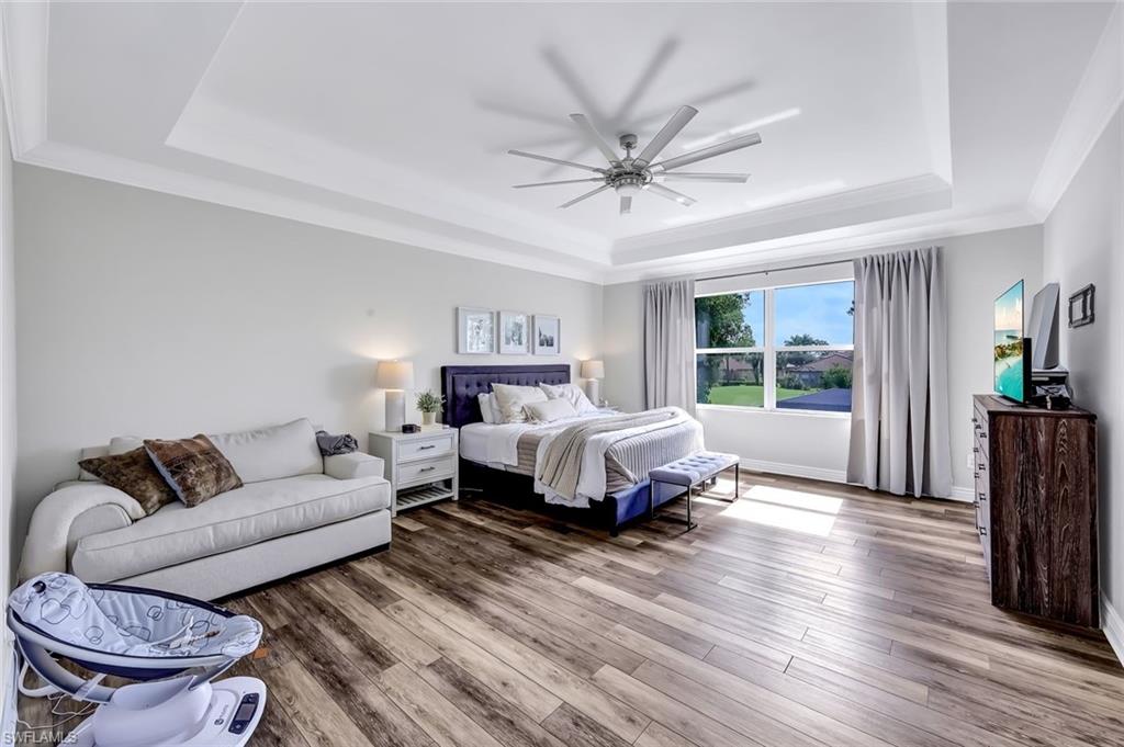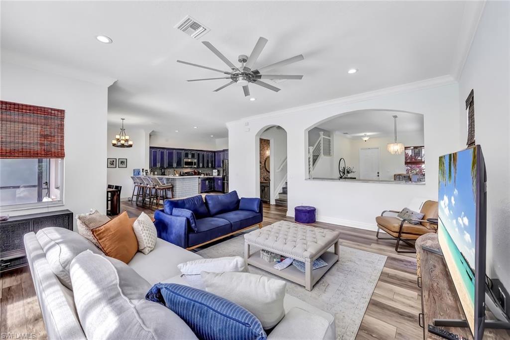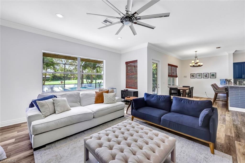 Not in a Flood Zone, no flood insurance required. Big dogs allowed with approval.Experience unparalleled elegance and tranquility in this exquisite two-story estate, perfectly situated overlooking the serene 2nd hole of a prestigious golf course. This meticulously maintained residence boasts over 3,000 square feet of refined living space, seamlessly blending indoor sophistication with resort-style outdoor living. Step into your private backyard sanctuary, where a stunning custom pool and six-person spa—added in 2017—create a captivating centerpiece surrounded by lush, tropical landscaping. The expansive screened lanai, enhanced with an extended covered area and recently updated with mostly new screens, invites year-round relaxation and entertaining. Travertine tile extends gracefully throughout the lanai and along both sides of the home, where sidewalks lead back to the pool area, creating easy access and elegant flow. This walkway guides you to a stately front entrance, completing the home’s welcoming curb appeal. Inside, the grand master suite is a haven of luxury, featuring dual walk-in closets and a spa-inspired split bathroom layout adorned with bespoke cabinetry, quartz countertops, dual vanities, separate shower, and a freestanding soaking tub—promising ultimate indulgence. The versatile second-floor loft offers abundant space for a home office, game room, or private fitness studio. Throughout the home, premium luxury vinyl plank flooring and designer tile bathrooms complement elegant crown molding, evoking a sophisticated Florida coastal ambiance. The chef’s kitchen is outfitted with a charming farmhouse sink and modern appliances, perfectly blending style and functionality. Recent high-end upgrades include a new pool heater (2025), state-of-the-art pool pump and control board, and a whisper-quiet, contemporary garage door that enhances curb appeal. Nestled within a gated community renowned for its outstanding amenities—including a clubhouse, fitness center, theater, billiards room, and community pool—this residence offers a lifestyle defined by comfort, exclusivity, and convenience. With premier schools just a short walk or bike ride away, this home is perfectly suited for discerning families seeking timeless elegance and an exceptional Florida living experience.