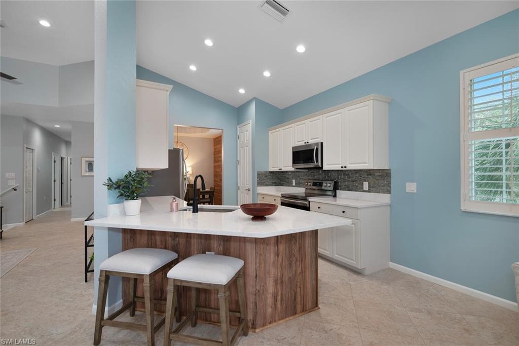 Welcome home to this stunning second-floor coach home, where luxury meets comfort. This beautifully appointed and tastefully updated residence features three spacious bedrooms, two bathrooms, and a one-car, attached garage in the prestigious and centrally located Shadow Wood at the Brooks. This is a must-see home that offers the perfect blend of luxury, comfort, and serene Florida living. An gorgeous western exposure offers breathtaking views and the perfect backdrop from the large lanai that is ideal for sipping coffee in the morning, enjoying beverages in the evening, a peaceful outdoor dining experience and/or entertaining guests in comfort and elegance. Step inside and immediately feel at home with the bright, open floor plan, featuring sleek tile flooring throughout, vaulted ceilings, beautiful quartz countertops and stainless appliances in the open kitchen, elegant plantation shutters on the windows and so much more! The split floor plan is ideal for visiting friends and family as it offers comfort and privacy for all! Additional features include a brand-new A/C system (2025) hurricane impact windows throughout (2024) and electric storm shutters on the lanai. An added BONUS: New roofs and freshly painted buildings coming soon with NO assessments!! The home is offered furnished (with a few exclusions) so move right in and begin to live your dream! At Shadow Wood, golf membership is available but not required. Residents of the Brooks have the option of joining the tier-level Commons club that comes with a private beach club, state-of-the-art fitness center, a private restaurant and much more. Shadow Wood is a vibrant and luxurious community that is centrally located and easily accessible to fine dining, shopping, medical facilities and RSW. Don’t miss your opportunity to make this gem your home!