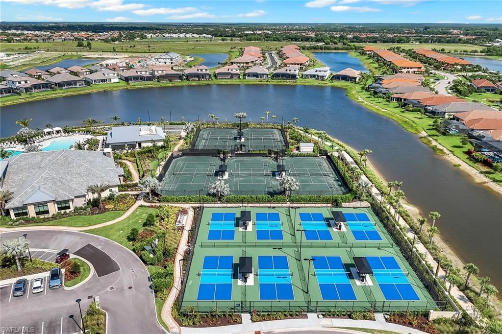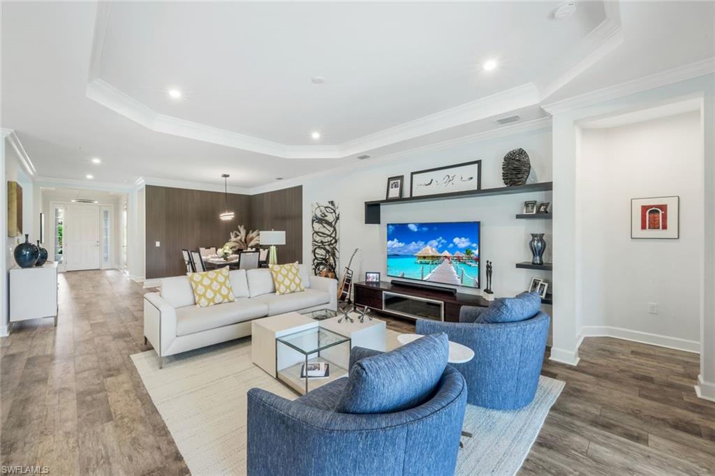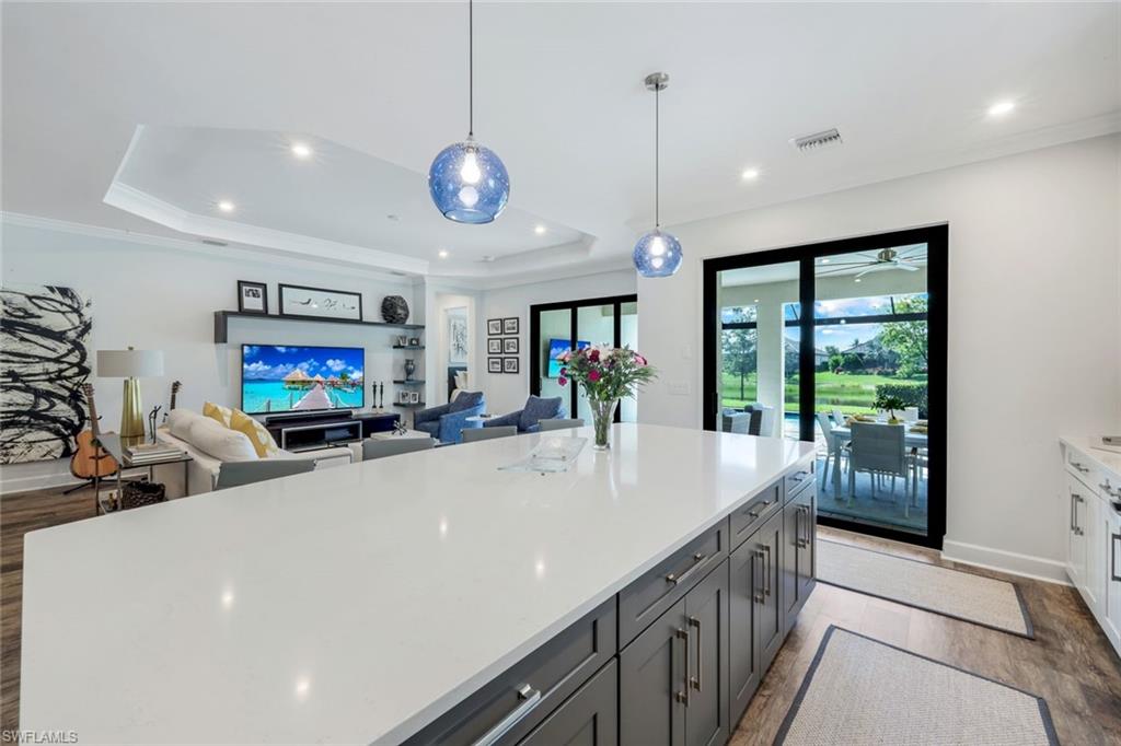 MOVE-IN READY! LIGHTLY LIVED IN - LIKE NEW HOME WITH NO PUNCH LIST! Welcome to the modern Lazio model home, a masterfully designed three-bedroom, plus den, three-bath, pool home, set within the lifestyle-rich community of the Esplanade by the Islands. This elegant residence is move-in ready which includes the furniture, offers volume ceilings, clean lines and contemporary-upgraded finishes. Enhanced details include: laminate wood-look flooring (NO CARPET), upgraded cabinetry, quartz countertops, high-impact windows and more. Character-rich custom elements in the home include the raised-panel wood accent slat-wall in the dining area, designer light fixtures, tailor-made den bookcase, custom trim and crown molding... all which blend and balance warmth with modern, throughout the home. The gourmet kitchen is a cook's dream showcasing quartz countertops, expansive island for both prep and gathering, GE appliances and a natural gas cookstove. Additional highlights include a double-car garage, a spacious den/office, an open-concept layout that invites natural light and effortless flow of the home. The spacious outdoor living space can be tranquil and relaxing with a book by the pool and gleam of the lake or it can be fun and entertaining with friends and family. The Esplanade by the Islands amenities include tennis and pickleball, full fitness center, eight miles of walking trails, dining and pool & spa and more. The community was inspired by its sister property, Esplanade Golf an Immokalee Road and aspires to create a luxurious lifestyle. This home is located close to downtown Old Naples and Marco Island.