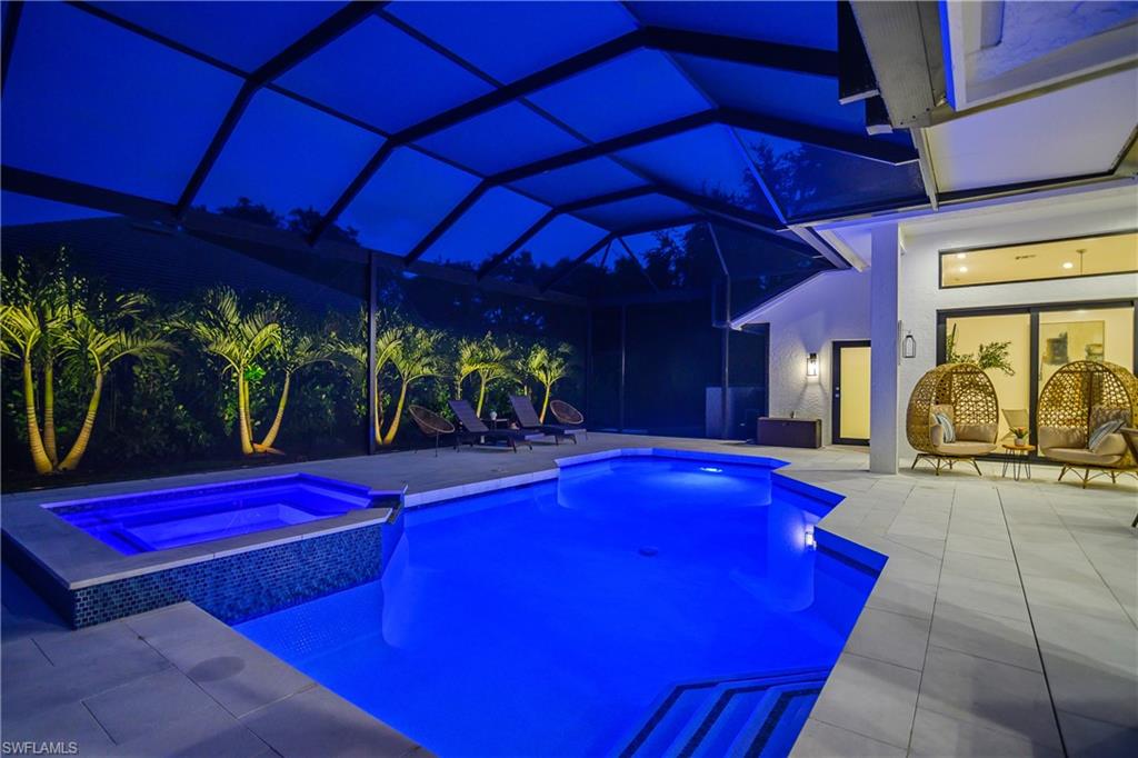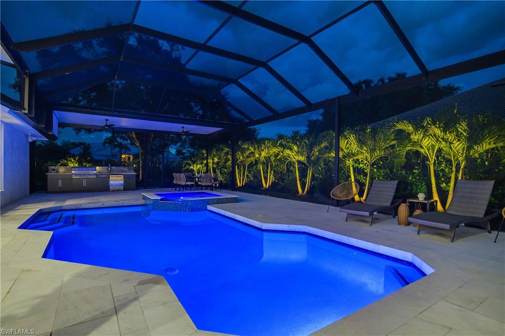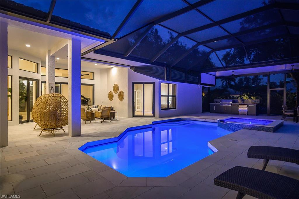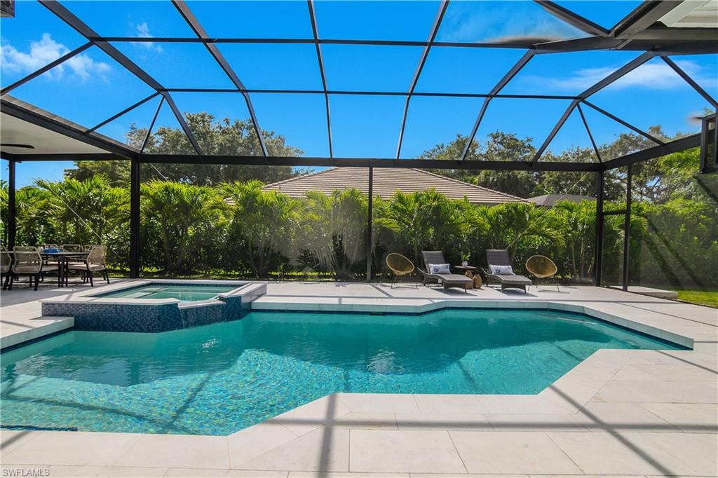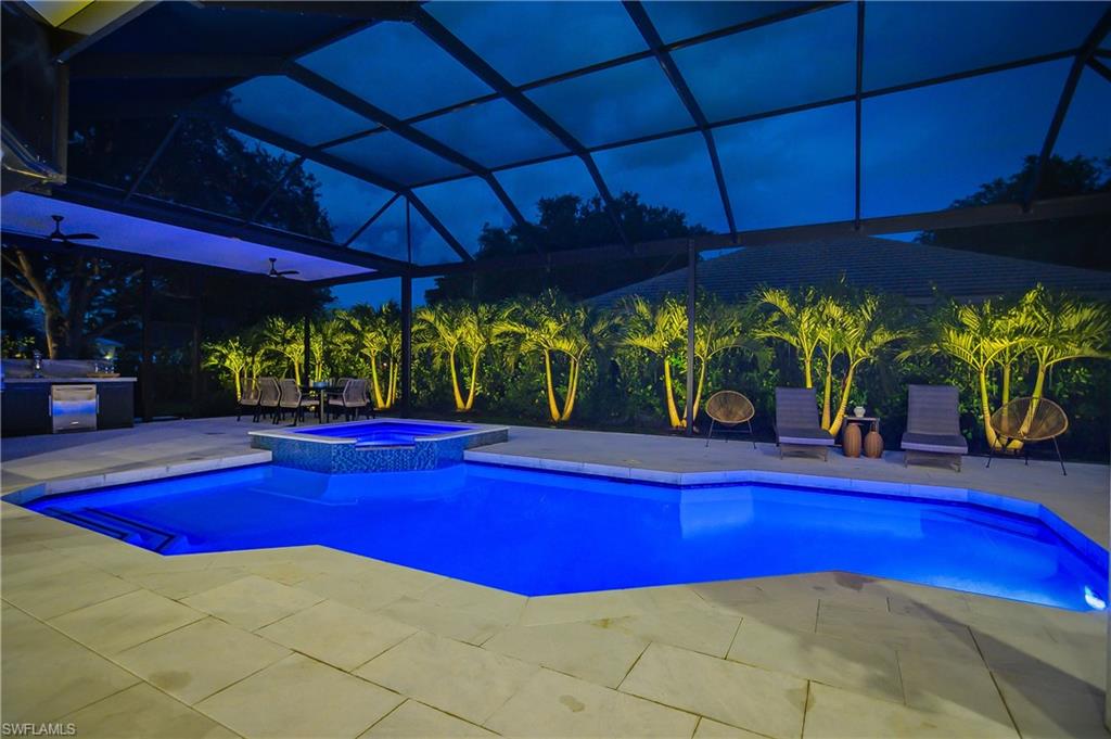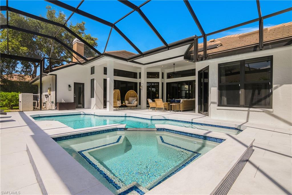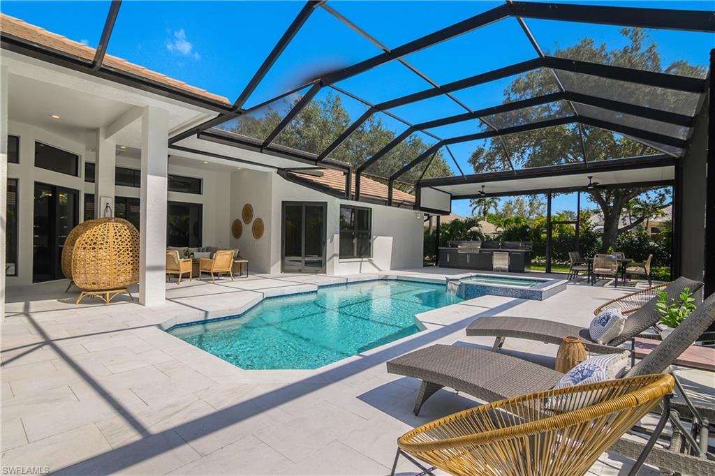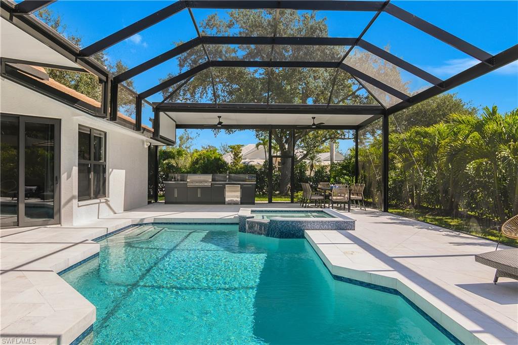 Luxurious, private, and serene, this beautifully renovated home is an oasis nestled in a desirable, quiet location within the heart of the coveted neighborhood of Monterey. Thoughtfully updated & meticulously maintained both inside and out, this home enjoys an abundance of light with soaring 11.5 foot ceilings, top-of-the-line finishes and premium appliances. At the heart of the home, a custom 11 foot island anchors the well-equipped chef's kitchen with sleek floor-to-ceiling custom cabinetry with NEW JennAir RISE appliances, including 48” refrigerator, gas range and double wall oven with convection/microwave. The renovated bathrooms have been gorgeously updated with Taj Mahal quartzite countertops and custom cabinetry. A dedicated office with floor-to-ceiling custom built-in cabinetry offers a stylish and functional work/flex space. Step outside to your own private sanctuary, complete with NEW stunning picture-window screen cage with unique & functional shade/rain protection roof systems, NEW outdoor kitchen, & NEWLY refinished pool/spa, all framed by lush hedges and tropical palms with dramatic landscape lighting. Countless upgrades provide efficiency as well as peace of mind, including NEW impact windows & doors, NEW A/C, NEW instant hot water heater, NEW pool equipment, NEW paver driveway, newer roof and more! With 24-hour gate guard, 3 har tru tennis courts, community pool/clubhouse, sport/pickleball court, neighborhood events & just minutes to beaches, downtown, shopping, & schools - Make this your next move!