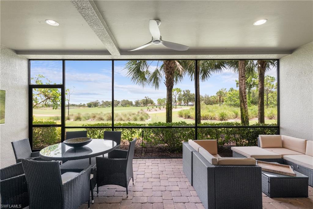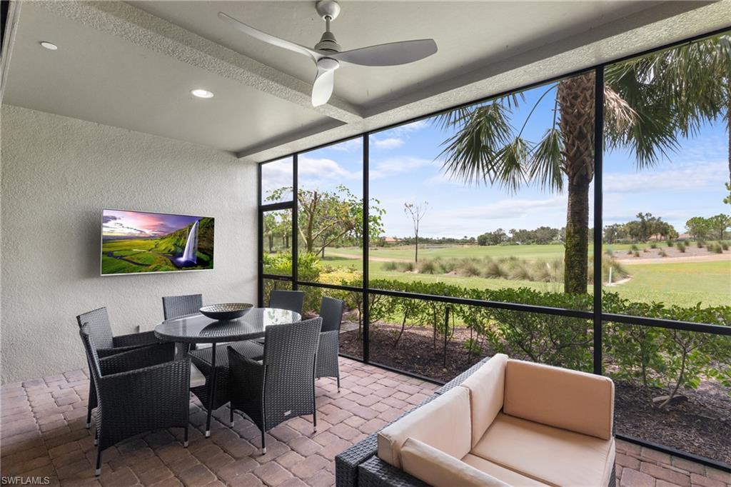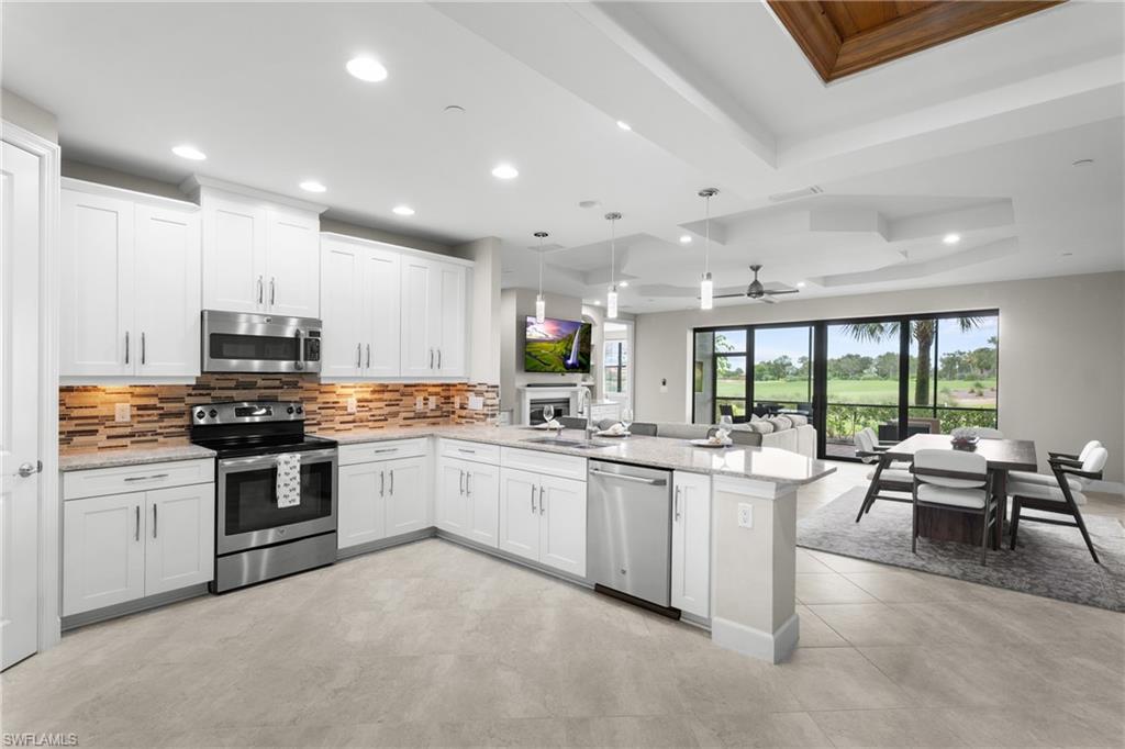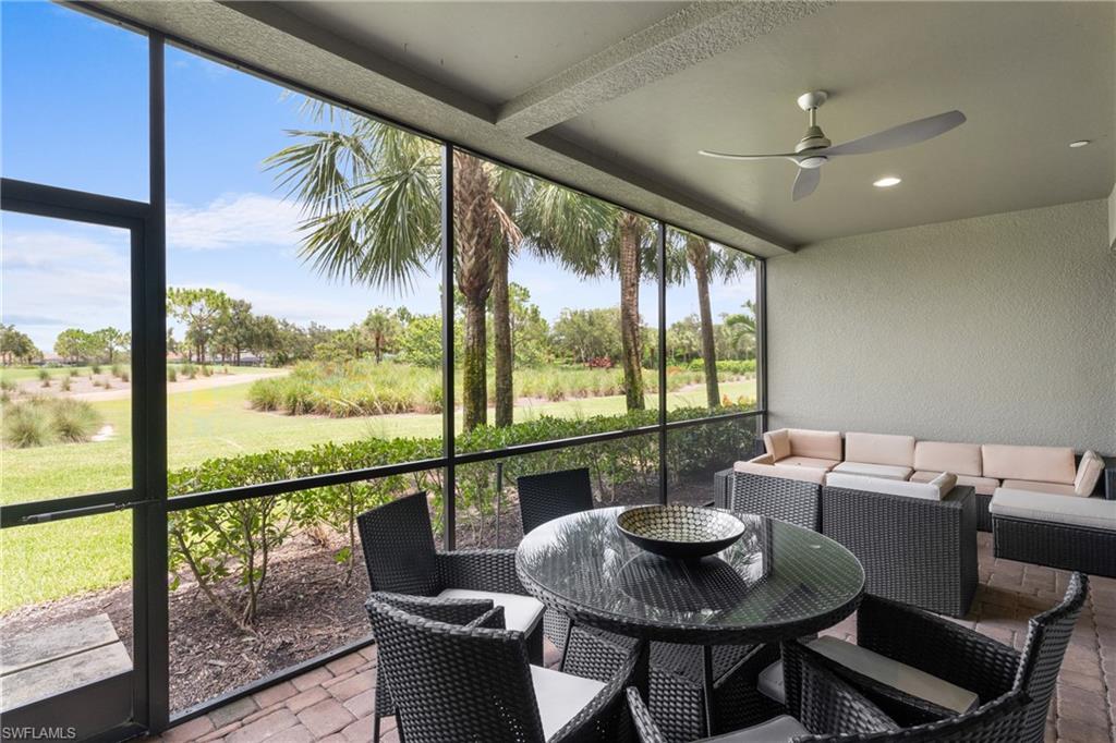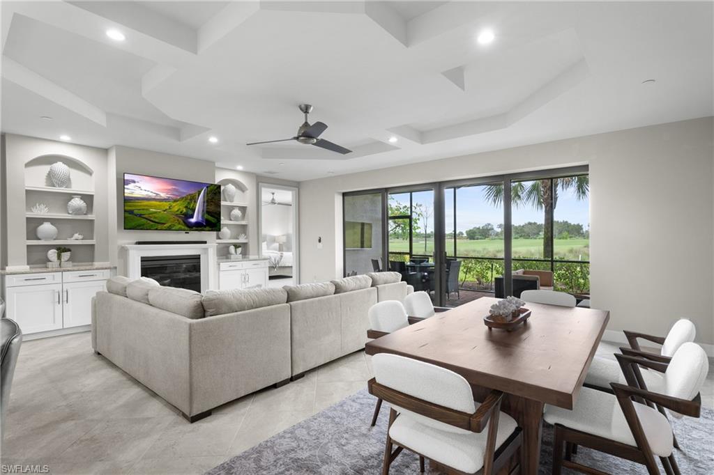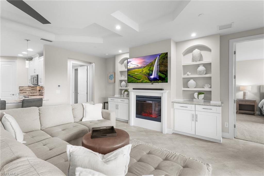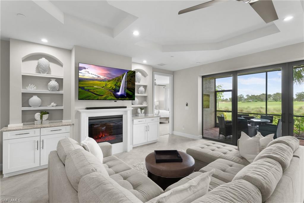 Searching for a modern-style coach home with a FULL GOLF MEMBERSHIP and GOLF CART included? This beautifully furnished 2-bedroom, 2-bath first-floor coach home in Esplanade Golf & Country Club combines contemporary style with over 1,700 square feet of meticulously maintained open living space. From the spacious screened lanai, take in stunning views of the 8th green while enjoying your favorite meals/beverages. Inside, the home is thoughtfully designed with light quartz countertops, diagonal tile flooring, a cozy fireplace, high-impact windows/doors, tray ceilings, and upgraded glass shower doors in the guest bathroom. The kitchen features upgraded white cabinetry, brand new stylish pendant lighting over the island, 42" white cabinets and a generous walk-in pantry. The primary suite is spacious and tranquil, offering a custom built-in closet, dual sinks, and a walk-in shower. The guest bedroom is nearly equal in size, comfortably fitting two queen beds, and includes its own private bath and custom built-in closet. The one-car garage provides more space than any other of coach home models and the HVAC system was replaced within the past year, offering peace of mind. While never rented, this home presents strong rental potential with peak season rates exceeding $9,000 per month. Renters can enjoy full golf access with a paid transfer fee. The property sits on a quiet, landscaped street just steps from the nearby community pool and gas grills—ideal for relaxing or socializing. Esplanade Golf & Country Club recently earned national recognition for its entrance landscaping and offers residents an unmatched resort-style lifestyle. Amenities include a championship golf course, a resort-style pool with cabanas and poolside food and drink service, a state-of-the-art clubhouse, tennis and pickleball courts, walking and biking trails, a dog park, full-service spa and salon, fitness and wellness centers, a tiki bar, and much more. Located in desirable North Naples, Esplanade is close to I-75, Southwest Florida International Airport, fine dining, shopping, and the white-sand beaches of the Gulf. Known for its vibrant social calendar and welcoming community, Esplanade offers the perfect balance of luxury, recreation, and relaxation. This is your opportunity to own an exceptional home in one of Naples’ premier communities and start living the Esplanade lifestyle.