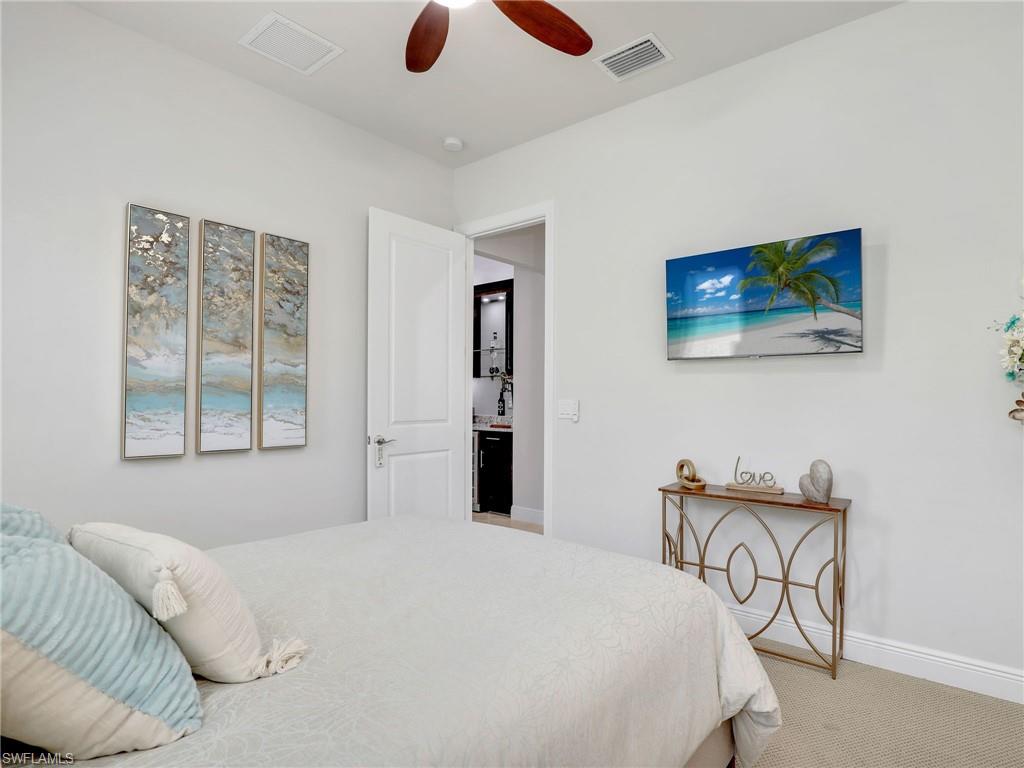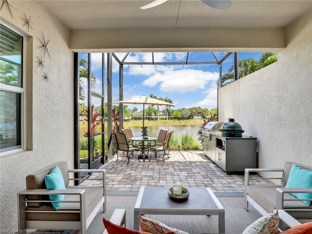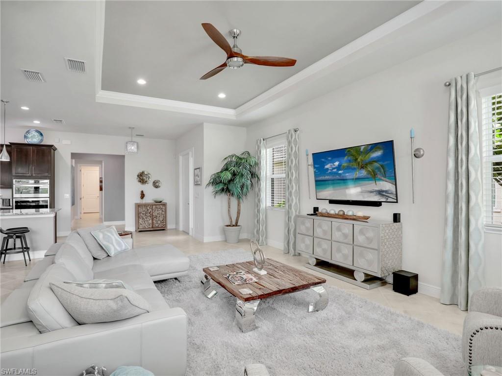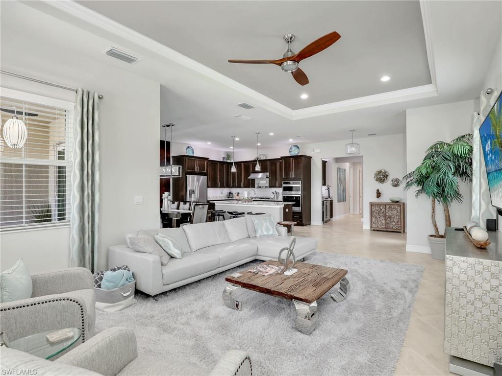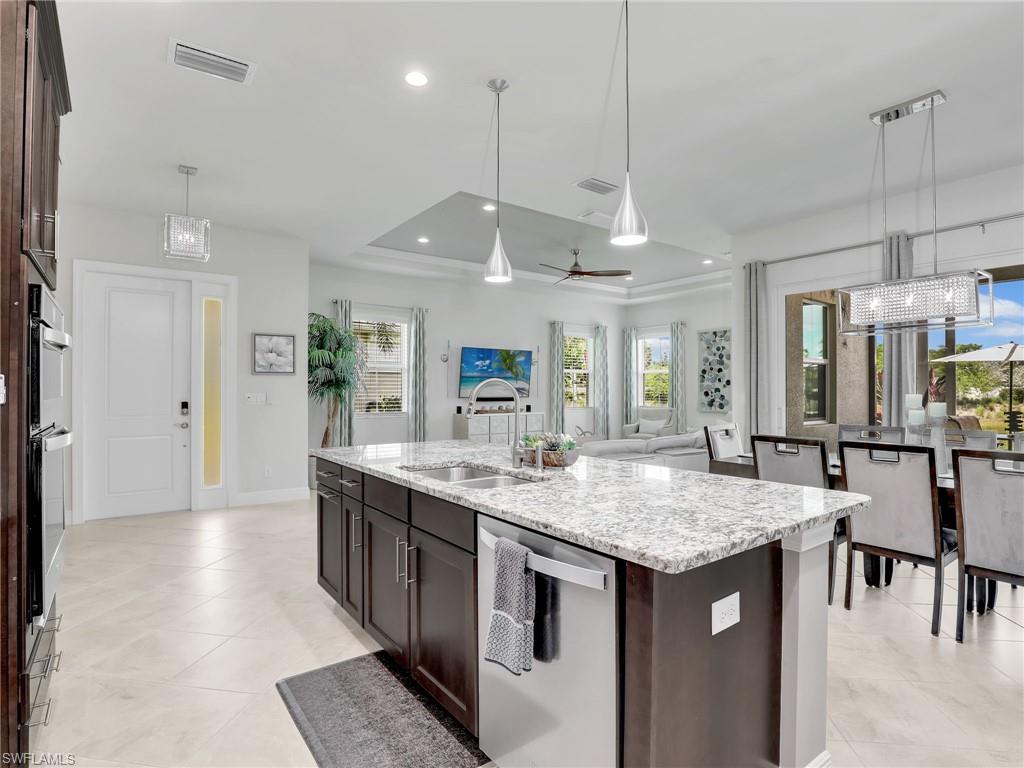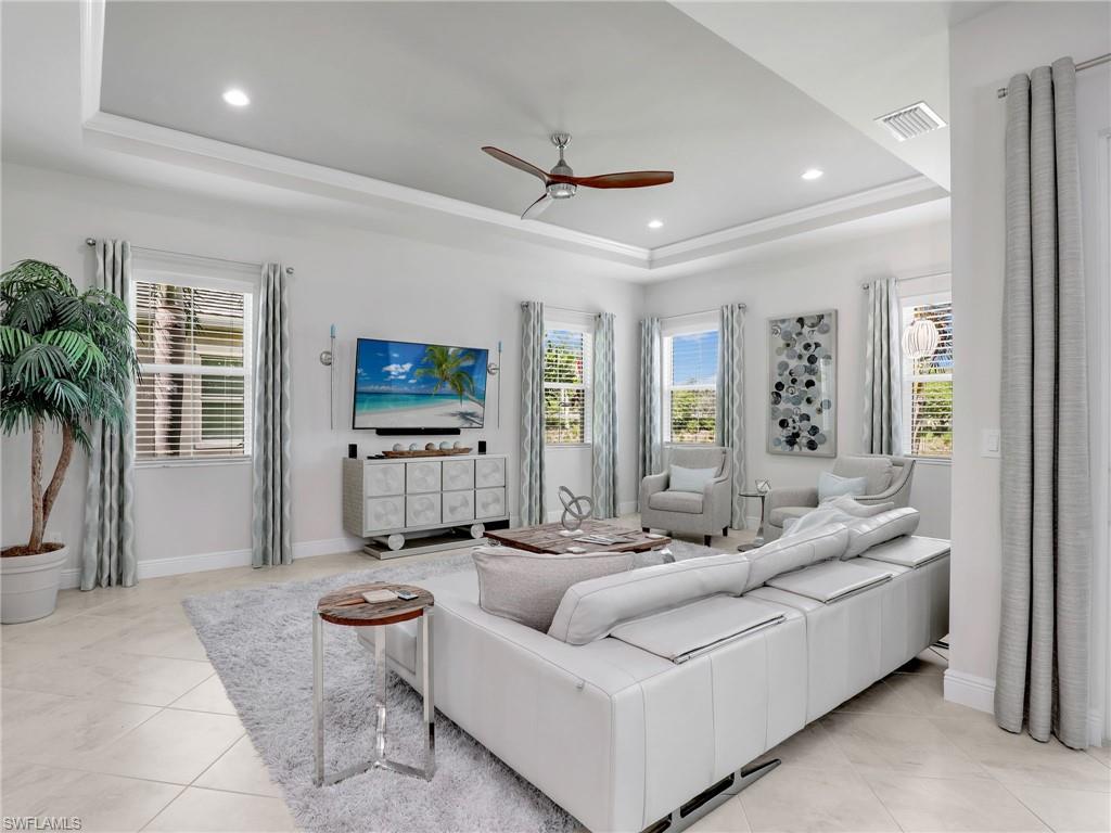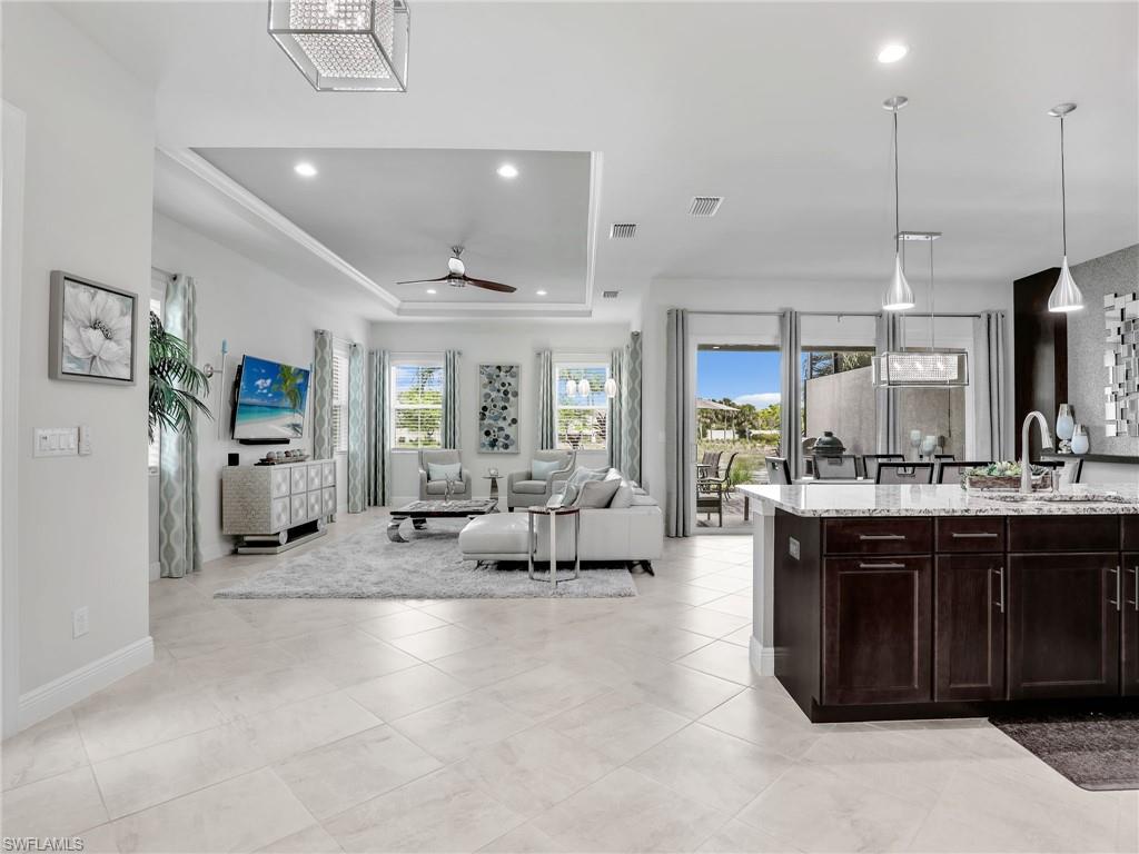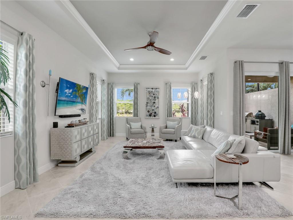 This fully furnished turn key residence blends comfort, design, and thoughtful upgrades throughout, creating an ideal setting for year-round or seasonal living. Built by Toll Brothers, this villa offers just over 1,600 square feet of living space with two bedrooms, two full bathrooms, and a two-car garage. The open-concept layout features square tile flooring in all main living areas and plush carpet in the bedrooms. Natural light fills the interior, accentuated by custom curtains, upgraded light fixtures, and ceiling fans that have been installed throughout the home. The living room offers a warm and inviting space for everyday relaxation and is equipped with a mounted TV, soundbar, and subwoofer. Custom curtains dress the windows, complementing the neutral tones and clean finishes. Just off the living space, the dining area features a stylish custom feature wall, and an upgraded chandelier, perfect for casual meals or hosting guests. The kitchen is outfitted with an upgraded natural gas cooktop, under-cabinet and above-cabinet lighting, and shaker-style cabinetry with sleek quartz counters and a tile backsplash. Adjacent to the kitchen, a custom-designed bar area includes built-in cabinetry, and a dual-zone wine and beverage fridge, adding an upscale and functional element to the living space. The primary suite is a private retreat that features custom curtains, an upgraded closet system, and a mounted TV paired with a soundbar and subwoofer. The en-suite bath has been enhanced with dual shower heads, tile to the ceiling in the walk-in shower, and a new light fixture. The guest bedroom includes its own set of custom curtains, an upgraded closet cabinet, and a mounted TV, while the nearby full bath features a stylish upgraded toilet cabinet. The laundry room has also been improved with the addition of cabinetry for added storage. Each room in the home includes a mounted TV, offering convenience and continuity throughout the space. Additional upgrades include hurricane impact windows throughout the home, an insulated garage door for energy efficiency and quiet operation along with an epoxy garage floor. Step outside to the covered and screened lanai where you can enjoy peaceful views of the manicured backyard. The space is ideal for relaxing or dining outdoors. The exterior of the home is finished in coastal-inspired tones with a paver driveway and mature landscaping that reflects the character of the community .Located directly across from the amenity center, this home has an ideal location! Residents of Azure at Hacienda Lakes have access to a private clubhouse offering resort-style amenities including a pool and spa, fitness center, aerobics studio, tennis and pickleball courts, game and card rooms, and a library. The HOA takes care of lawn care and landscaping, providing a low-maintenance lifestyle.