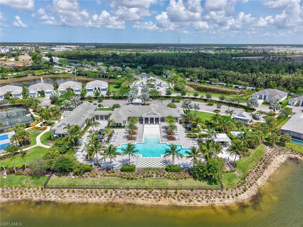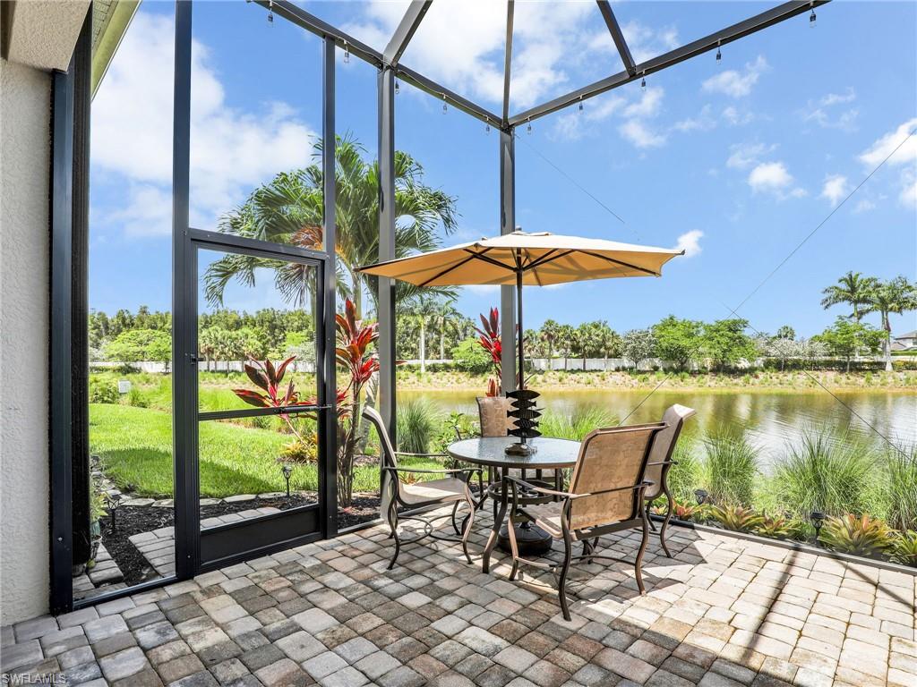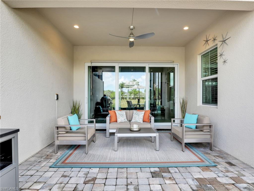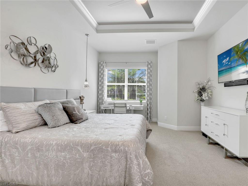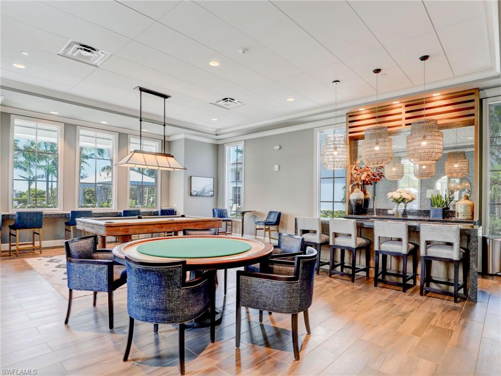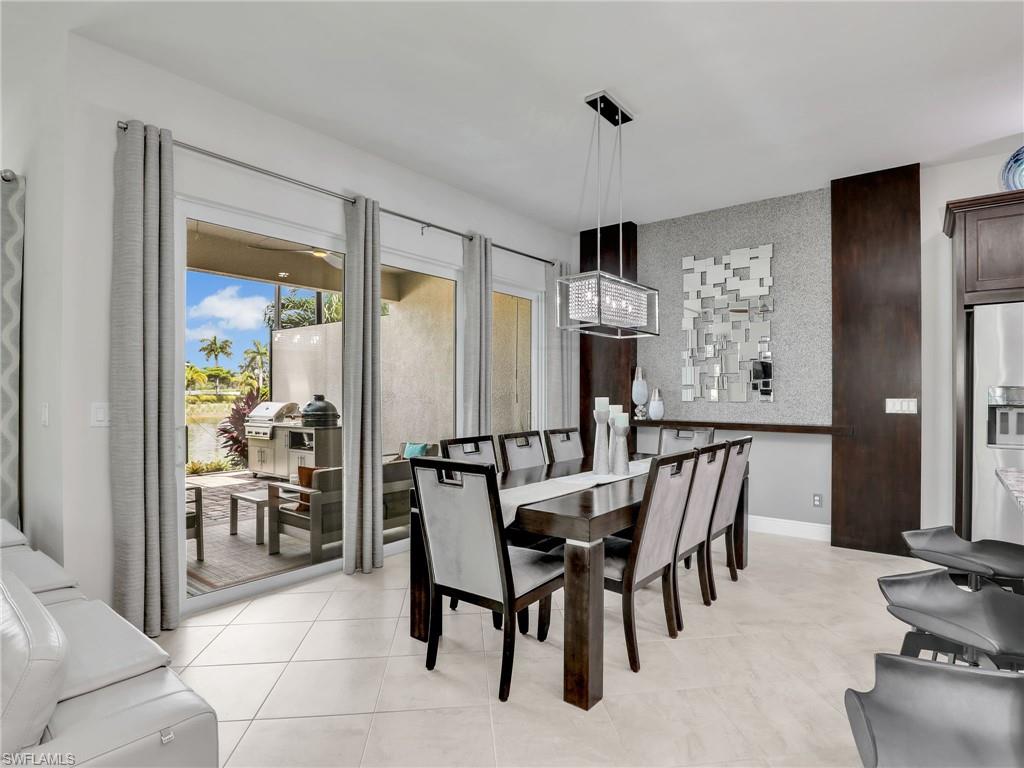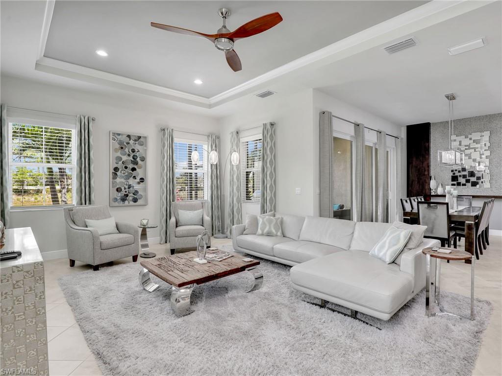 This fully furnished turn key residence blends comfort, design, and thoughtful upgrades throughout, creating an ideal setting for year-round or seasonal living. Built by Toll Brothers, this villa offers just over 1,600 square feet of living space with two bedrooms, two full bathrooms, and a two-car garage. The open-concept layout features square tile flooring in all main living areas and plush carpet in the bedrooms. Natural light fills the interior, accentuated by custom curtains, upgraded light fixtures, and ceiling fans that have been installed throughout the home. The living room offers a warm and inviting space for everyday relaxation and is equipped with a mounted TV, soundbar, and subwoofer. Custom curtains dress the windows, complementing the neutral tones and clean finishes. Just off the living space, the dining area features a stylish custom feature wall, and an upgraded chandelier, perfect for casual meals or hosting guests. The kitchen is outfitted with an upgraded natural gas cooktop, under-cabinet and above-cabinet lighting, and shaker-style cabinetry with sleek quartz counters and a tile backsplash. Adjacent to the kitchen, a custom-designed bar area includes built-in cabinetry, and a dual-zone wine and beverage fridge, adding an upscale and functional element to the living space. The primary suite is a private retreat that features custom curtains, an upgraded closet system, and a mounted TV paired with a soundbar and subwoofer. The en-suite bath has been enhanced with dual shower heads, tile to the ceiling in the walk-in shower, and a new light fixture. The guest bedroom includes its own set of custom curtains, an upgraded closet cabinet, and a mounted TV, while the nearby full bath features a stylish upgraded toilet cabinet. The laundry room has also been improved with the addition of cabinetry for added storage. Each room in the home includes a mounted TV, offering convenience and continuity throughout the space. Additional upgrades include hurricane impact windows throughout the home, an insulated garage door for energy efficiency and quiet operation along with an epoxy garage floor. Step outside to the covered and screened lanai where you can enjoy peaceful views of the manicured backyard. The space is ideal for relaxing or dining outdoors. The exterior of the home is finished in coastal-inspired tones with a paver driveway and mature landscaping that reflects the character of the community .Located directly across from the amenity center, this home has an ideal location! Residents of Azure at Hacienda Lakes have access to a private clubhouse offering resort-style amenities including a pool and spa, fitness center, aerobics studio, tennis and pickleball courts, game and card rooms, and a library. The HOA takes care of lawn care and landscaping, providing a low-maintenance lifestyle.