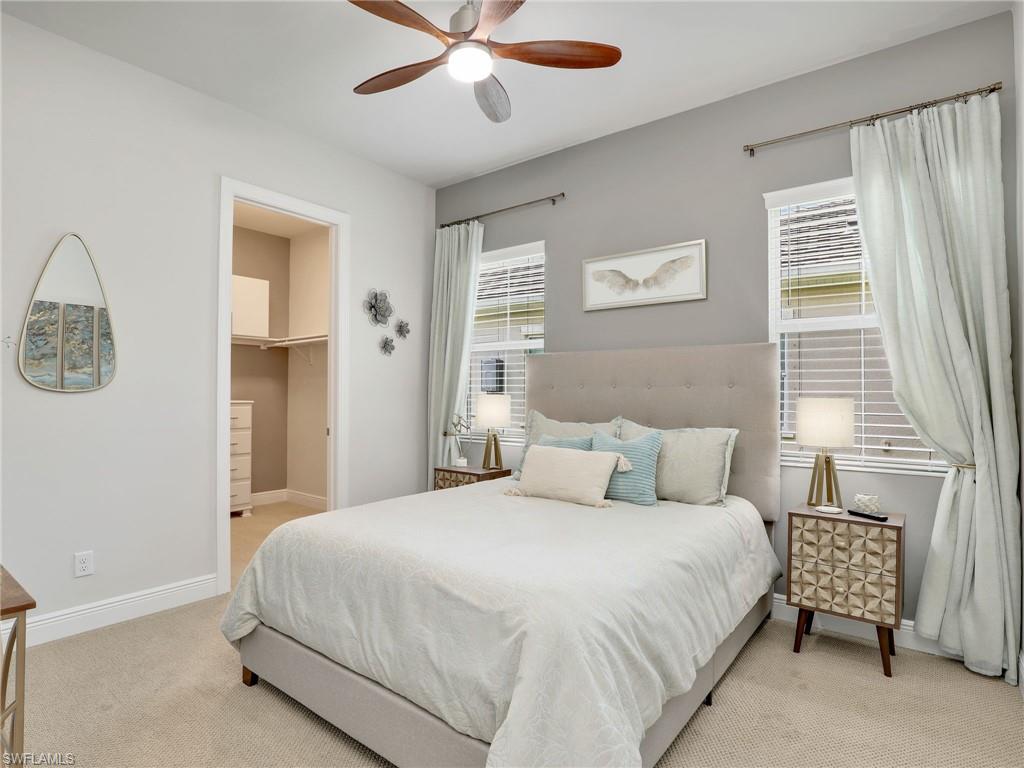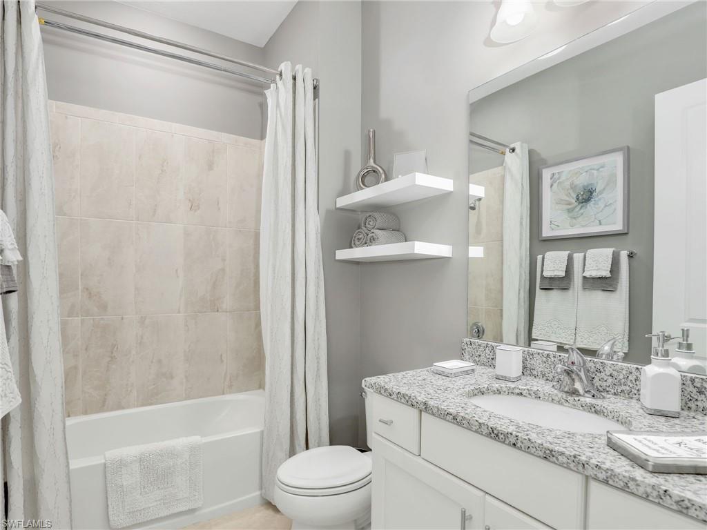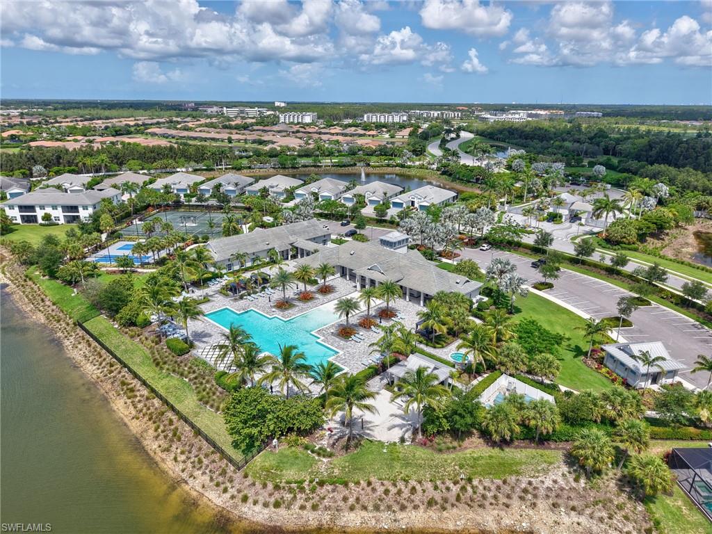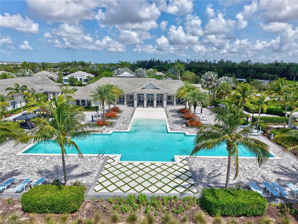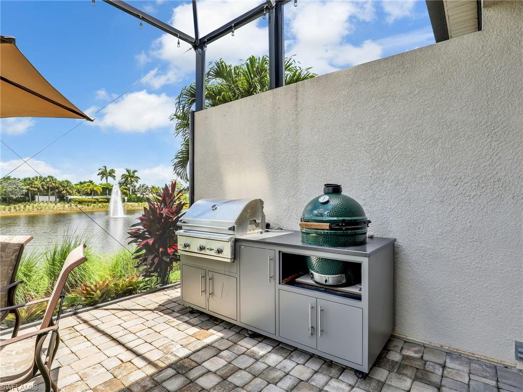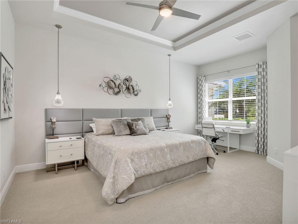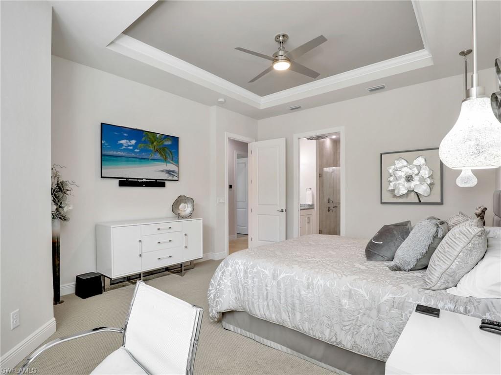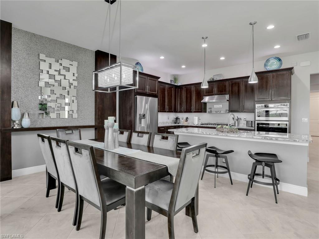 This fully furnished turn key residence blends comfort, design, and thoughtful upgrades throughout, creating an ideal setting for year-round or seasonal living. Built by Toll Brothers, this villa offers just over 1,600 square feet of living space with two bedrooms, two full bathrooms, and a two-car garage. The open-concept layout features square tile flooring in all main living areas and plush carpet in the bedrooms. Natural light fills the interior, accentuated by custom curtains, upgraded light fixtures, and ceiling fans that have been installed throughout the home. The living room offers a warm and inviting space for everyday relaxation and is equipped with a mounted TV, soundbar, and subwoofer. Custom curtains dress the windows, complementing the neutral tones and clean finishes. Just off the living space, the dining area features a stylish custom feature wall, and an upgraded chandelier, perfect for casual meals or hosting guests. The kitchen is outfitted with an upgraded natural gas cooktop, under-cabinet and above-cabinet lighting, and shaker-style cabinetry with sleek quartz counters and a tile backsplash. Adjacent to the kitchen, a custom-designed bar area includes built-in cabinetry, and a dual-zone wine and beverage fridge, adding an upscale and functional element to the living space. The primary suite is a private retreat that features custom curtains, an upgraded closet system, and a mounted TV paired with a soundbar and subwoofer. The en-suite bath has been enhanced with dual shower heads, tile to the ceiling in the walk-in shower, and a new light fixture. The guest bedroom includes its own set of custom curtains, an upgraded closet cabinet, and a mounted TV, while the nearby full bath features a stylish upgraded toilet cabinet. The laundry room has also been improved with the addition of cabinetry for added storage. Each room in the home includes a mounted TV, offering convenience and continuity throughout the space. Additional upgrades include hurricane impact windows throughout the home, an insulated garage door for energy efficiency and quiet operation along with an epoxy garage floor. Step outside to the covered and screened lanai where you can enjoy peaceful views of the manicured backyard. The space is ideal for relaxing or dining outdoors. The exterior of the home is finished in coastal-inspired tones with a paver driveway and mature landscaping that reflects the character of the community .Located directly across from the amenity center, this home has an ideal location! Residents of Azure at Hacienda Lakes have access to a private clubhouse offering resort-style amenities including a pool and spa, fitness center, aerobics studio, tennis and pickleball courts, game and card rooms, and a library. The HOA takes care of lawn care and landscaping, providing a low-maintenance lifestyle.