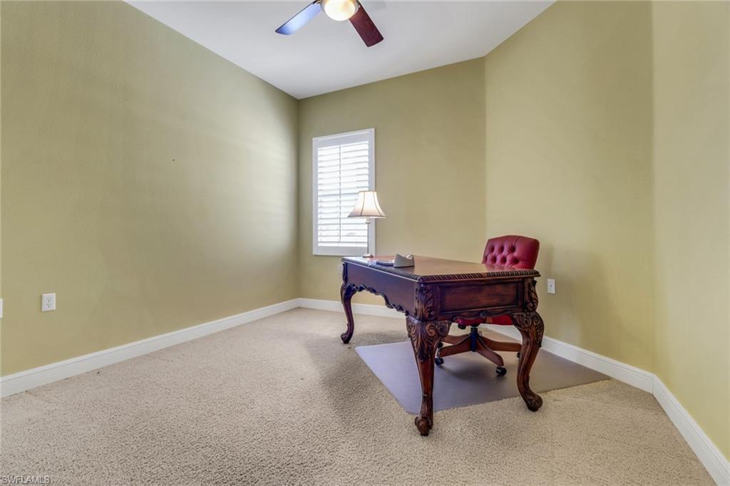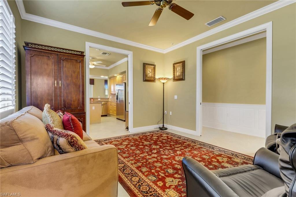 Located in stunning Regency Reserve within the Vineyards, this large and expanded 3 bedroom + den condo is being offered turnkey furnished. It is immaculate, meticulously maintained and has plenty of living space for you and your guests to spread out and enjoy the good life. The cozy den invites you to get comfortable and watch tv or read a book. Open concept living and dining areas extend out to the large screened lanai for even more seating. This is where you will enjoy your morning coffee with a front and center view of the large lake and fountain! Pride of ownership shines throughout this home where you will also find custom built wainscoting, crown molding and plantation shutters throughout! The addition of a private elevator makes second floor living seamless. Custom office space has been added above the stairs. Electric hurricane shutters enclose the lanai to provide safety and security! The primary bedroom has a king sized bed, walk in closets and a large bath with soaking tub, his/her sinks and a large shower area. The en suite guest bedroom has a walk in closet and is set up with twin beds. The second guest bedroom is currently being used as an office. This spotless condo is just steps to the beautiful community clubhouse with a lovely pool, hot tub, grilling area and weight room. Located in the heart of Naples, you will find every convenience at your fingertips.