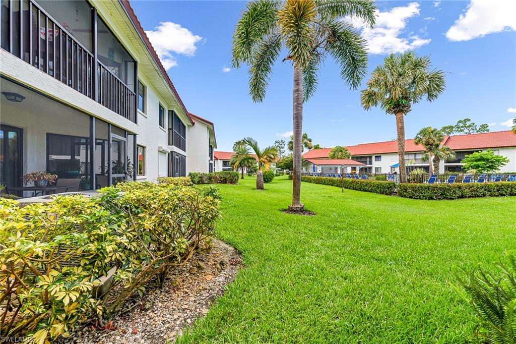 Welcome to this bright and beautiful corner unit in Regency Woods. This condominium has the best view with a screened lanai and extra storage to enjoy the Florida days and nights. Inside the residence, you have a kitchen that provides an abundance of cabinets, quartz counters, wood-front cabinets, wood-looking tile and vertical blinds throughout the condominium. The bedrooms are roomy, and the main bedroom has a walk-in closet. The primary bath has a double sink and an enclosed shower that separates the main bedroom with a barn door. Other condos features include storage in the attic with shelves and light, a deeded detached carport and guest parking spaces available steps from your door, a 40-year metal roof (2006), and a heated community pool/spa. As location is important, it is close to Naples Botanical Gardens and the Pickleball Academy. Enjoy the beautiful lifestyle of Naples.