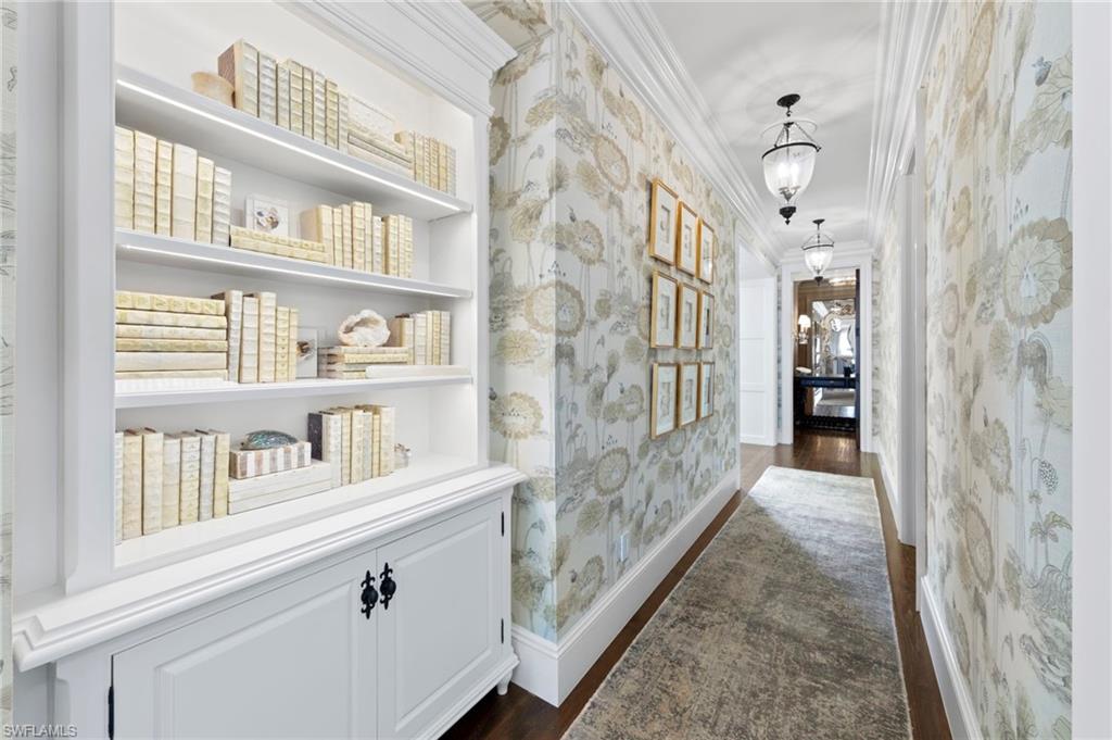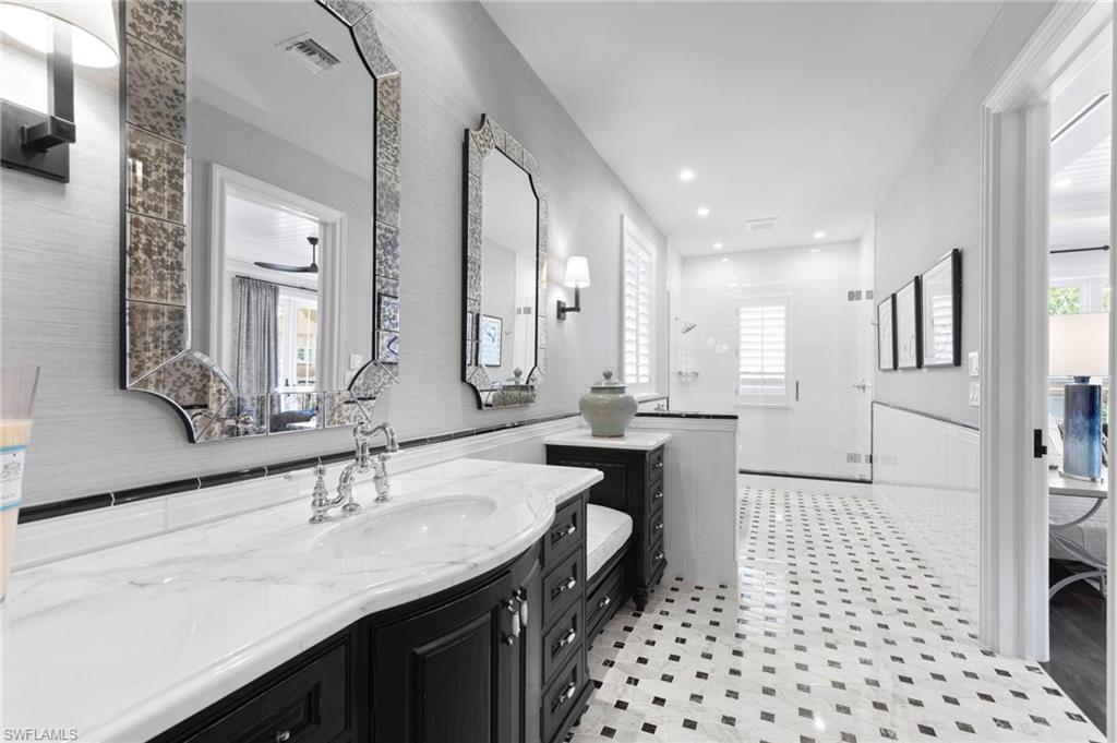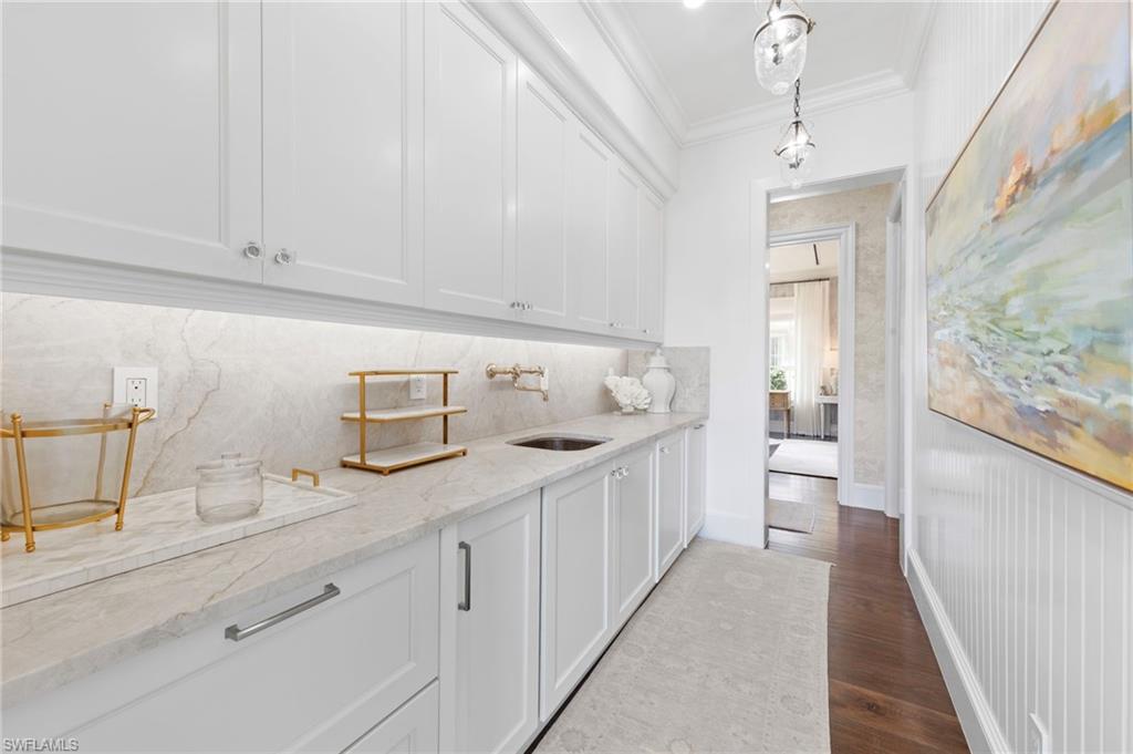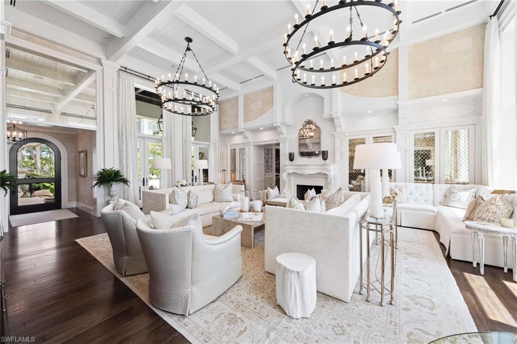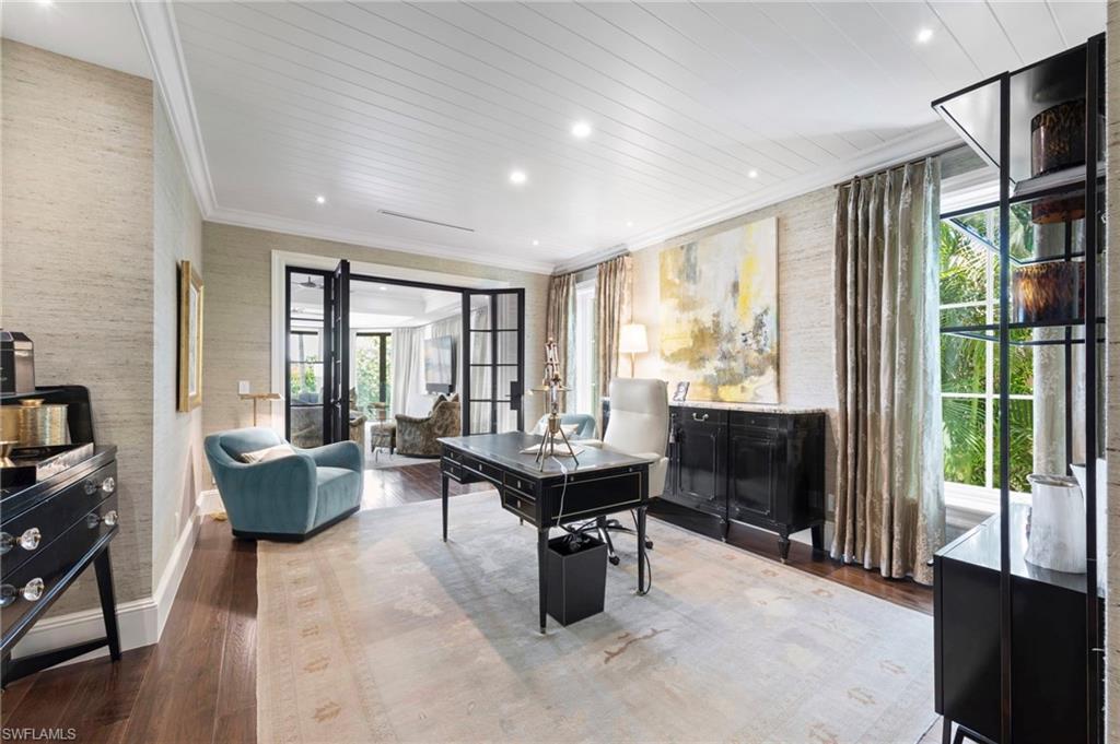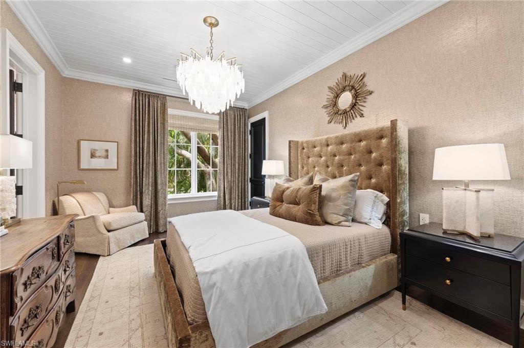 IMMEDIATE RESIDENT FULL PORT ROYAL MEMBERSHIP! Perched against the stunning backdrop of Champney Bay, this exquisite property, inspired by the aesthetics of the French West Indies, has been thoughtfully designed by the acclaimed architect Jeff Harrell. After an extensive two-year whole home renovation completed in 2022, the estate underwent a comprehensive outdoor and lower-level renovation in 2024, executed by the esteemed Knauf-Koenig Group. This remarkable multi-structure Port Royal residence boasts five bedrooms, a den, and 6.5 bathrooms, masterfully fusing timeless elegance with modern luxuries. Upon entering this captivating home, you are immediately surrounded by an array of ultra high-end finishes and contemporary details, creating an ambiance of refined sophistication throughout. The gourmet kitchen is a culinary dream, featuring premium Officine Gullo and Gaggenau appliances. The stunning primary suite, which occupies an entire level, serves as a personal retreat. It offers a private waterfront balcony, expansive mahogany walk-in closets, a convenient morning kitchen, and a lavish bathroom adorned with an exquisite mother-of-pearl domed ceiling, cultivating a serene yet luxurious atmosphere. The outdoor areas are reminiscent of a high-end resort, showcasing a magnificent pool, a peaceful koi pond, and a remarkable double-sided marble fireplace that enhances the natural beauty of the surroundings. The thoughtfully designed outdoor kitchen, private sandy beach cove in addition to private beach access off Gordon Dr, and various terraces provide an ideal setting for seamless entertaining amid lush tropical landscaping. Additionally, this home features private beach access and a dock located just a short distance from Gordon Pass allowing for direct access to the gulf, making it perfect for boating enthusiasts. For car aficionados, the estate features three garages with the capacity to accommodate up to nine vehicles or 13 vehicles with lifts. Residents enjoy exclusive membership eligibility to the prestigious Port Royal Club, adding yet another enticing aspect to this extraordinary property.