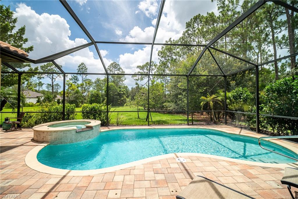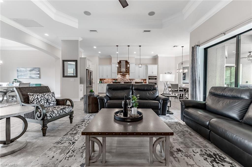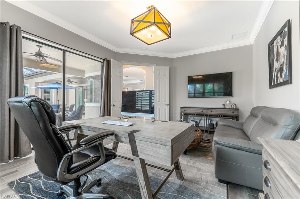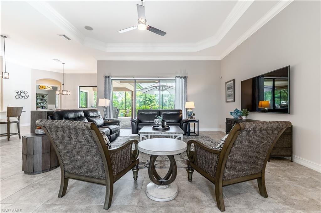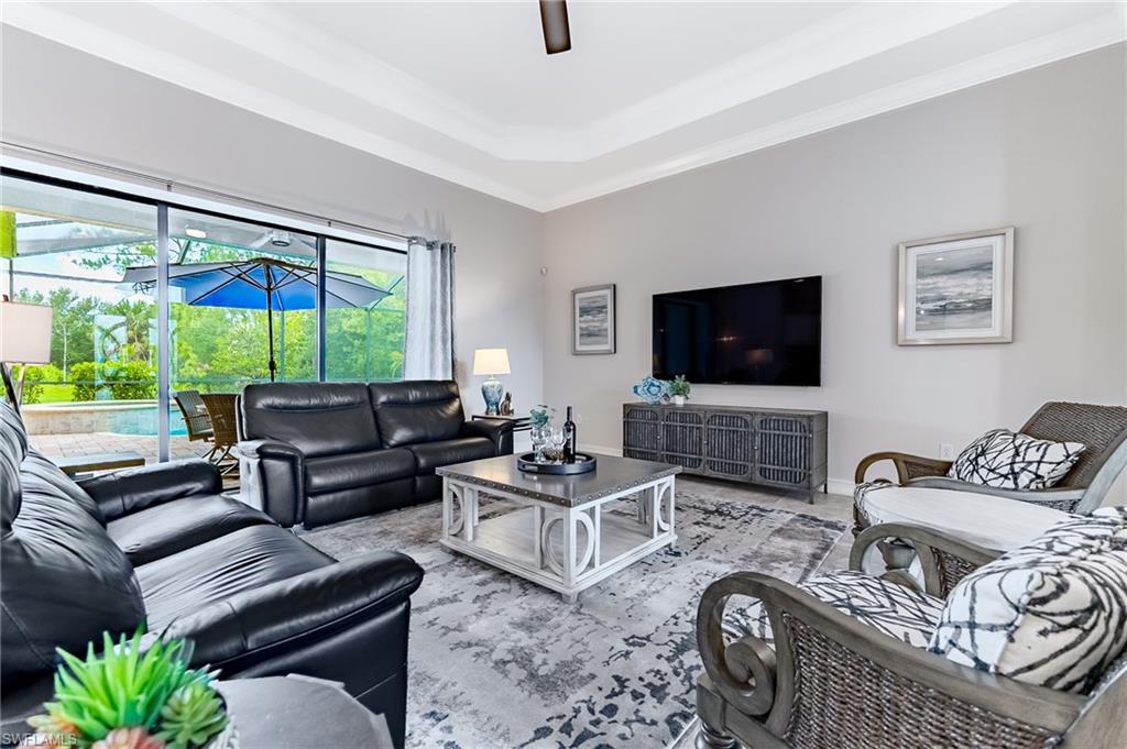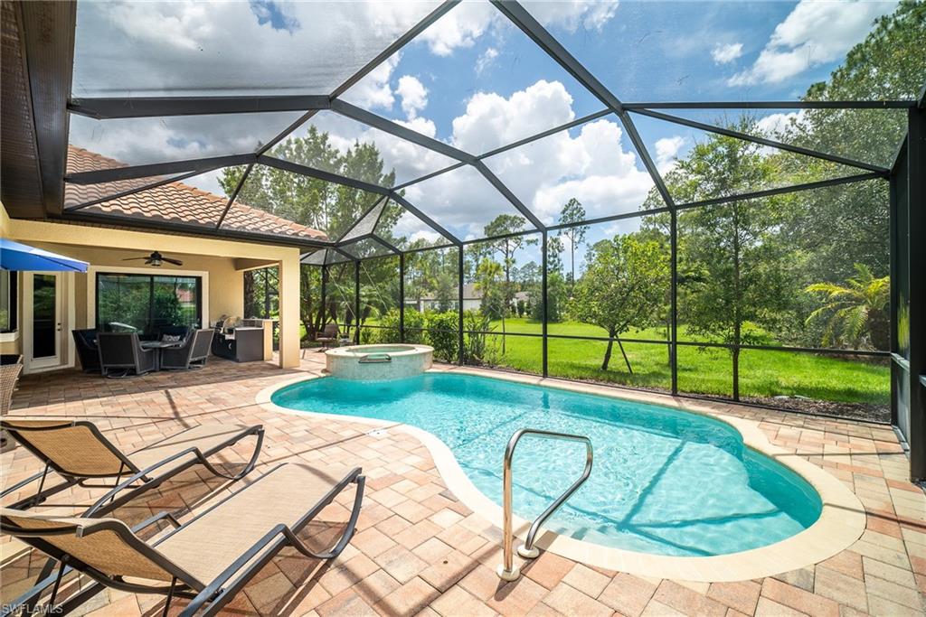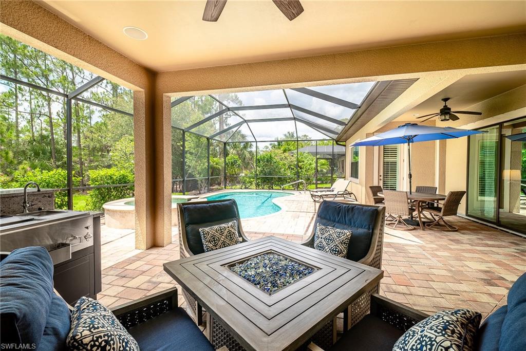 HUGE PRICE IMPROVEMENT!! This beautifully furnished 3-bedroom home with a spacious office/flex room is a true retreat, nestled in a peaceful gated neighborhood surrounded by natural woods for privacy and tranquility. Thoughtfully designed for both everyday comfort and elegant entertaining, the home features soaring 12-foot coffered ceilings and high-end finishes throughout, including rich granite countertops, quality cabinetry, crown molding and plantation shutters. The chef’s kitchen is a showstopper with a massive island, gas cooktop, and large walk-in pantry, flowing seamlessly into the living area and out through a wall of large sliding glass doors that fully retract for true indoor-outdoor living. Step onto the screened lanai where a serene view of a wide lawn and wooded backdrop creates a hidden oasis, complete with a heated pool, spa, and fully equipped outdoor kitchen. The luxurious primary suite offers double-door entry, two walk-in closets, a spa-like bath with a soaking tub and oversized walk-in shower, and private lanai access. This homes offers tons of storage, walk-in closets in every bedroom, large laundry room and high tech accessories like Sonos speaker system and smart home security system. TWO NEW AC UNITS HAVE JUST BEEN INSTALLED IN AUGUST (Huge expense that the new owners will not have to worry about)!!A side-entry 3-car garage enhances the home’s curb appeal, and the community’s location offers convenient access to Immokalee Rd, Collier Blvd, and Vanderbilt Beach Rd, while being zoned for top-rated schools and just minutes from Naples’ best shopping, dining, and beaches. This home truly delivers the Florida lifestyle—peaceful, private, and effortlessly refined.