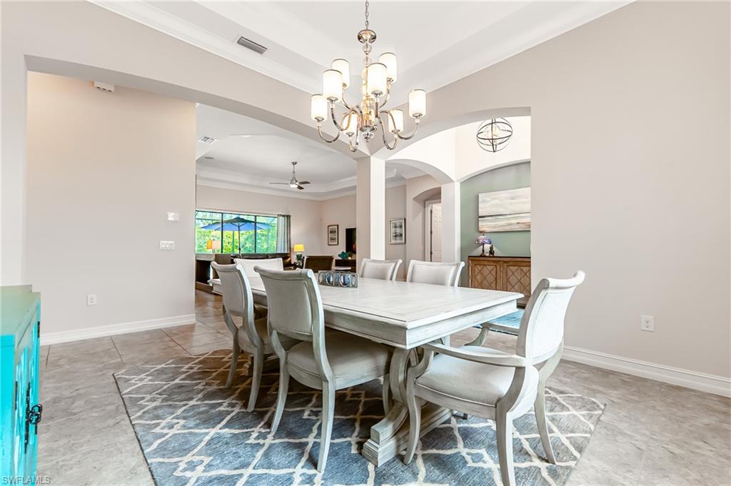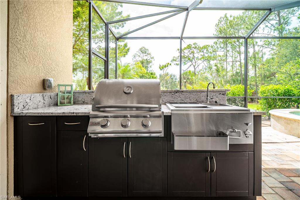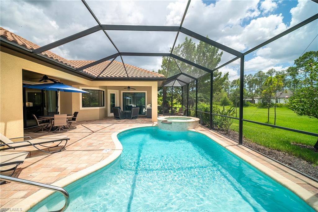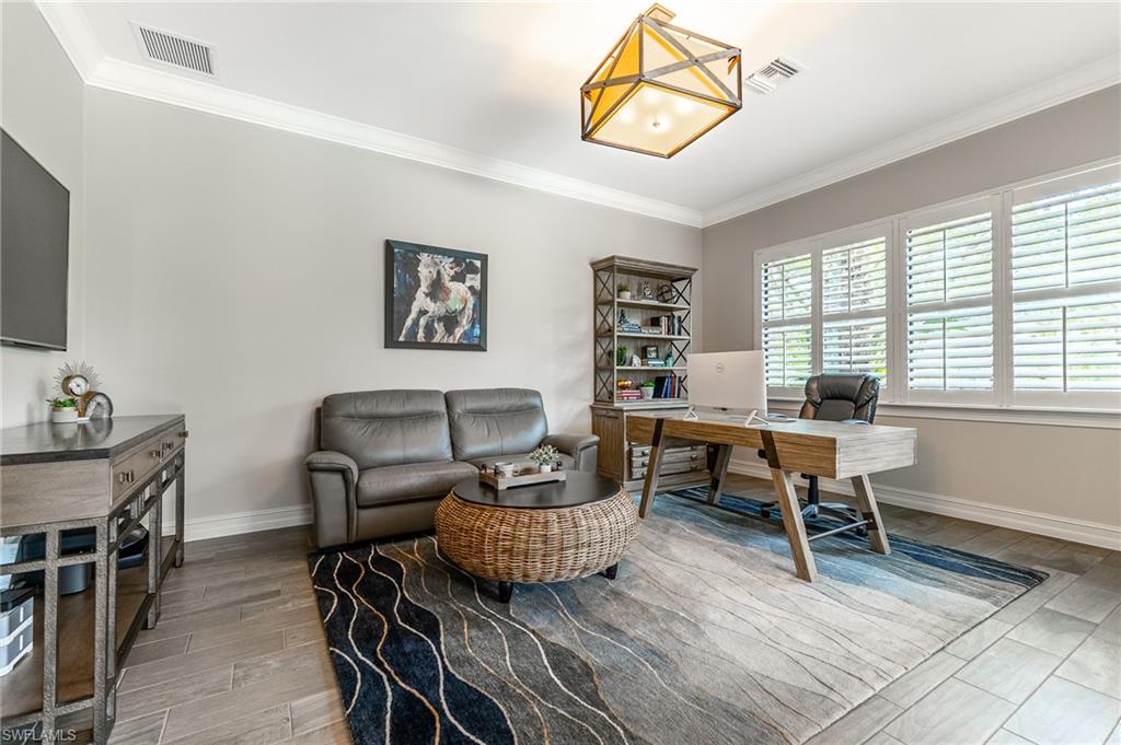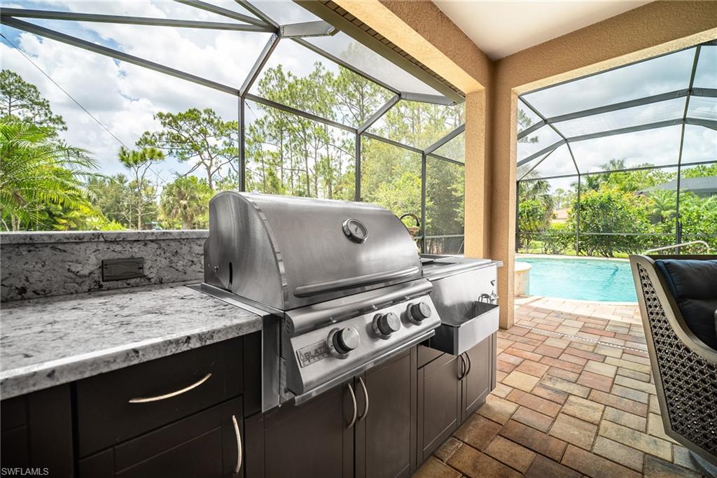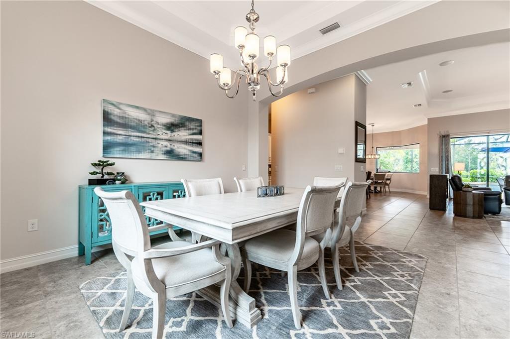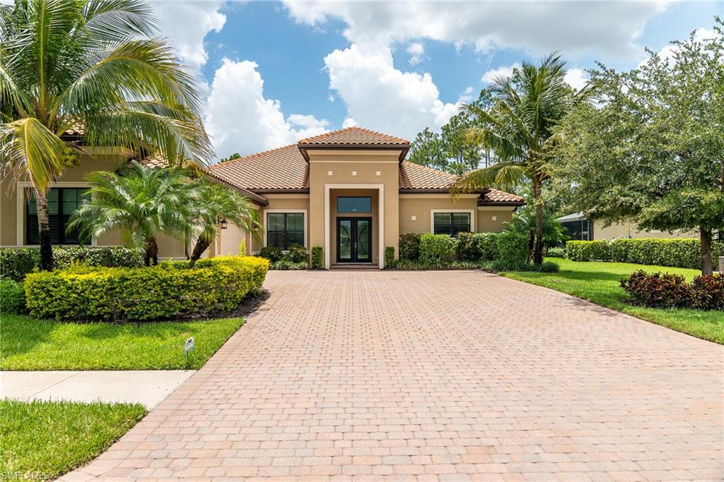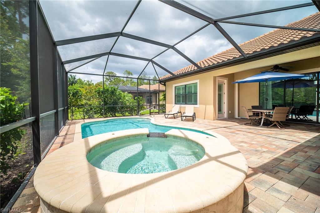 HUGE PRICE IMPROVEMENT!! This beautifully furnished 3-bedroom home with a spacious office/flex room is a true retreat, nestled in a peaceful gated neighborhood surrounded by natural woods for privacy and tranquility. Thoughtfully designed for both everyday comfort and elegant entertaining, the home features soaring 12-foot coffered ceilings and high-end finishes throughout, including rich granite countertops, quality cabinetry, crown molding and plantation shutters. The chef’s kitchen is a showstopper with a massive island, gas cooktop, and large walk-in pantry, flowing seamlessly into the living area and out through a wall of large sliding glass doors that fully retract for true indoor-outdoor living. Step onto the screened lanai where a serene view of a wide lawn and wooded backdrop creates a hidden oasis, complete with a heated pool, spa, and fully equipped outdoor kitchen. The luxurious primary suite offers double-door entry, two walk-in closets, a spa-like bath with a soaking tub and oversized walk-in shower, and private lanai access. This homes offers tons of storage, walk-in closets in every bedroom, large laundry room and high tech accessories like Sonos speaker system and smart home security system. TWO NEW AC UNITS HAVE JUST BEEN INSTALLED IN AUGUST (Huge expense that the new owners will not have to worry about)!!A side-entry 3-car garage enhances the home’s curb appeal, and the community’s location offers convenient access to Immokalee Rd, Collier Blvd, and Vanderbilt Beach Rd, while being zoned for top-rated schools and just minutes from Naples’ best shopping, dining, and beaches. This home truly delivers the Florida lifestyle—peaceful, private, and effortlessly refined.