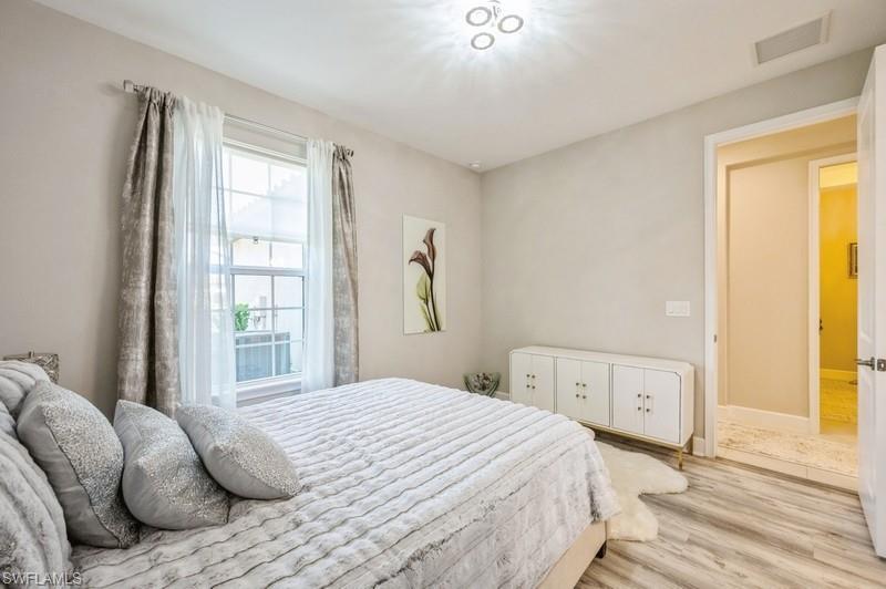 East rear exposure 2 bed + den, 2 bath villa in Esplanade at Hacienda Lakes – where effortless luxury meets resort-style living. This move-in-ready corner villa offers privacy, abundant natural light, and a thoughtful floor-plan designed for both comfort and functionality. The den features double doors, making it an ideal home office or optional 3rd bedroom. The upgraded kitchen showcases a designer backsplash, modern hardware, newer appliances, quartz countertops, a spacious pantry, and a convenient breakfast bar. The primary suite impresses with a custom built-in walk-in closet and spa-style bath complete with dual sinks and a walk-in shower. Throughout the home, you’ll appreciate luxury vinyl plank flooring—no carpet, even in closets! Additional highlights include a guest bath with frameless glass shower door, crown molding, stylish chandeliers, a laundry room with utility sink, window treatments, and a 2-car garage. Step outside to your private screened lanai with ceiling fan—perfect for enjoying the morning sun and cooler afternoons. Residents of Esplanade at Hacienda Lakes enjoy world-class amenities: a vibrant clubhouse with social spaces, state-of-the-art fitness center, pickleball, tennis and bocce courts, plus a resort-style pool with spa, cabanas, and more. All of this in a prime Naples location—just minutes from shopping, dining, Physicians Regional Hospital, downtown 5th Avenue, and the white sands of Marco Island beaches. This villa combines privacy, upgrades, and convenience, making it the perfect place to call home.