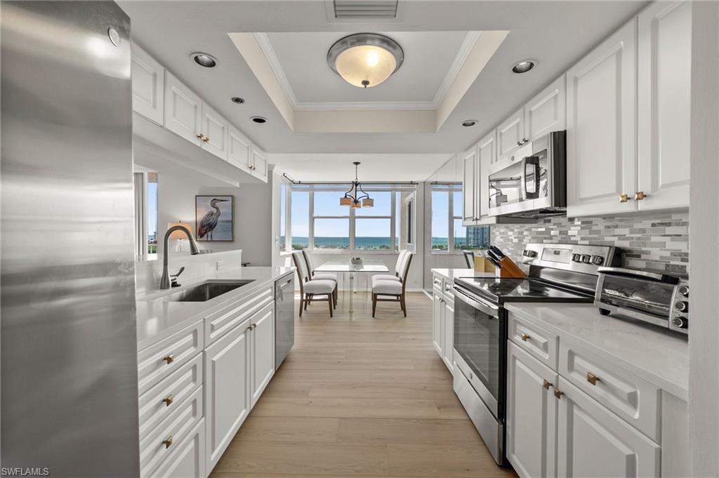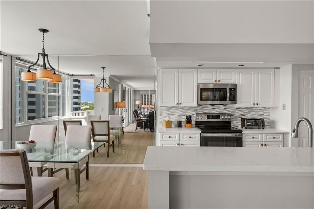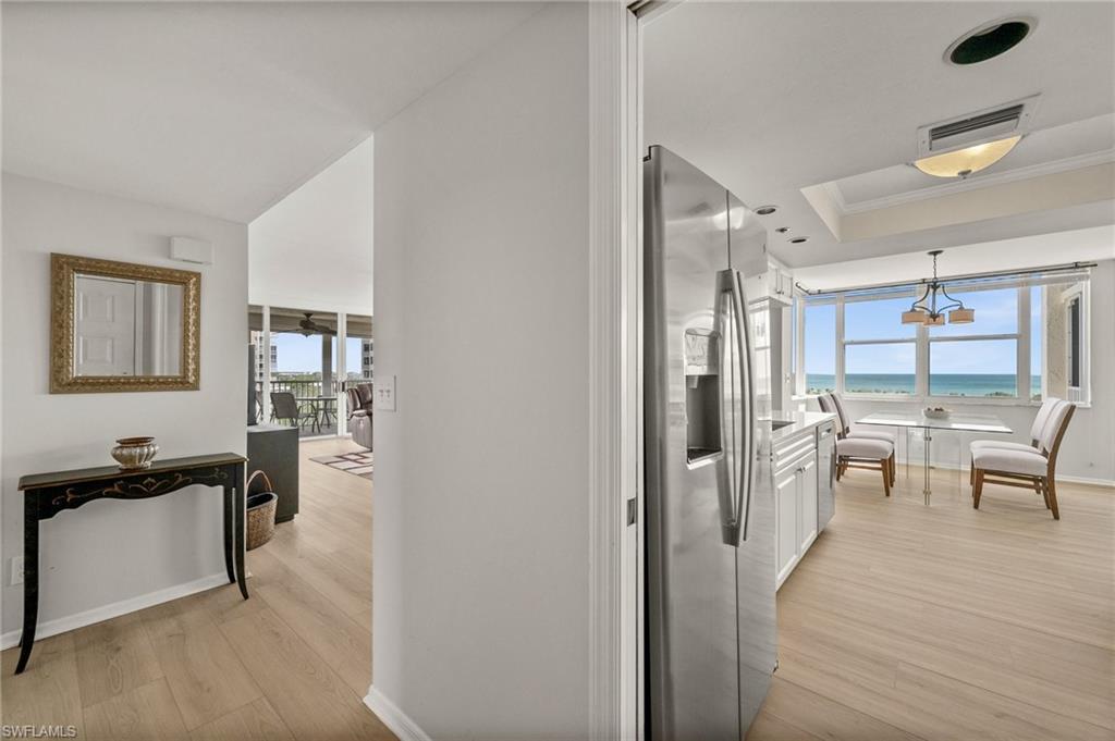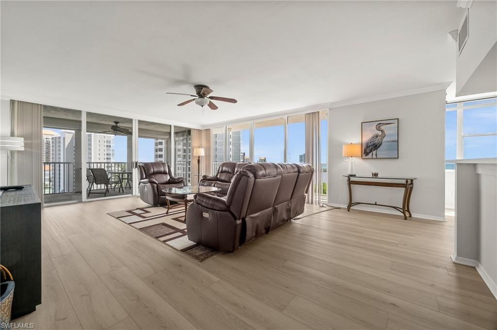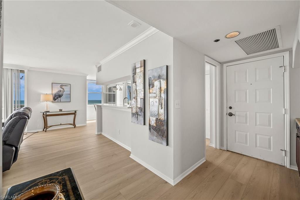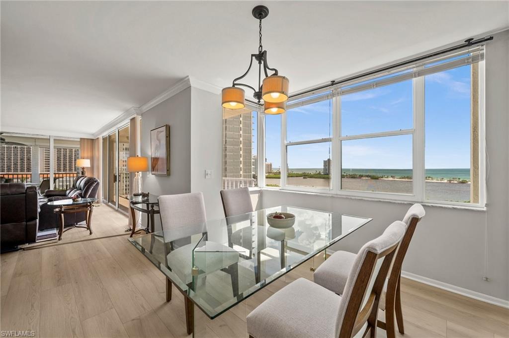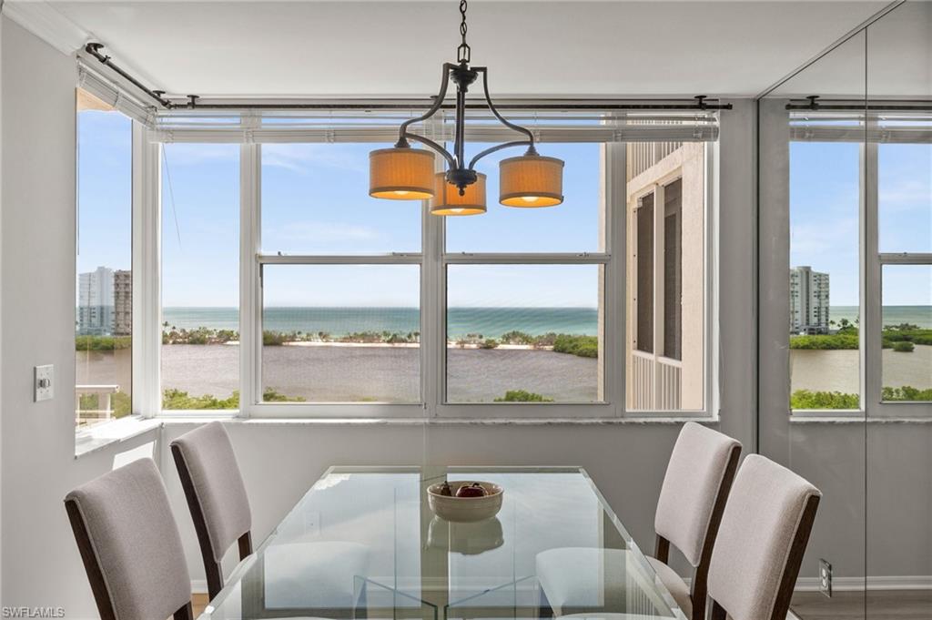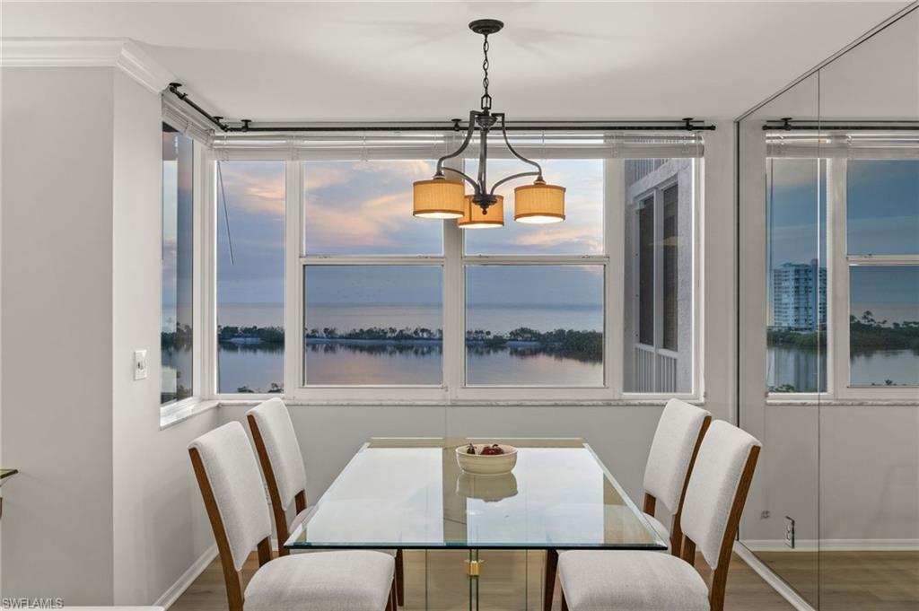 Welcome to breathtaking sunsets and panoramic views of Clam Bay, the Gulf of America, and a protected nature preserve from this beautifully updated 9th-floor corner unit in the prestigious St. Nicole building in Pelican Bay. This light-filled 3-bedroom, 2-bath condominium offers an open floor plan designed to maximize natural light and water views from every main living area. The newly updated kitchen boasts recently refaced cabinets, new quartz countertops, appliances, and contemporary hardware. Both bathrooms have been thoughtfully upgraded to match, featuring refaced cabinetry, quartz counters, and stylish finishes. New luxury vinyl plank flooring runs seamlessly throughout the home. The generously sized master bedroom features his and hers walk-in closets and a meticulously updated en suite master bath with a dual vanity and walk-in shower. Step out onto your expansive wrap-around lanai—offering both screened and open-air spaces—to soak in the Gulf breeze and serene views. With direct access from both the spacious master suite and living room, you’ll enjoy seamless indoor-outdoor living that captures the essence of the Naples lifestyle. St. Nicole offers an array of amenities, including a pool and spa that are currently nearing completion of a full renovation, two guest suites, a fitness center, card and billiards rooms, an on-site manager, and a welcoming front desk staff. Even more exciting—the lobby and community room are set to be completely redesigned, further elevating the appeal and value of this already exceptional building. Pelican Bay offers an unmatched resort-style lifestyle, with nearly three miles of private, white-sand beaches accessible via scenic boardwalks and tram service, two beachfront restaurants with full bar and chair service, and a wide array of outdoor activities including kayaking, paddleboarding, and sailing. Residents enjoy 18 Har-Tru tennis courts, a rapidly expanding pickleball complex, state-of-the-art fitness centers, wellness programming, and miles of walking and biking trails through 88 acres of protected preserve. Social and cultural amenities abound with nearby Artis–Naples and Waterside Shops, while optional membership at Club Pelican Bay provides access to a 27-hole championship golf course and private clubhouse. The recently completed Milestone Inspection passed with no Phase 2 required, giving you peace of mind from day one. Offered turnkey furnished, this residence is move-in ready—just bring your toothbrush and start enjoying the Pelican Bay lifestyle. Priced to sell, this exceptional opportunity won’t last. Schedule your private showing today!