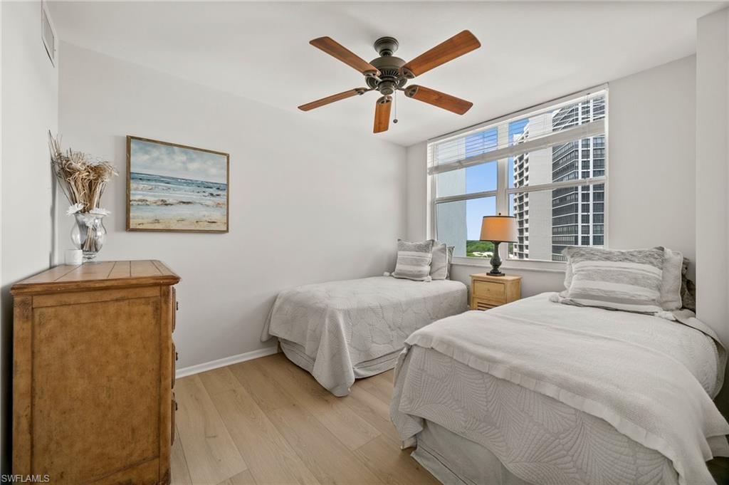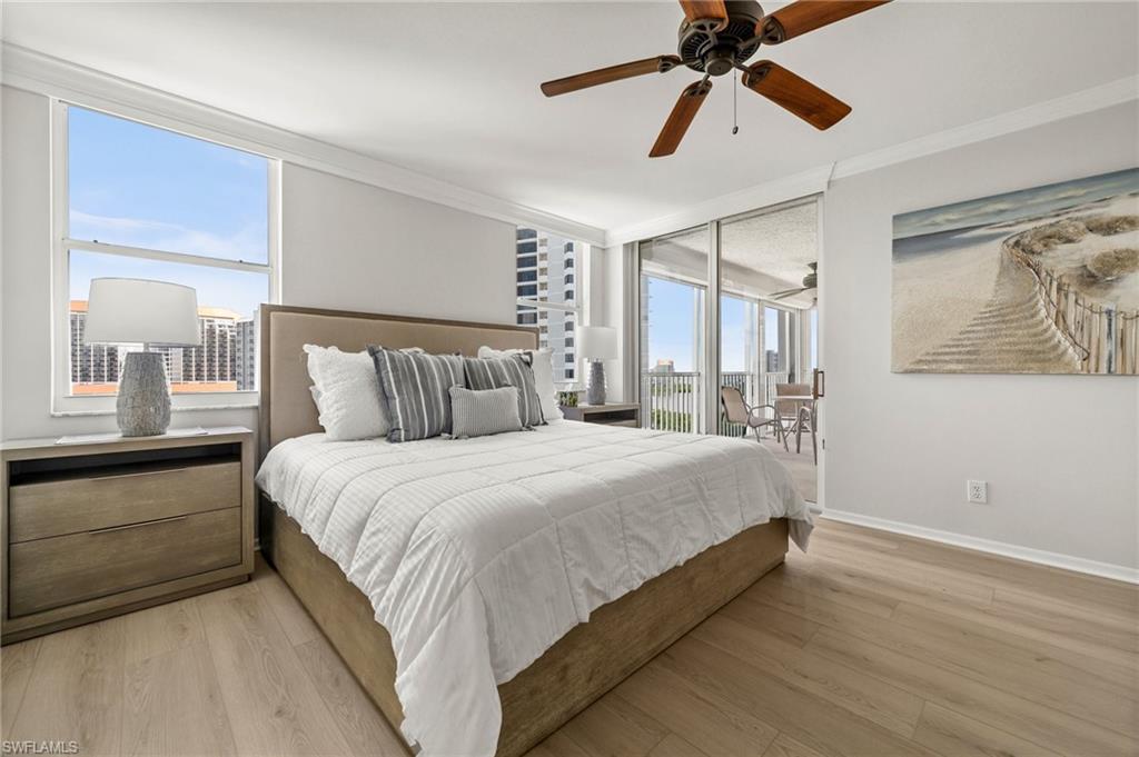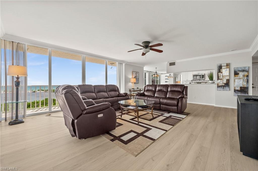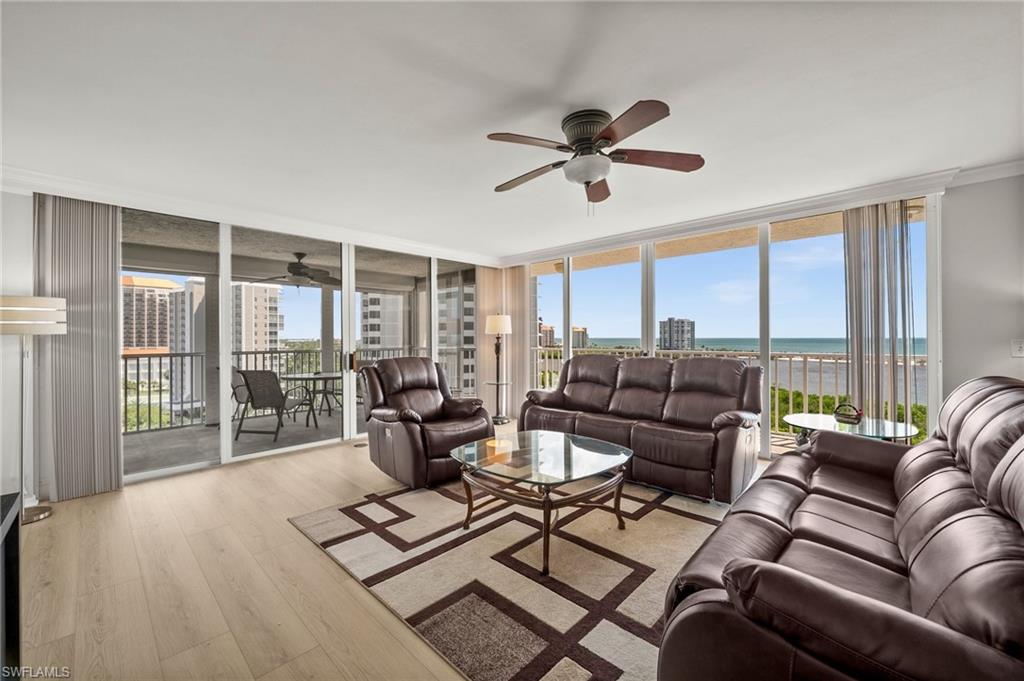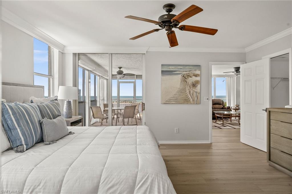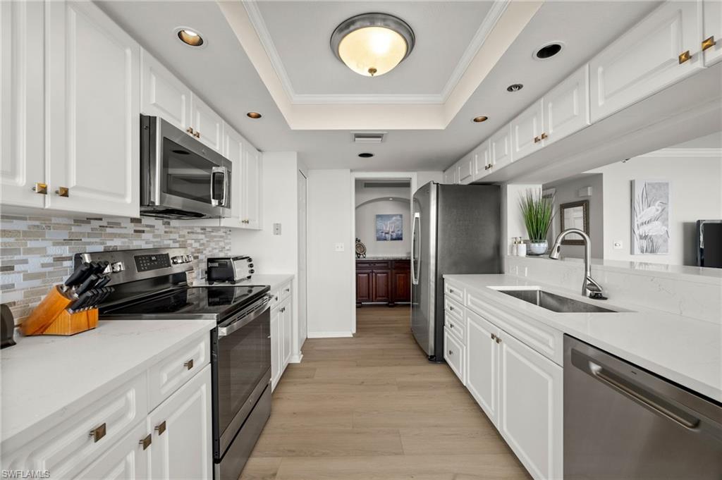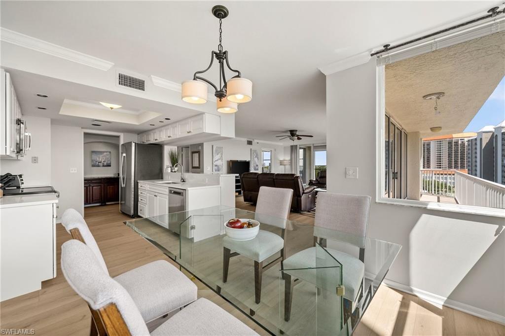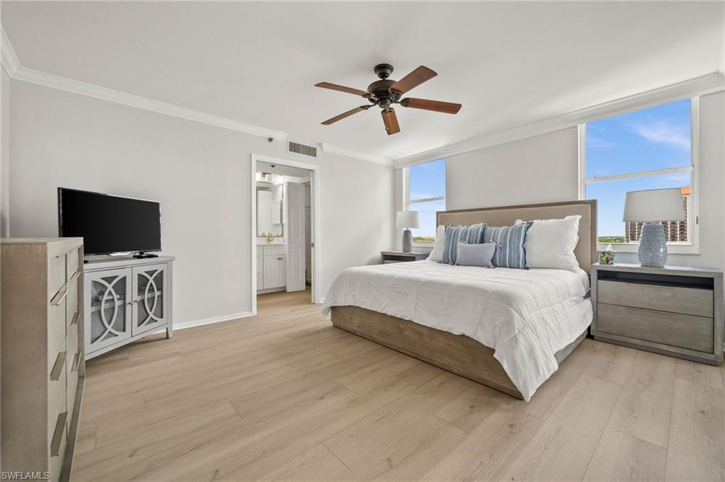 Welcome to breathtaking sunsets and panoramic views of Clam Bay, the Gulf of America, and a protected nature preserve from this beautifully updated 9th-floor corner unit in the prestigious St. Nicole building in Pelican Bay. This light-filled 3-bedroom, 2-bath condominium offers an open floor plan designed to maximize natural light and water views from every main living area. The newly updated kitchen boasts recently refaced cabinets, new quartz countertops, appliances, and contemporary hardware. Both bathrooms have been thoughtfully upgraded to match, featuring refaced cabinetry, quartz counters, and stylish finishes. New luxury vinyl plank flooring runs seamlessly throughout the home. The generously sized master bedroom features his and hers walk-in closets and a meticulously updated en suite master bath with a dual vanity and walk-in shower. Step out onto your expansive wrap-around lanai—offering both screened and open-air spaces—to soak in the Gulf breeze and serene views. With direct access from both the spacious master suite and living room, you’ll enjoy seamless indoor-outdoor living that captures the essence of the Naples lifestyle. St. Nicole offers an array of amenities, including a pool and spa that are currently nearing completion of a full renovation, two guest suites, a fitness center, card and billiards rooms, an on-site manager, and a welcoming front desk staff. Even more exciting—the lobby and community room are set to be completely redesigned, further elevating the appeal and value of this already exceptional building. Pelican Bay offers an unmatched resort-style lifestyle, with nearly three miles of private, white-sand beaches accessible via scenic boardwalks and tram service, two beachfront restaurants with full bar and chair service, and a wide array of outdoor activities including kayaking, paddleboarding, and sailing. Residents enjoy 18 Har-Tru tennis courts, a rapidly expanding pickleball complex, state-of-the-art fitness centers, wellness programming, and miles of walking and biking trails through 88 acres of protected preserve. Social and cultural amenities abound with nearby Artis–Naples and Waterside Shops, while optional membership at Club Pelican Bay provides access to a 27-hole championship golf course and private clubhouse. The recently completed Milestone Inspection passed with no Phase 2 required, giving you peace of mind from day one. Offered turnkey furnished, this residence is move-in ready—just bring your toothbrush and start enjoying the Pelican Bay lifestyle. Priced to sell, this exceptional opportunity won’t last. Schedule your private showing today!