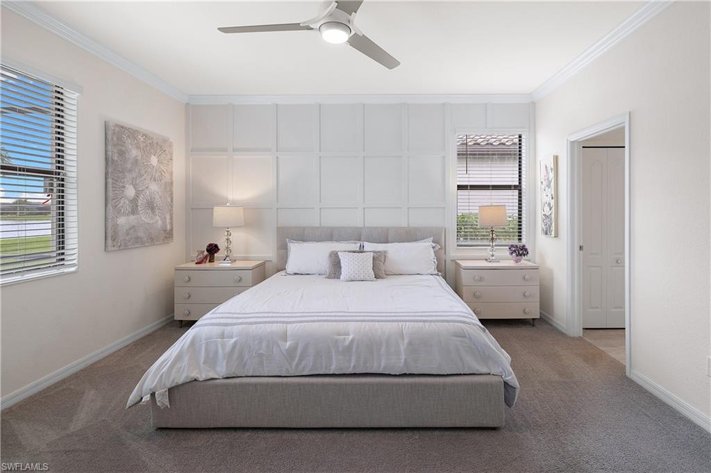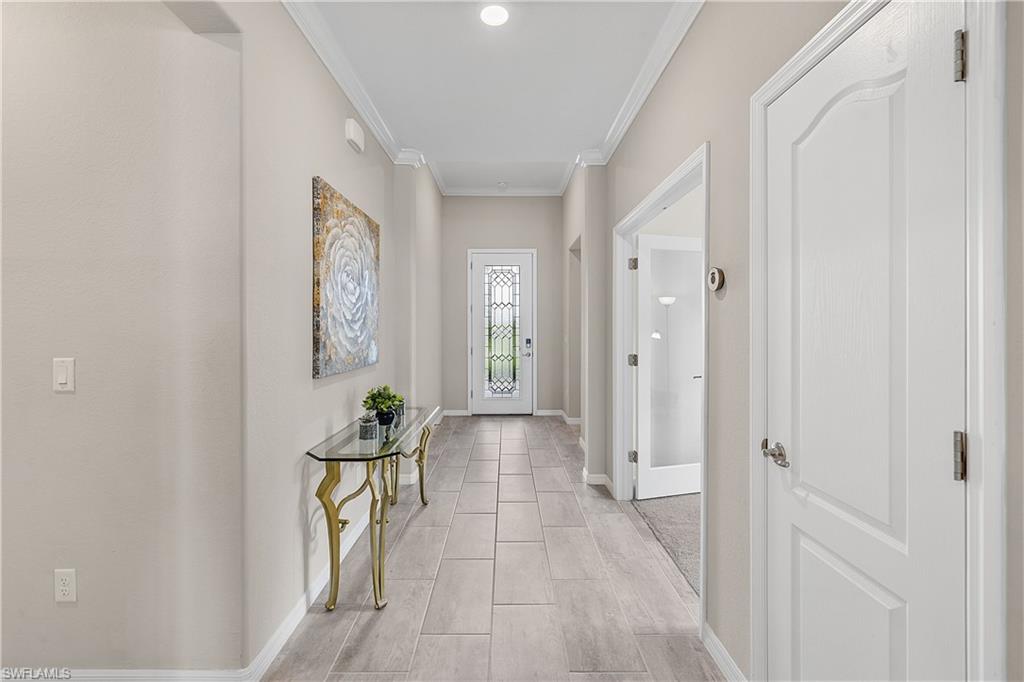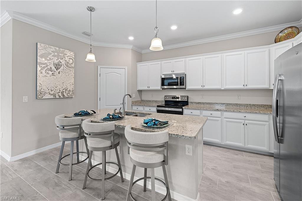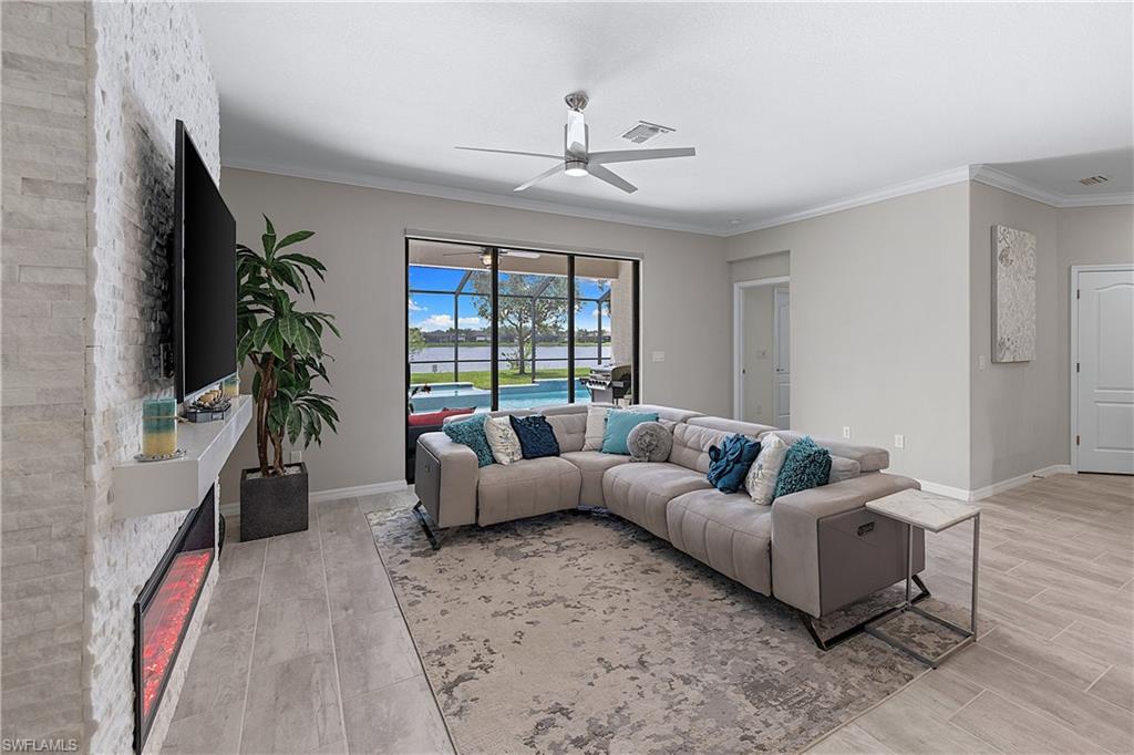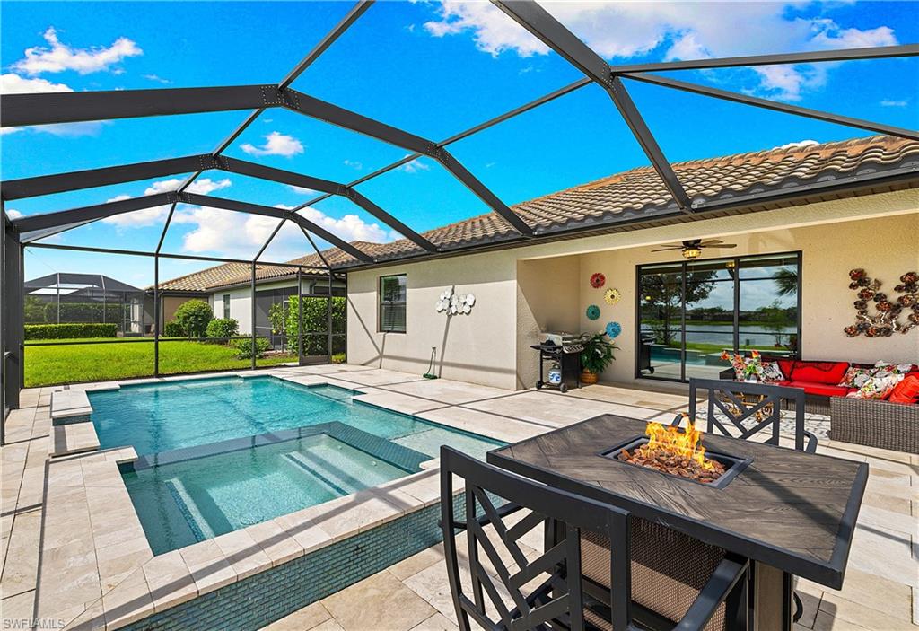 ENJOY SPECTACULAR SUNSETS OVER THE LAKE ALL YEAR LONG WITH THE WESTERN REAR EXPOSURE! MOVE IN RIGHT AWAY! DESIRABLE LAKEFRONT HOME WITH CUSTOM SALTWATER POOL & SPA AND SPARKLING WATER VIEWS IS AVAILABLE NOW IN THE PLACE AT CORKSCREW! This 2019 “Trevi” residence offers 3 Bedrooms + Den w/Glass Doors, 3 Full Baths, 2 Car Garage, 2,032sf living area. The outdoor space starts with the TRAVERTINE POOL DECK extending out 24 feet from the covered lanai. The CUSTOM POOL WITH CORNER SPA glistens when the water cascades over the modern teal glass mosaic tile onto the large SUNSHELF. The RAISED WALL adds an additional “POP” as a focal point with a sheer decent water feature. This deep homesite still provides plenty of room to add a fence beyond the screened pool enclosure for your kids and pets to play. The OPEN CONCEPT floorplan features 12” x 24” PLANK TILE, upgraded light fixtures and ceiling fans, REMOTE BLINDS ON SLIDERS, window treatments, CROWN MOLDING throughout the main areas and a DESIGNER GLASS DOOR INSERT. The Greatroom boasts a striking STONE FEATURE WALL equipped with an LED FIREPLACE that is perfect to create a relaxing atmosphere. The Kitchen showcases White cabinetry, STAINLESS STEEL APPLIANCES, Granite Countertops, a WALK-IN PANTRY and a kitchen island for casual dining. The Dining area joins the Greatroom creating an inviting space for entertaining in the heart of the home while opening onto the covered lanai space. The Primary Suite is appointed with a CUSTOM WOOD TRIM ACCENT WALL, dual closets and SPARKLING WATER VISTAS from your bedside. The Primary Bath boasts of double sinks, SOAKING TUB, SEPARATE SHOWER and a private water closet. Guests will enjoy accommodations in the split bedroom layout. One guest suite has it's own EN-SUITE FULL BATH for added privacy. WASHER AND DRYER included. PROPERTY IS HIGH AND DRY AND LOCATED IN FLOOD ZONE X... NO FLOOD INSURANCE REQUIRED! Amenities at The Place include: Resort Pool w/100' Waterslide, Indoor Restaurant, Bourbon Bar, Cafe, Outdoor Bar, Fitness Center, Movement Studio, Tennis, Pickleball, Bocce, Basketball, Playground, Dog Park, Childwatch, Spa Services. For GOLF ENTHUSIASTS, the highly rated Jack Nicklaus designed OLD CORKSCREW GOLF CLUB is open to the public and located directly across the street from the community entrance! NEW PUBLIX GROCERY STORE... JUST 1.4 MILES AWAY... IS NOW OPEN!!! TENANTS INCLUDE DUNKIN DONUTS, UPS STORE, LEGNO ITALIAN RESTAURANT, NAIL AND HAIR SALON, HEARTLAND DENTAL, AND MORE!
