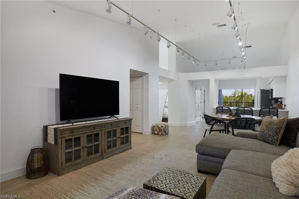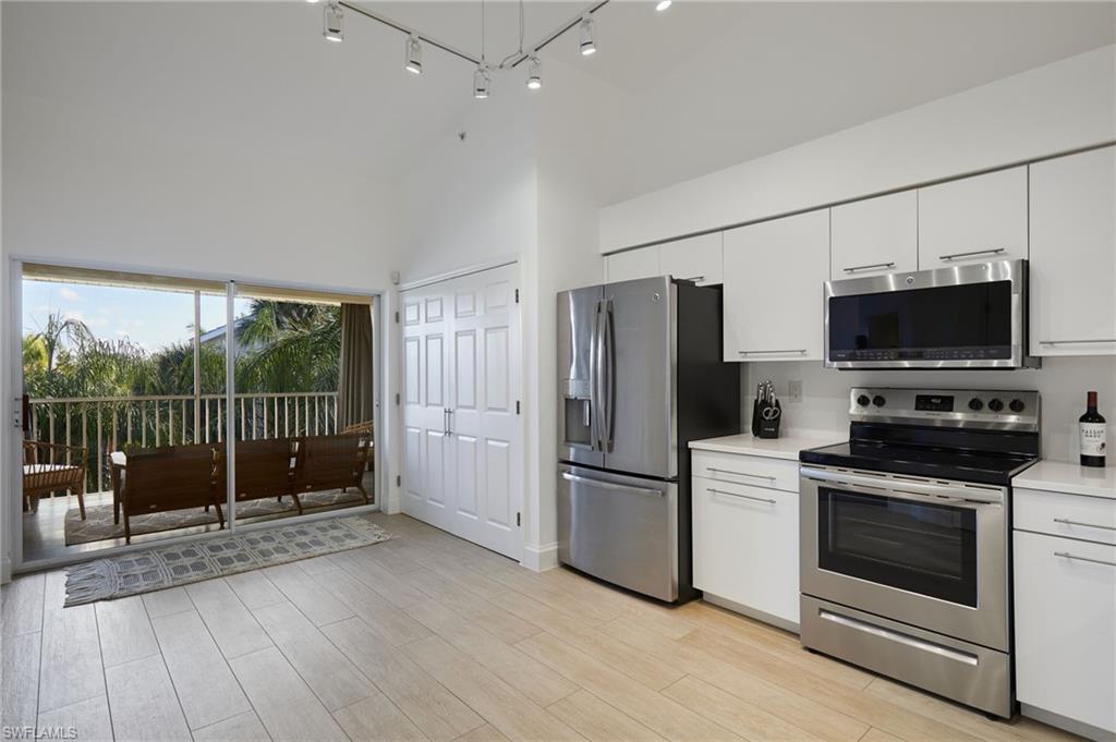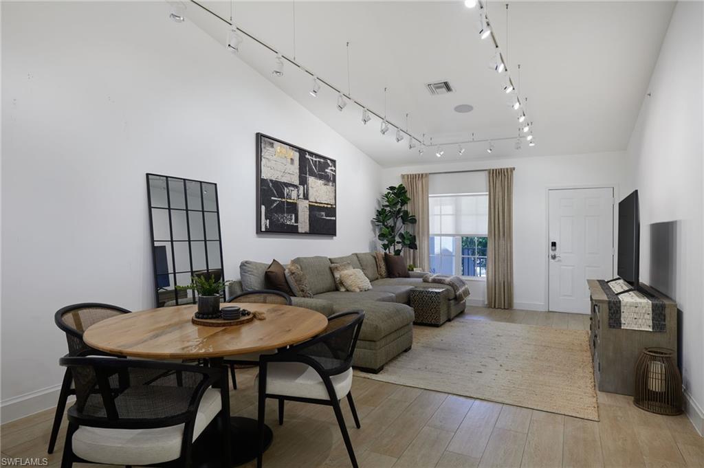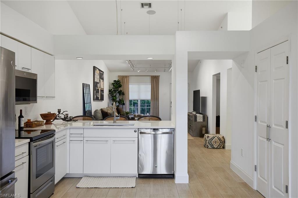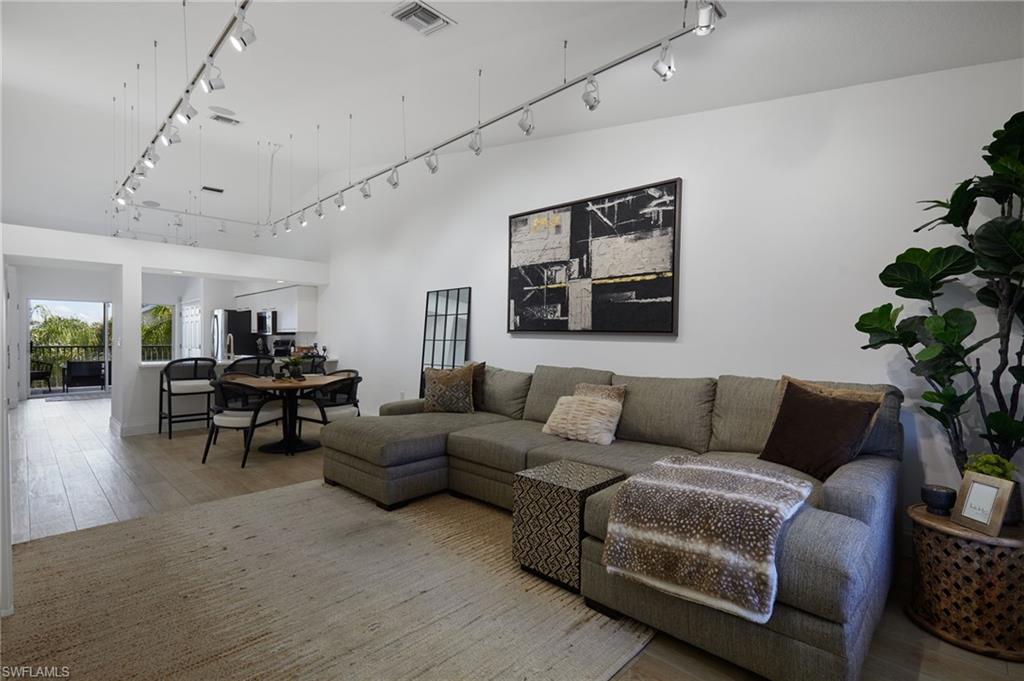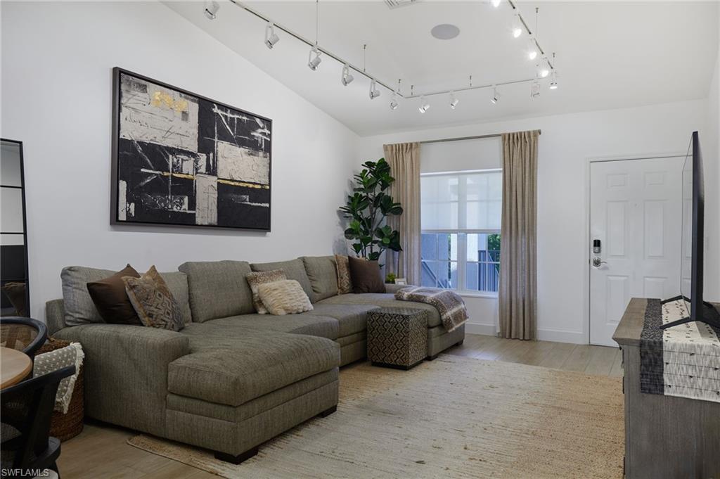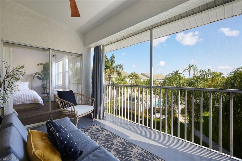 If minimalistic and exquisite live in your design vocabulary, prepare to fall in love. Tucked within a beautifully maintained gated enclave, West of US 41, this rarely available, top-floor 2-bedroom plus den, 2-bath residence with a private 1-car detached garage redefines effortless living. Step inside and feel the space breathe—vaulted ceilings and an open-concept layout invite light to float across your living, dining, and kitchen areas, creating an airy, gallery-like ambiance that welcomes both lively gatherings and peaceful relaxation. The completely reimagined interior boasts timeless design and upscale finishes, starting with “level five” smooth drywall finish that perfectly balances the light from the dimmable gallery-style track lighting, and is outfitted with highly-durable and aesthetically pleasing French Oak wood tile and espresso carpet, with Carrera Marble and Basalt tile flooring in the bathrooms. Your kitchen is designed for both function and connection, featuring quartz countertops, ample cabinet and counter space, a spacious pantry, and a cleverly enclosed coffee bar and custom designed laundry space. The owner’s suite is a spacious retreat, paired with an en-suite bathroom with floating vanities and ample cabinet space, a custom designed walk-in closet, and direct lanai access. The second bedroom and den are both generously sized, allowing you to tailor the home to your lifestyle and your guests’ comfort; while the guest bath makes its own statement of sophistication with a floating vanity and carefully curated lighting. Indoor and outdoor living blend effortlessly through expansive sliding glass doors leading to your private, screened lanai—complete with Sunbrella curtains allowing for complete privacy while relaxing or entertaining. With a new roof (2020), AC (2022), water heater (2024), and epoxy-finished garage flooring, you can embrace peace of mind alongside comfort and style. As a bonus, your garage includes attic storage with pull down steps for easy access. This move-in-ready home offers exceptional value—and can be purchased furnished, allowing you to step into your new lifestyle seamlessly. Schedule your private showing today, and experience what you’ve been dreaming of calling home.