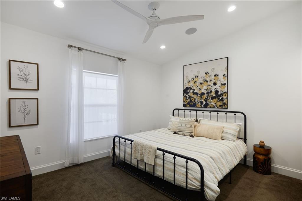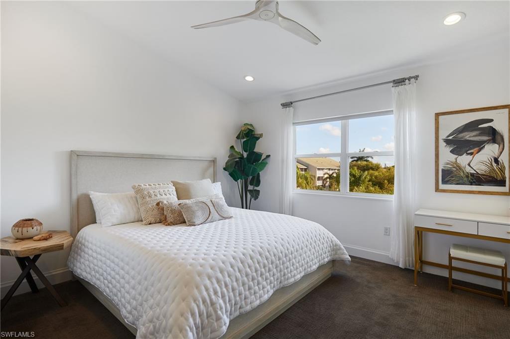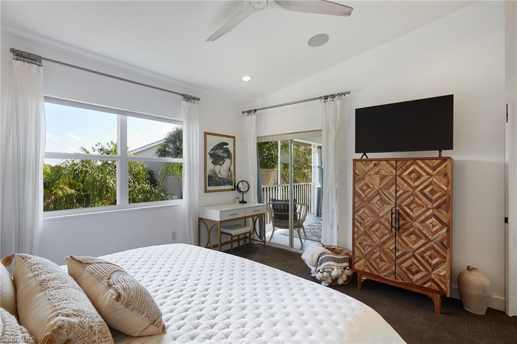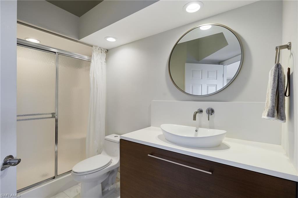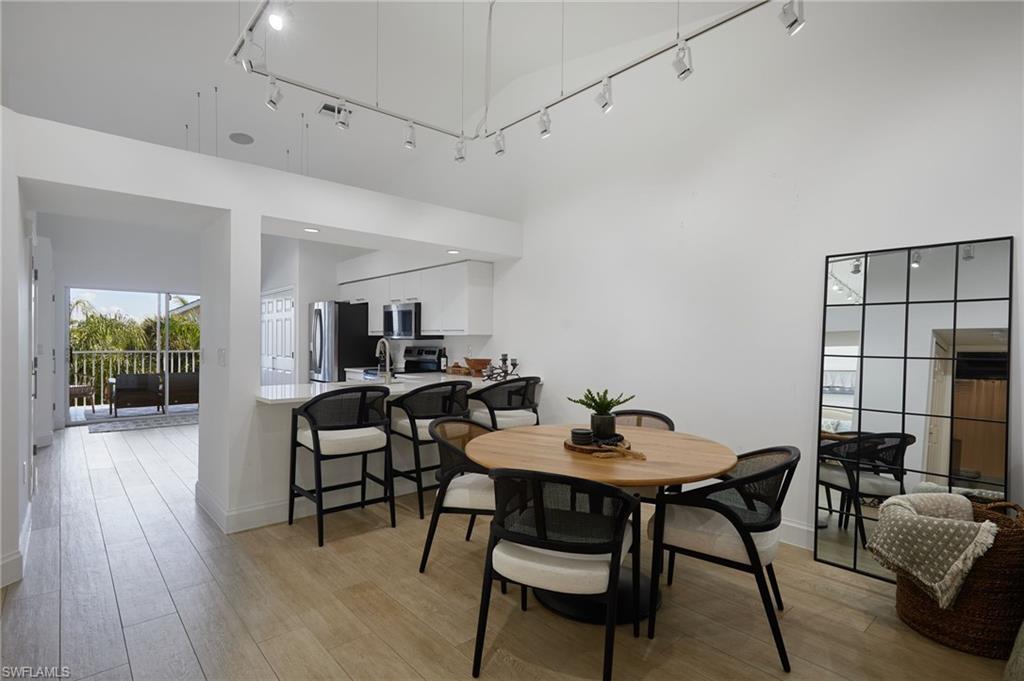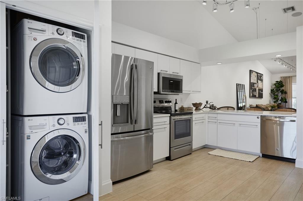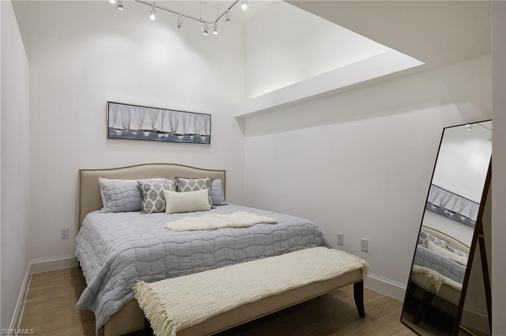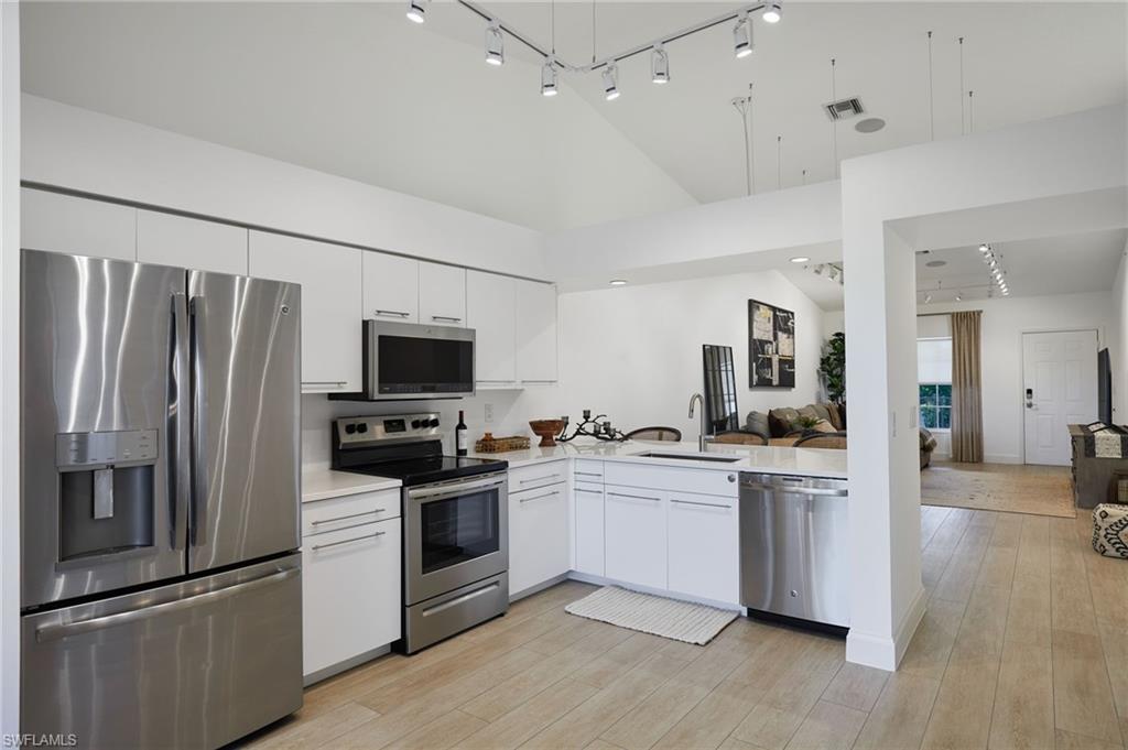 If minimalistic and exquisite live in your design vocabulary, prepare to fall in love. Tucked within a beautifully maintained gated enclave, West of US 41, this rarely available, top-floor 2-bedroom plus den, 2-bath residence with a private 1-car detached garage redefines effortless living. Step inside and feel the space breathe—vaulted ceilings and an open-concept layout invite light to float across your living, dining, and kitchen areas, creating an airy, gallery-like ambiance that welcomes both lively gatherings and peaceful relaxation. The completely reimagined interior boasts timeless design and upscale finishes, starting with “level five” smooth drywall finish that perfectly balances the light from the dimmable gallery-style track lighting, and is outfitted with highly-durable and aesthetically pleasing French Oak wood tile and espresso carpet, with Carrera Marble and Basalt tile flooring in the bathrooms. Your kitchen is designed for both function and connection, featuring quartz countertops, ample cabinet and counter space, a spacious pantry, and a cleverly enclosed coffee bar and custom designed laundry space. The owner’s suite is a spacious retreat, paired with an en-suite bathroom with floating vanities and ample cabinet space, a custom designed walk-in closet, and direct lanai access. The second bedroom and den are both generously sized, allowing you to tailor the home to your lifestyle and your guests’ comfort; while the guest bath makes its own statement of sophistication with a floating vanity and carefully curated lighting. Indoor and outdoor living blend effortlessly through expansive sliding glass doors leading to your private, screened lanai—complete with Sunbrella curtains allowing for complete privacy while relaxing or entertaining. With a new roof (2020), AC (2022), water heater (2024), and epoxy-finished garage flooring, you can embrace peace of mind alongside comfort and style. As a bonus, your garage includes attic storage with pull down steps for easy access. This move-in-ready home offers exceptional value—and can be purchased furnished, allowing you to step into your new lifestyle seamlessly. Schedule your private showing today, and experience what you’ve been dreaming of calling home.
