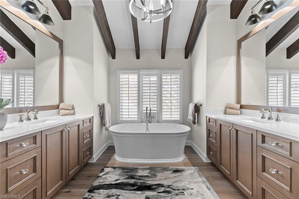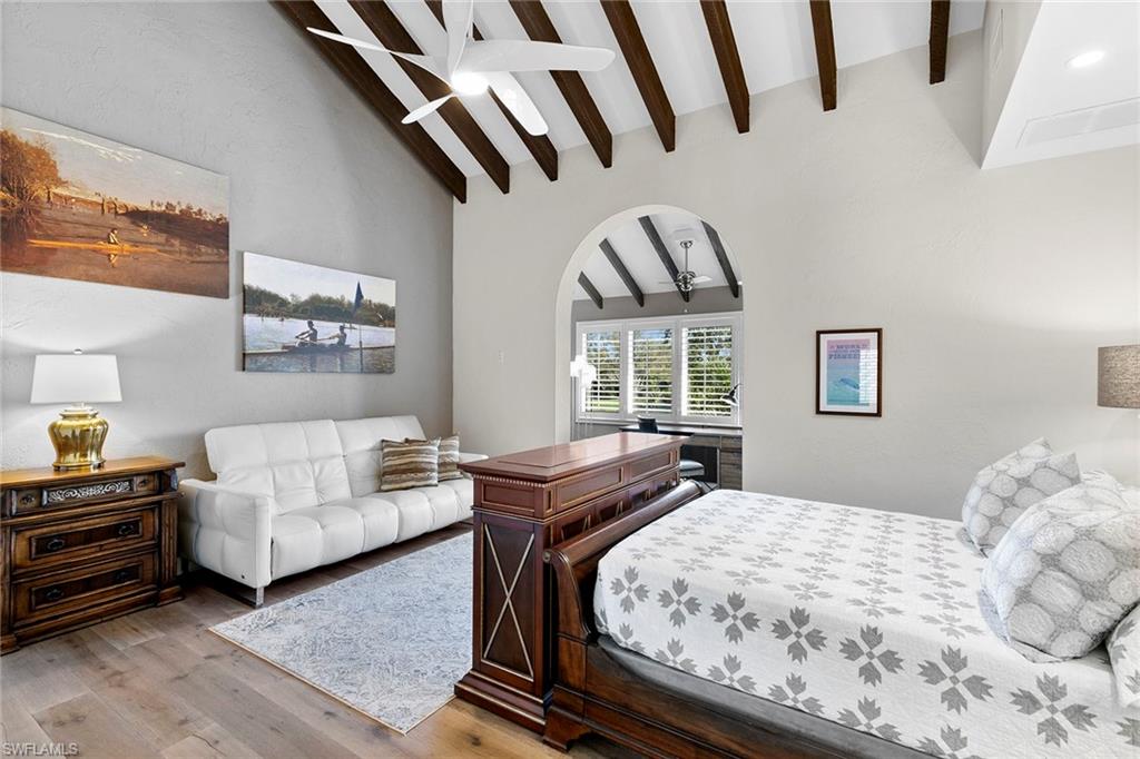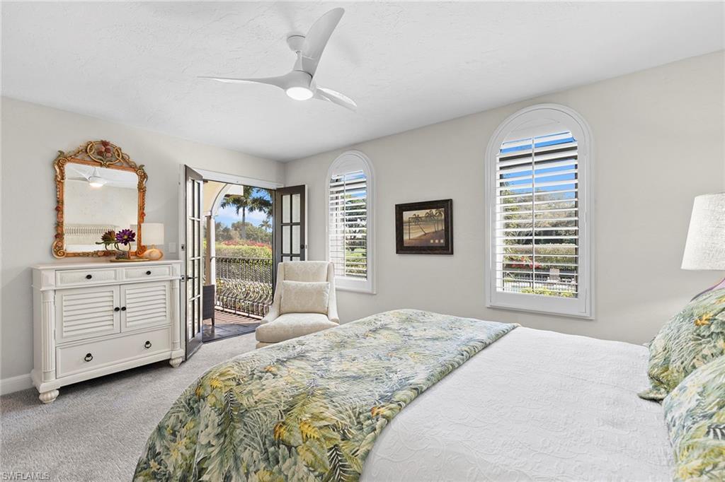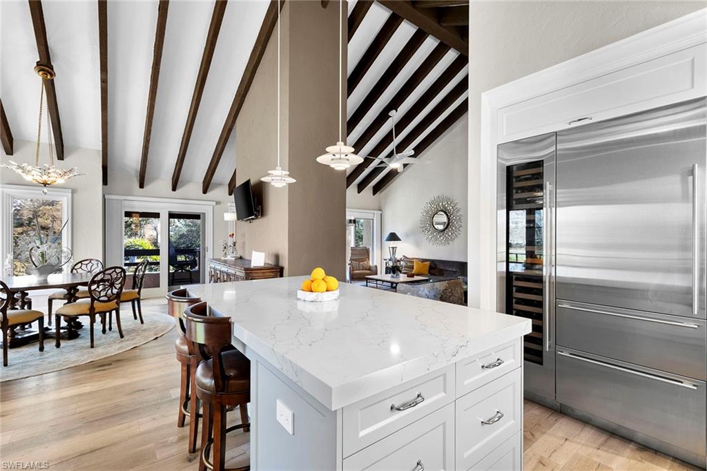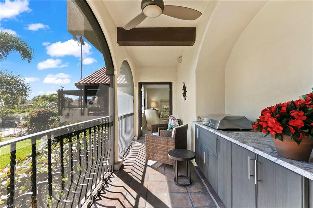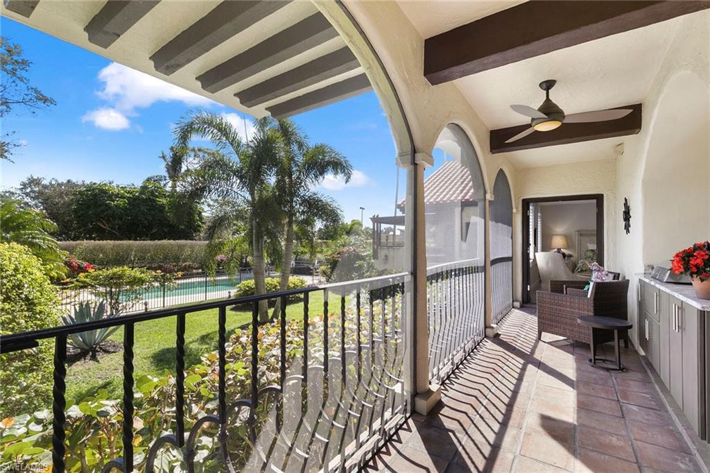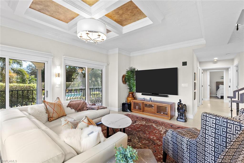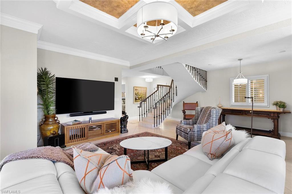 Greet the day with panoramic sunrise views of the Pelican Bay golf course from this expansive four-bedroom, 3.5-bath, two-story residence. In the Renaissance at Pelican Bay, it is the largest of eight architecturally distinct condominiums and features a stunning Spanish Revival style. Spanning 3,318 square feet under air and 3,806 total with two oversized lanais, this residence offers exceptional indoor-outdoor living. Soaring vaulted ceilings with exposed beams, original wood-burning fireplace, and wall-to-wall glass create an open and elevated design. A fully renovated kitchen, positioned adjacent to the outdoor living area, enhances functionality and entertaining. The primary suite on the main level boasts serene views and a spa-inspired bath. Three guest bedrooms and a media room are privately on the lower level with garden views and wrap-around lanai. The thoughtful layout provides flexibility and comfort, making it ideal for hosting friends, family and extended guests. Additional highlights include two garage spaces and an oversized storage room. The Renaissance is a dog-friendly community. In short distance to Artis—Naples and Waterside Shops, this residence combines refined architecture with access to world-class shopping, dining and entertainment.
