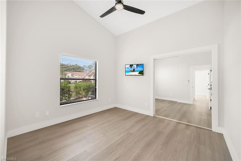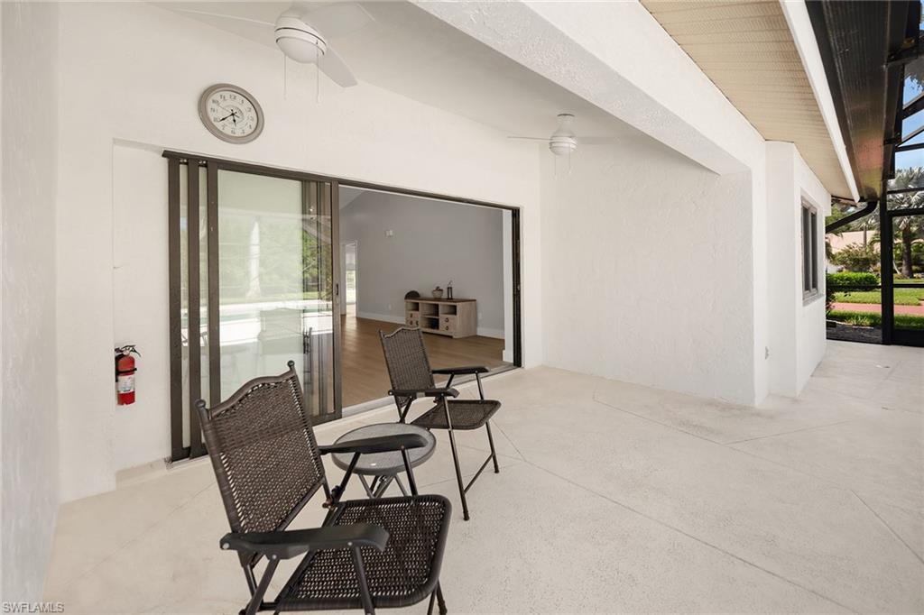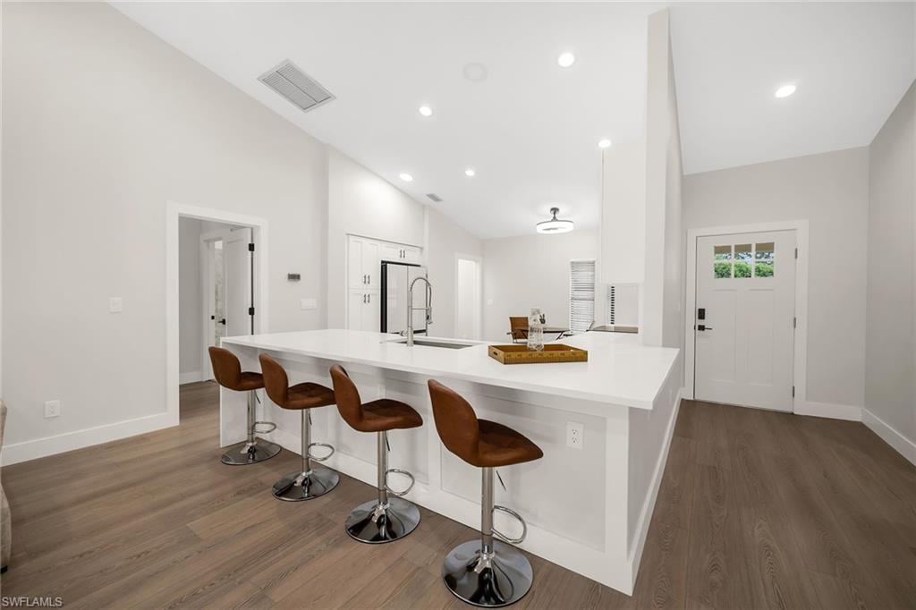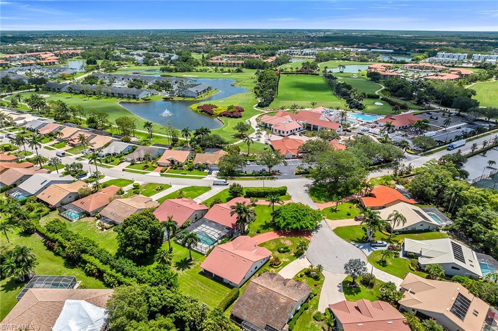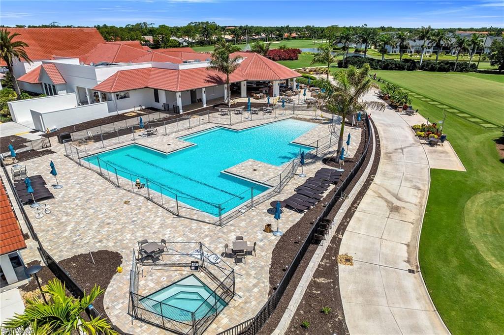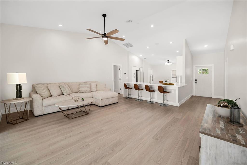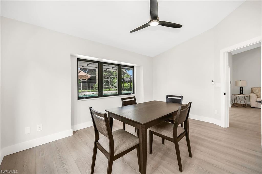 Looking for a nicely updated pool home with bundled golf and one of the best locations in Countryside? This beautifully updated four-bedroom, two-bath residence is directly across the street from the newly renovated clubhouse, offering unmatched convenience to golf, tennis, dining and all the club’s resort-style amenities. On a quiet cul-de-sac with private garden views and desirable western exposure, this light-filled home is move-in ready and ideal for year-round or seasonal living. Go inside to cathedral ceilings and luxurious vinyl plank flooring throughout, creating a modern and cohesive flow. The open kitchen features white shaker-style cabinetry, quartz countertops, bar seating, recessed lighting and high-end appliances, including a range with hood, under-counter microwave, refrigerator/freezer and dishwasher. The kitchen features a cozy breakfast nook by three windows, filling the space with natural light and charming garden views. The open layout flows seamlessly into the spacious living room, which opens through glass sliders to the screened lanai, ideal for enjoying private garden views and peaceful western sunsets. The outdoor living area is wonderful for entertaining, with a covered space featuring dual ceiling fans and a sparkling pool for enjoying Florida’s warm weather in comfort and style. The owner’s suite offers a peaceful retreat with a spacious flex area for a reading nook, home office or private lounge. It also features a walk-in closet with built-in shelving and a spa-inspired en-suite bath with a dual quartz vanity and a walk-in shower adorned with large porcelain tile. One guest bedroom overlooks the lanai, while two additional guest rooms share a beautifully appointed bath with a frameless glass walk-in shower. Countryside Golf & Country Club offers full golf membership with this home and an incredible social lifestyle, all just minutes from Naples white sandy beaches, shopping, dining and major roadways. With a freshly completed clubhouse renovation that includes indoor and outdoor dining, a resort-style pool, tennis, pickleball, fitness center and an active social calendar, this is your opportunity to live the ultimate Naples golf lifestyle in a prime location.