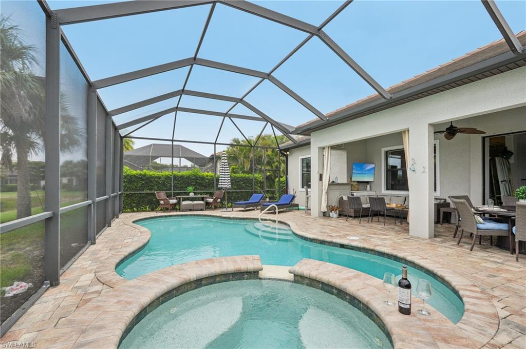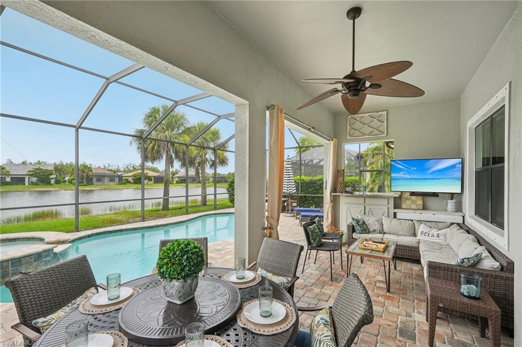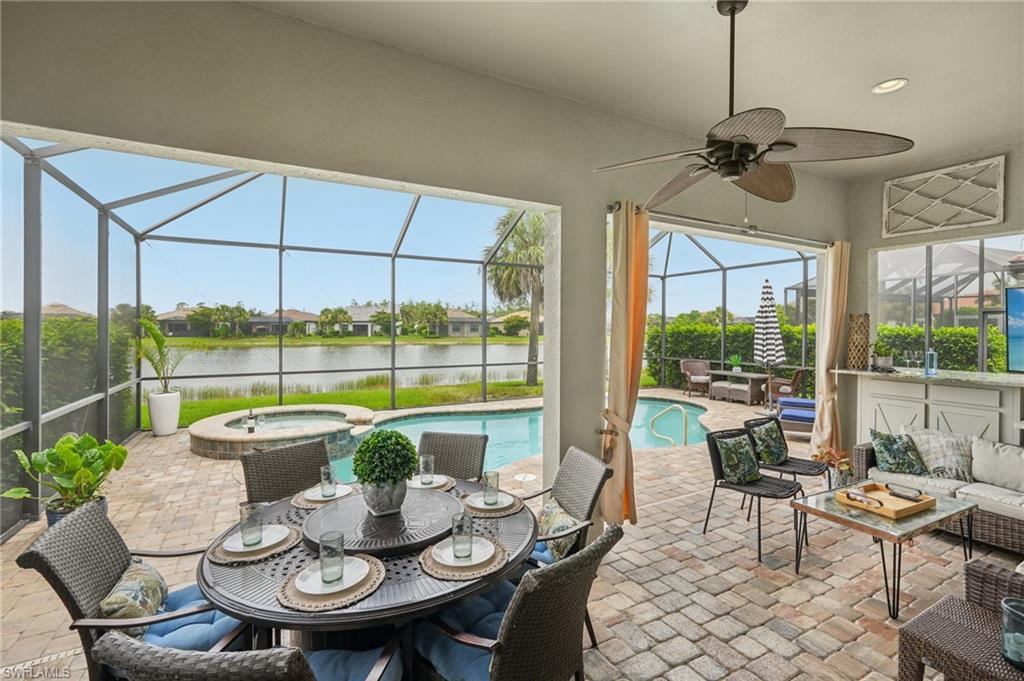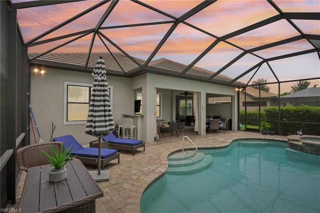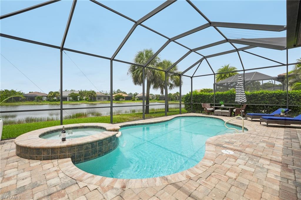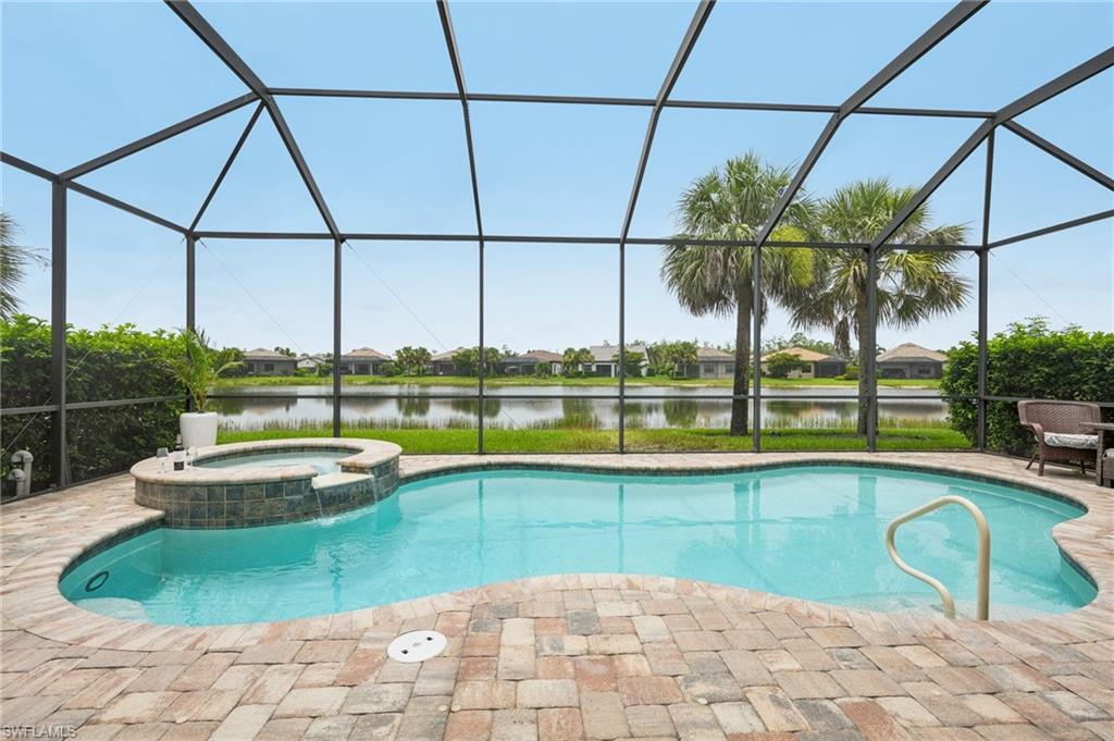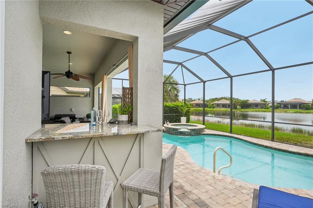 POOL+SPA HOME ON THE WATER in the resort-style community of Corkscrew Shores! This outdoor oasis home offers 3 bedrooms and a den, 2 full bathrooms. Sliding doors completely open for a total indoor/outdoor flow between main living area and outdoor oasis with bar, multiple entertainment/seating areas, and a covered+screened in patio with SALTWATER POOL+SPA. Outdoor oasis overlooks LAKE and has gorgeous sunsets! Inside, the open kitchen features quartz countertops, real-wood soft-close cabinetry, and top-of-the-line appliances. The main living areas have tile floors for easy maintenance. Upgrades include: whole home reverse osmosis water filtration system, air-conditioned garage, and custom built-ins throughout. NO FLOOD ZONE, NO CDD. Corkscrew Shores is a gated resort-style community, offering a luxurious pool/spa, Har-Tru tennis courts, pickleball courts, 24-hour fitness center, non-gas boating, kayak/canoe launch, playground, and indoor/outdoor restaurant and bar. The community is ideally situated near RSW international airport, FGCU, expansive shopping, and impressive dining.