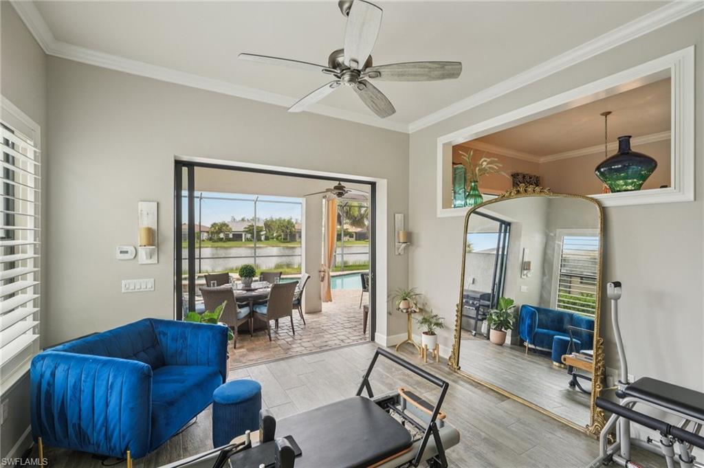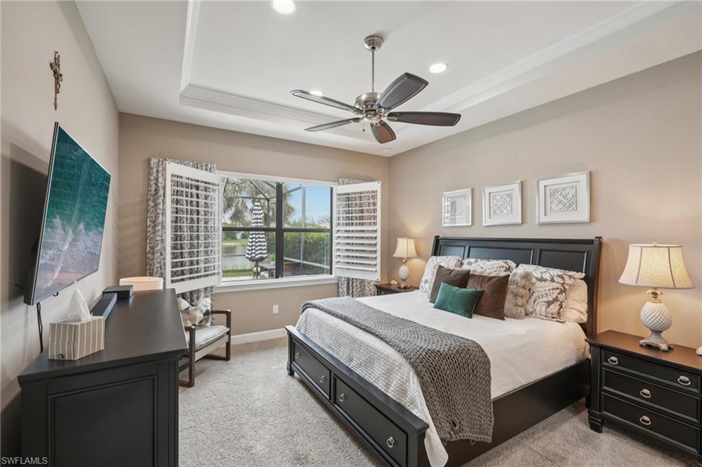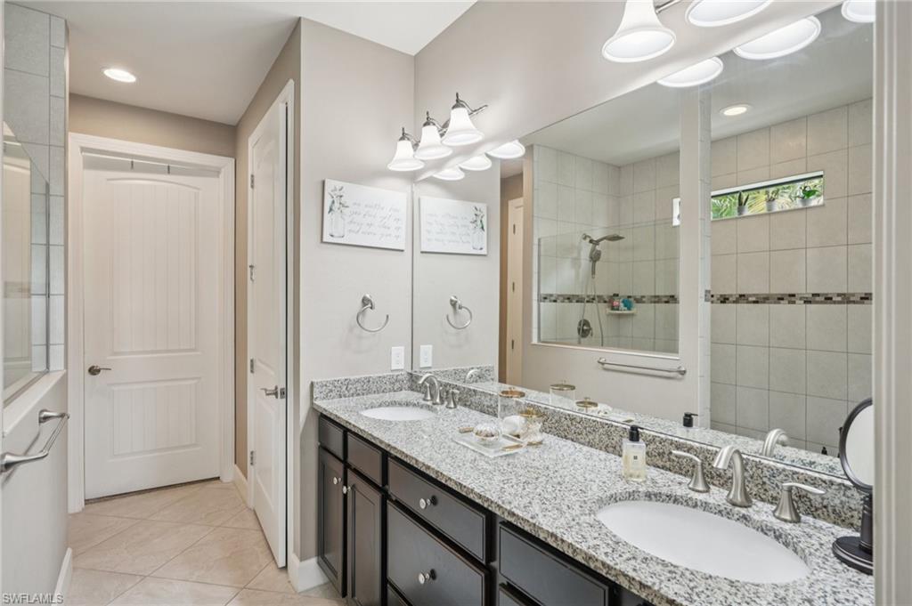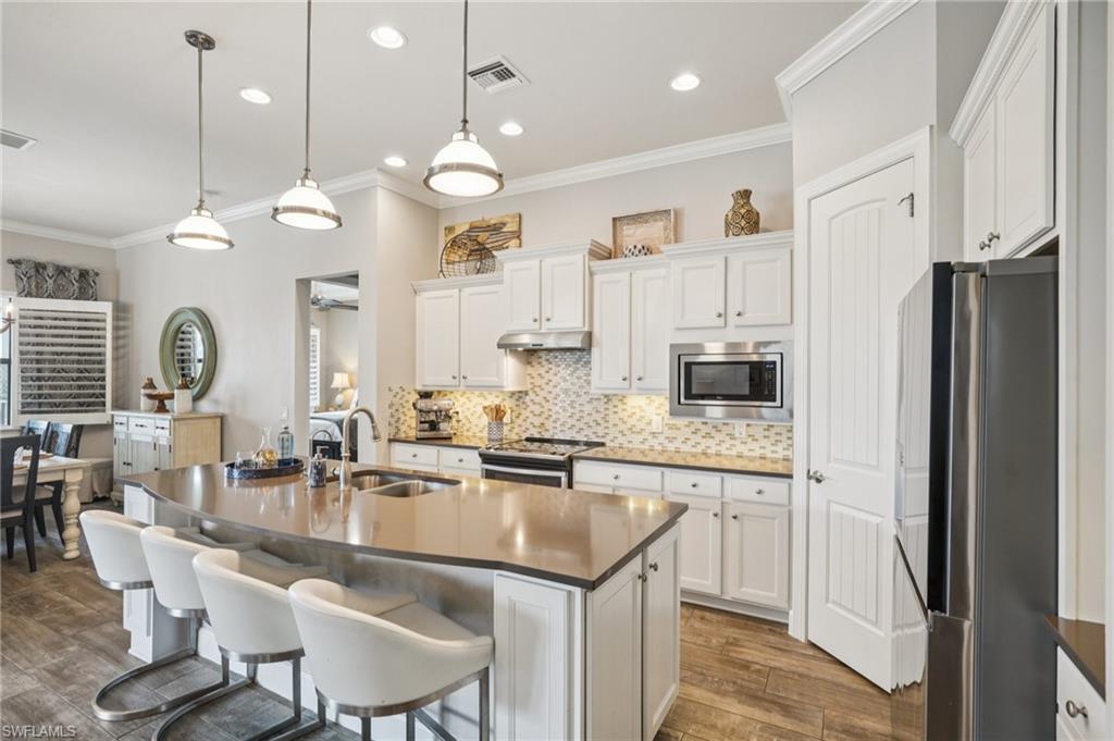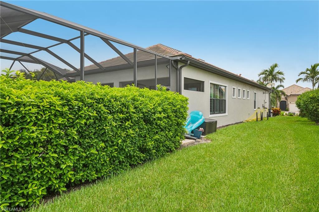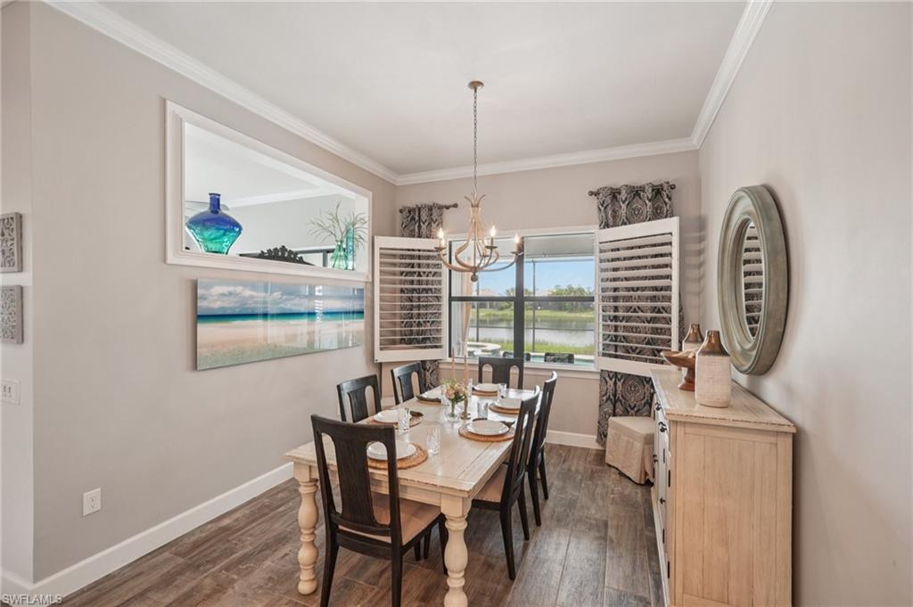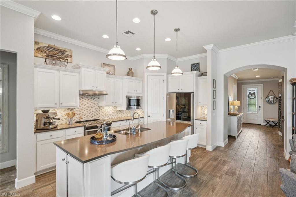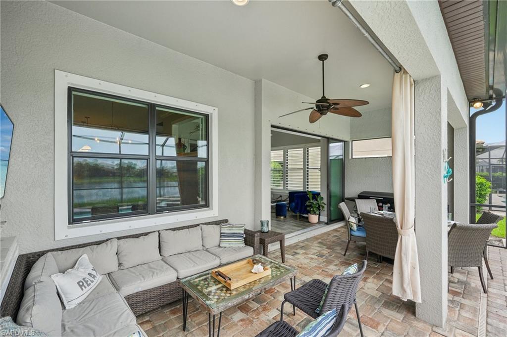 POOL+SPA HOME ON THE WATER in the resort-style community of Corkscrew Shores! This outdoor oasis home offers 3 bedrooms and a den, 2 full bathrooms. Sliding doors completely open for a total indoor/outdoor flow between main living area and outdoor oasis with bar, multiple entertainment/seating areas, and a covered+screened in patio with SALTWATER POOL+SPA. Outdoor oasis overlooks LAKE and has gorgeous sunsets! Inside, the open kitchen features quartz countertops, real-wood soft-close cabinetry, and top-of-the-line appliances. The main living areas have tile floors for easy maintenance. Upgrades include: whole home reverse osmosis water filtration system, air-conditioned garage, and custom built-ins throughout. NO FLOOD ZONE, NO CDD. Corkscrew Shores is a gated resort-style community, offering a luxurious pool/spa, Har-Tru tennis courts, pickleball courts, 24-hour fitness center, non-gas boating, kayak/canoe launch, playground, and indoor/outdoor restaurant and bar. The community is ideally situated near RSW international airport, FGCU, expansive shopping, and impressive dining.
